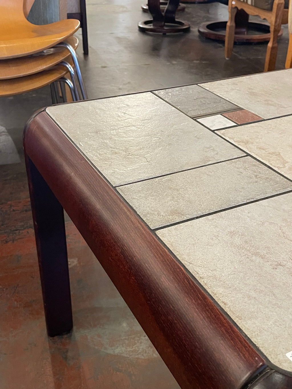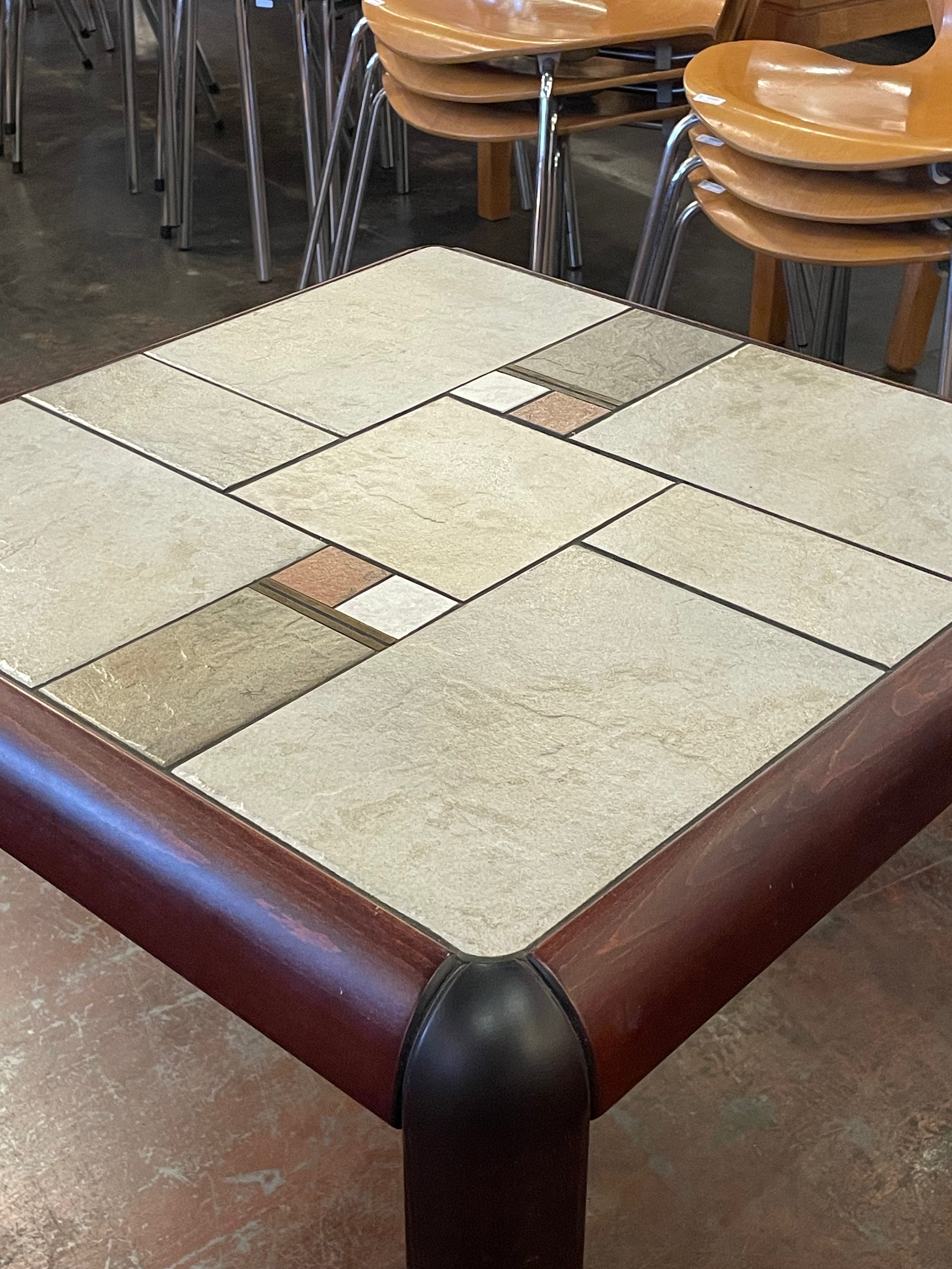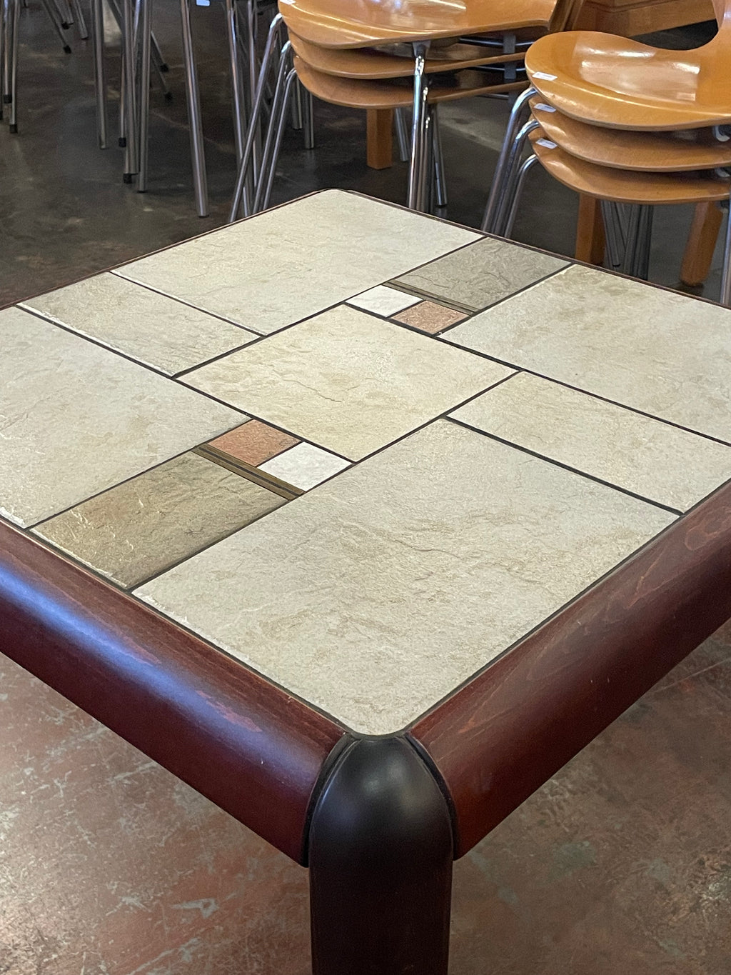 天板には、ダークフレームと対照的な淡い色調の幾何学タイルがはめ込まれ、熱や水に強く実用性を兼ね備えています。