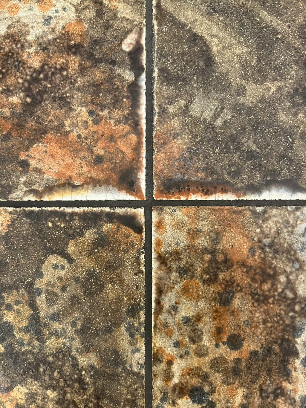 中央に大胆な円形の抽象柄が描かれたタイルを6枚組み合わせており、まるで地層や化石のような、力強くアーティスティックな表情が魅力です。
