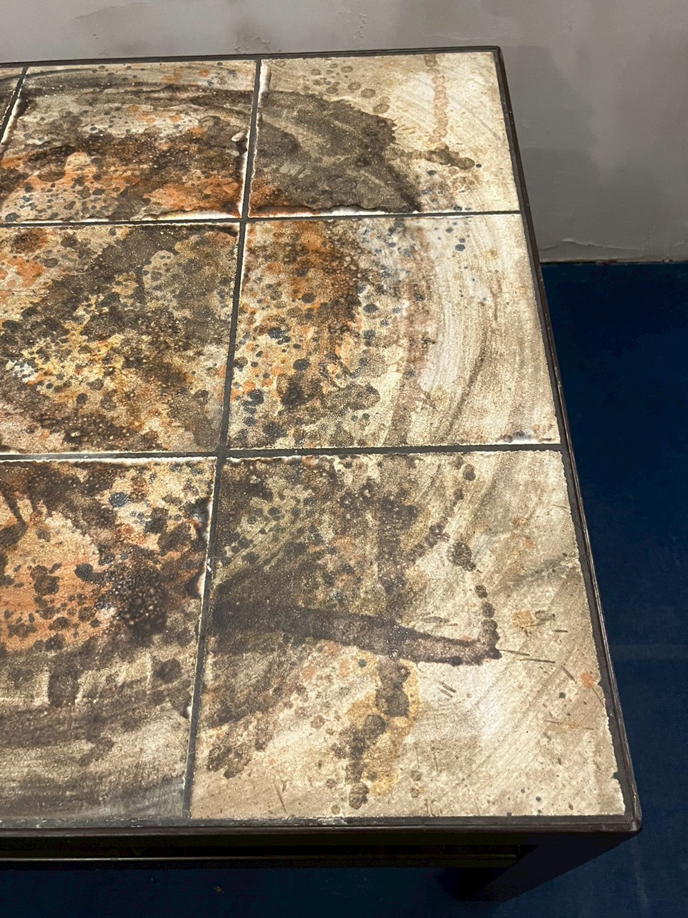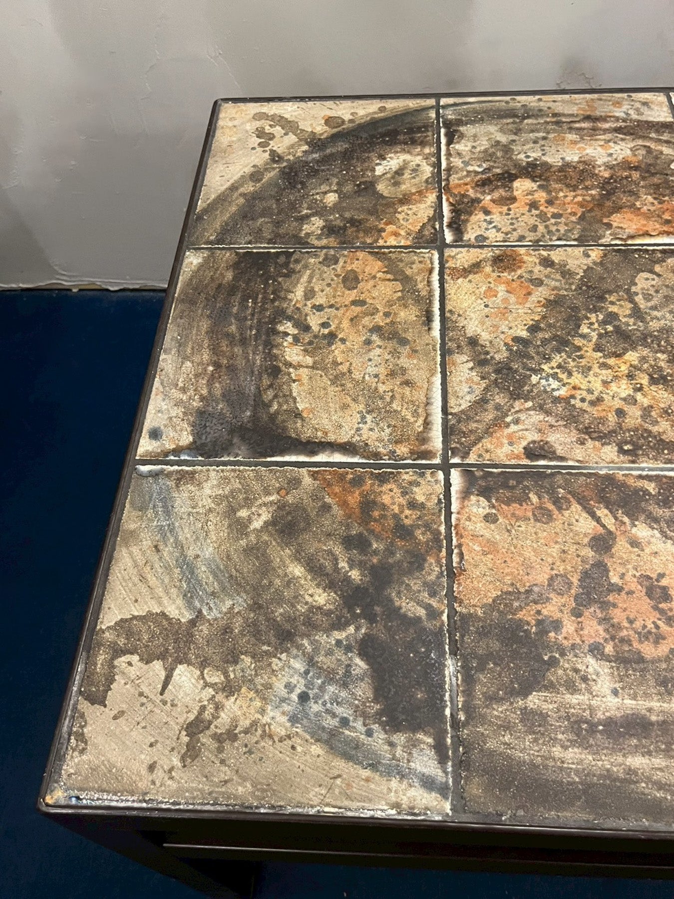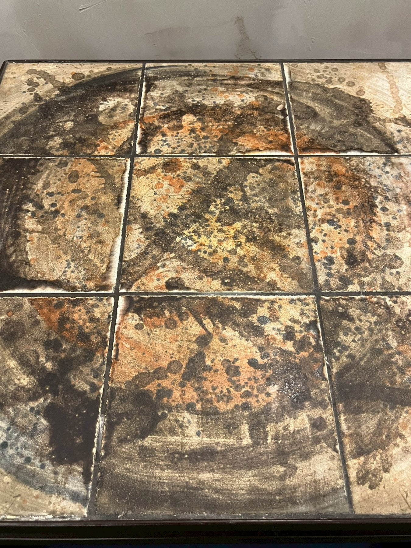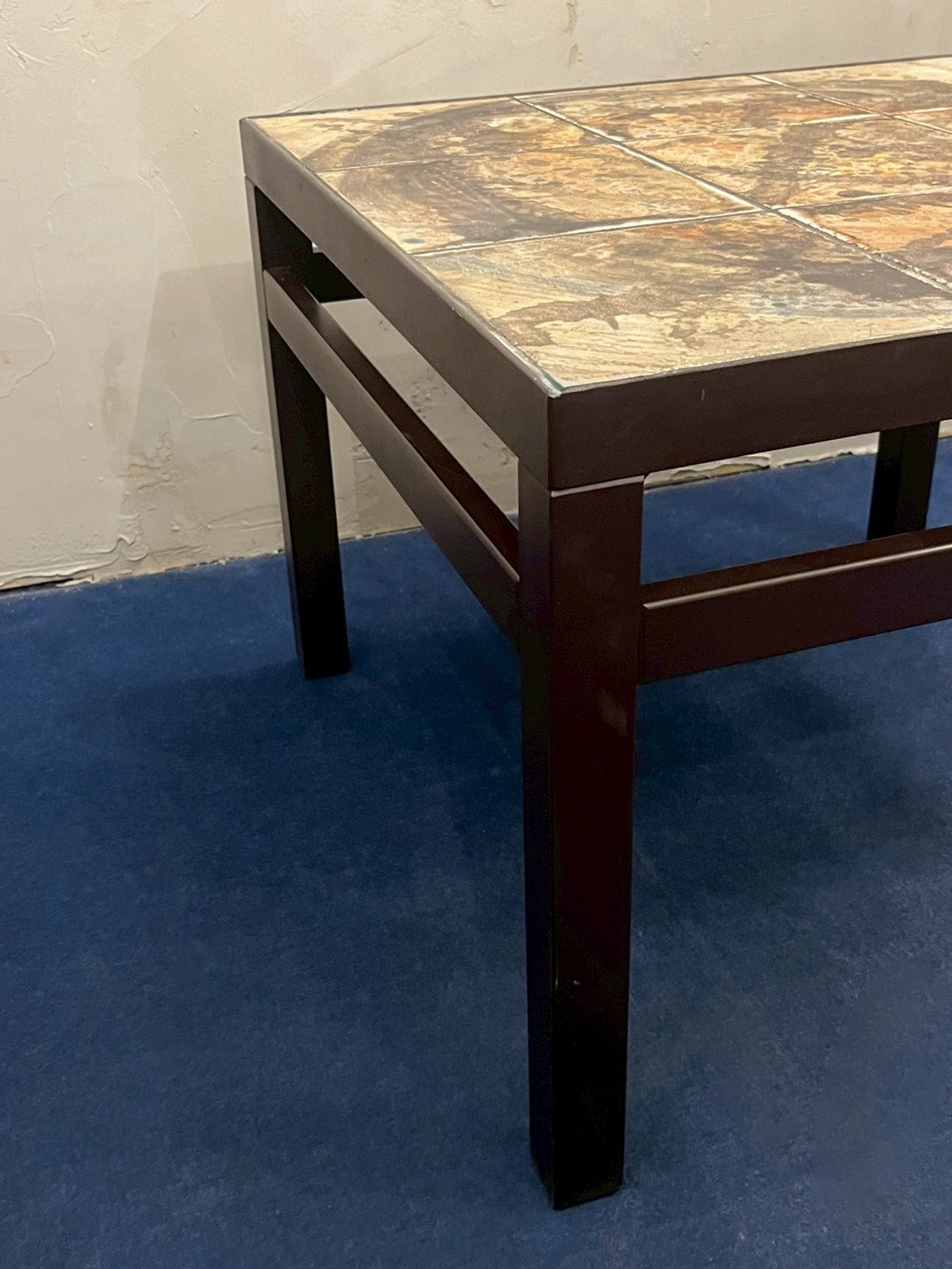 細く引き締まったアイアン製のフレームが、タイル天板の重厚さを引き立てながらも、全体をモダンで軽快な印象にまとめています。リビングのコーヒーテーブルとして、またはソファサイドのアクセントとして、お部屋の主役となるインテリアをお探しの方におすすめの一点です。