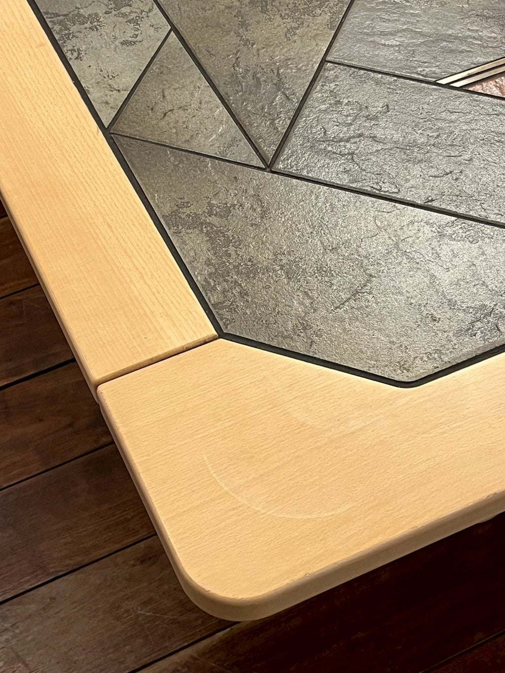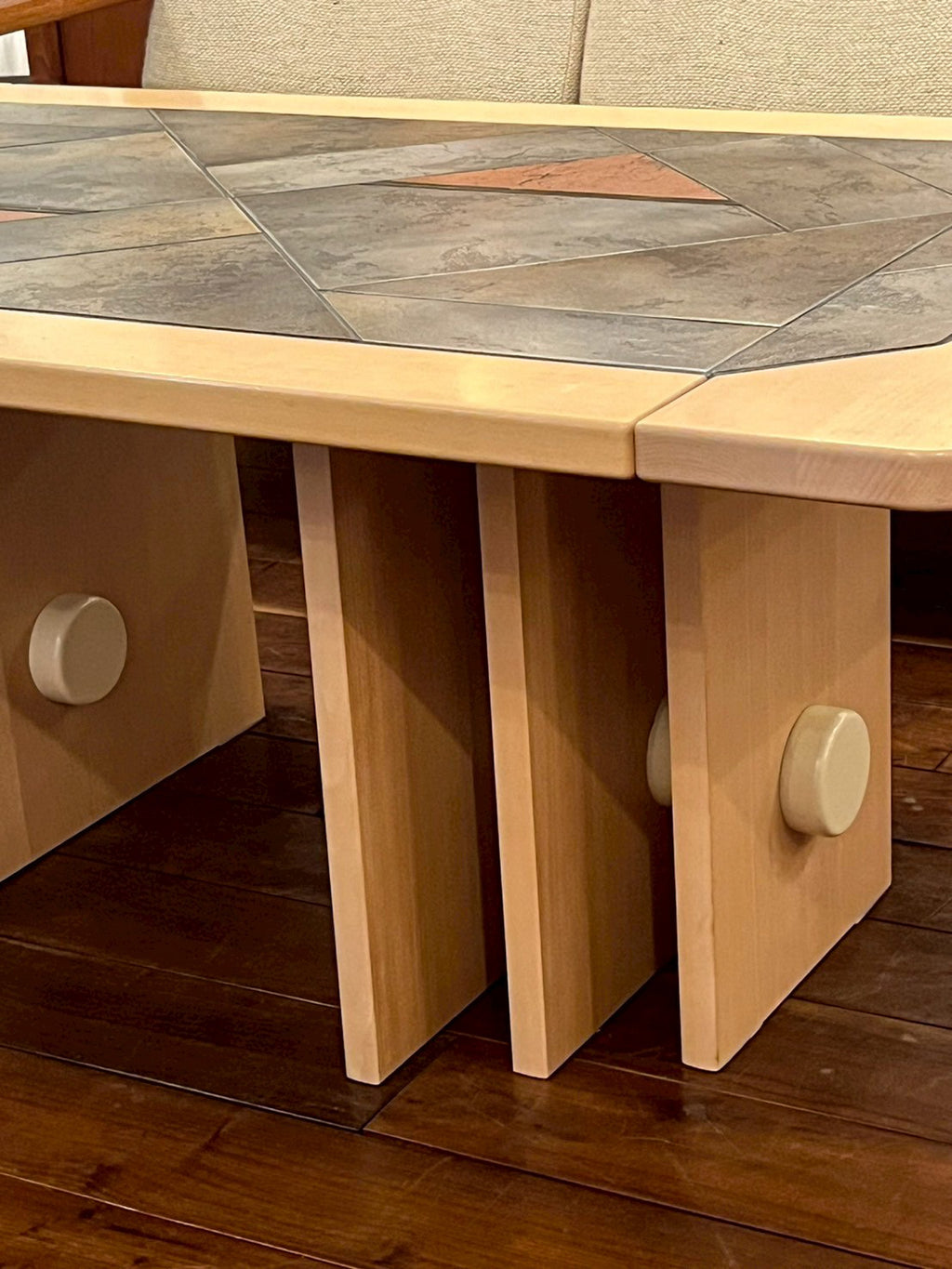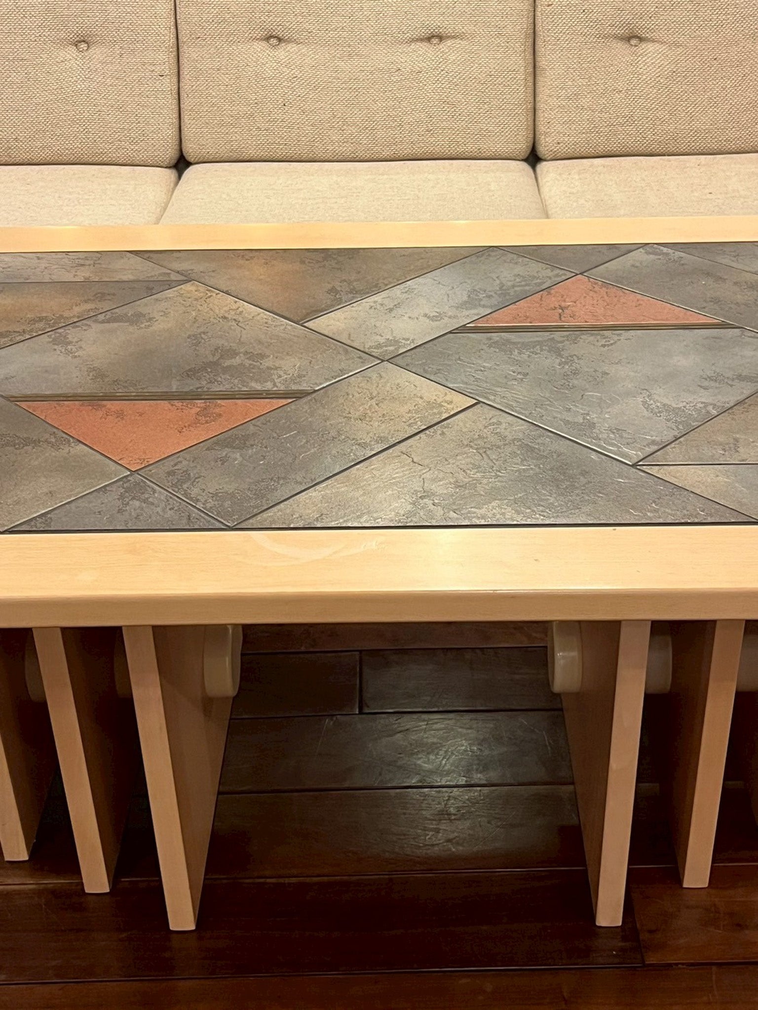 明るいトーンのウッドフレームと、グレーやテラコッタ系の色味が幾何学的に配されたタイルトップデザインのコーヒーテーブル。