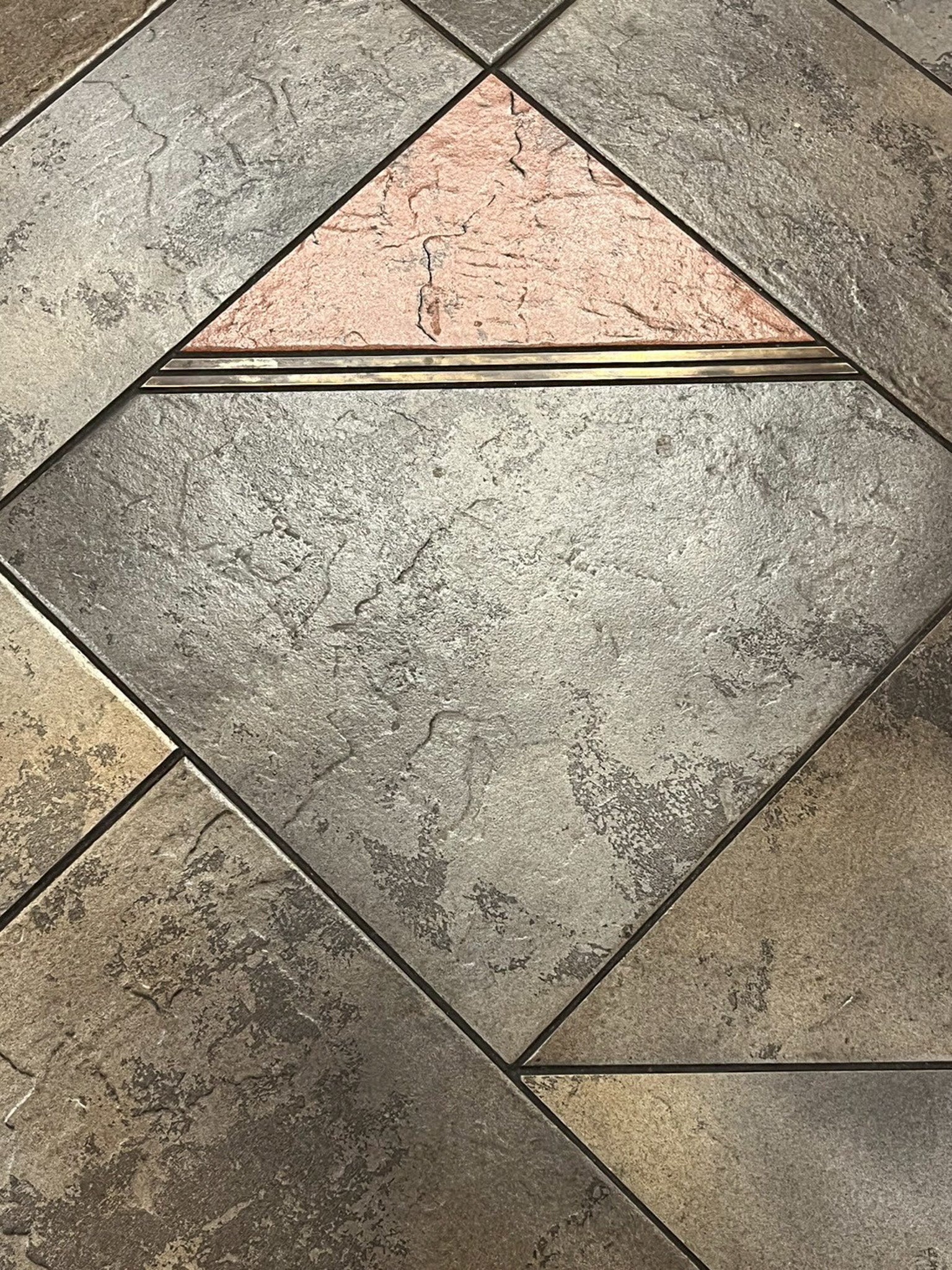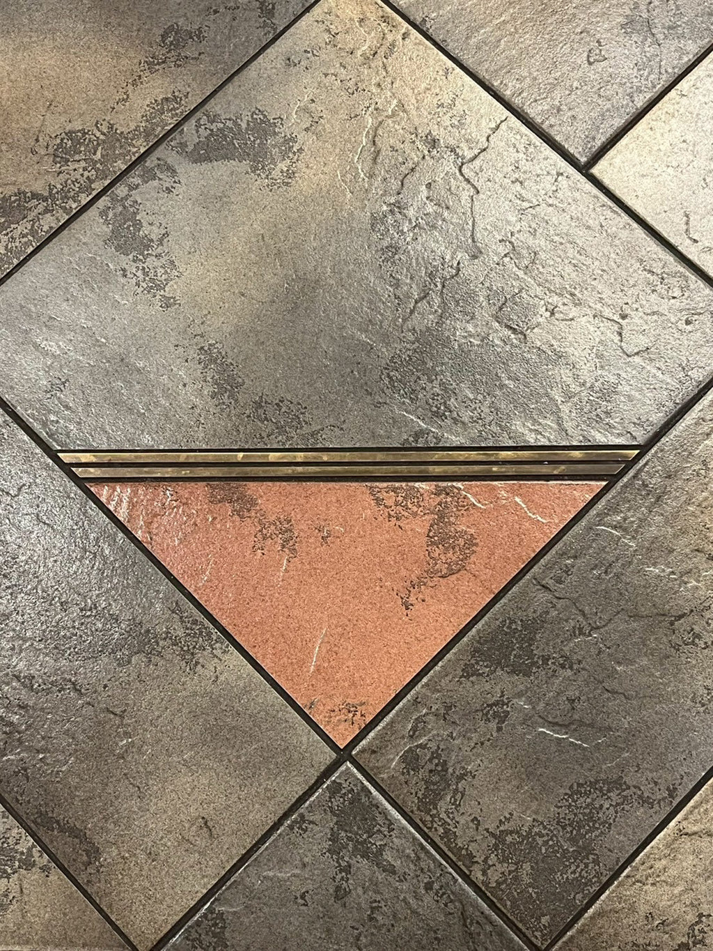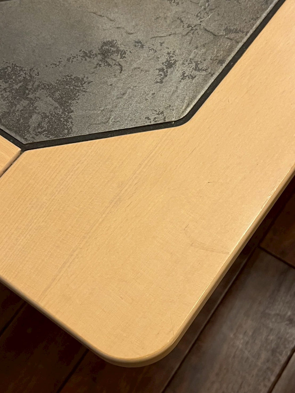 明るいトーンのウッドフレームと、グレーやテラコッタ系の色味が幾何学的に配されたタイルトップデザインのコーヒーテーブル。