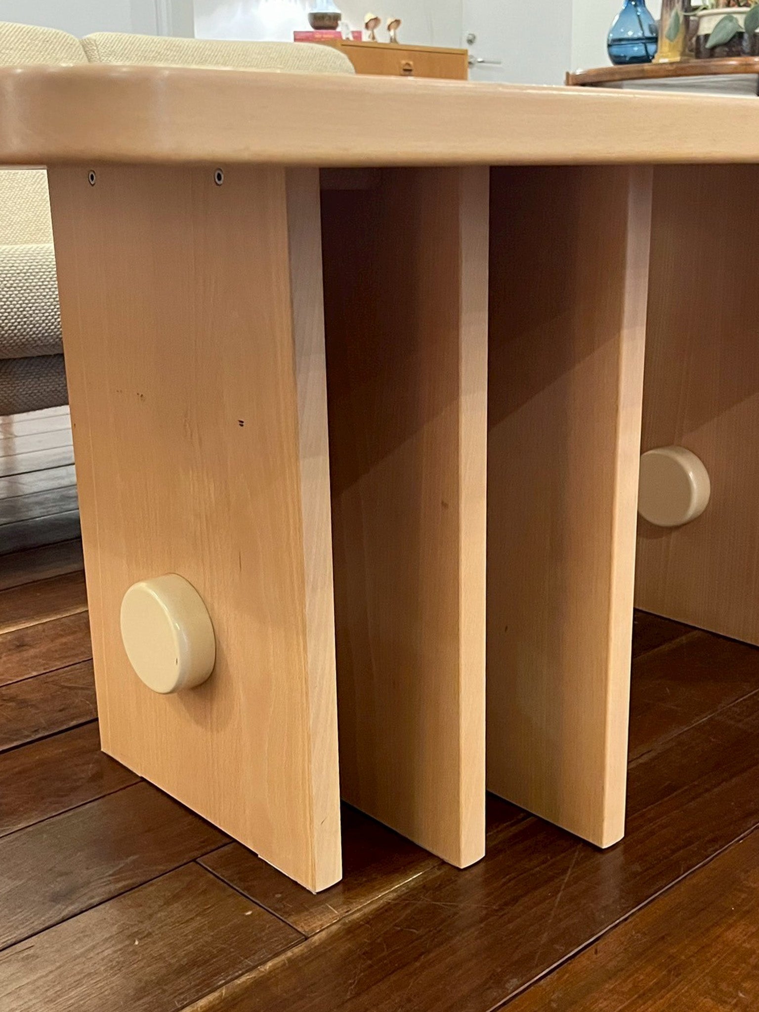 垂直に並べられた板材を円形パーツで固定したユニークで安定感のある脚部も特徴的で、機能性とアート性を兼ね備えた一点です。
