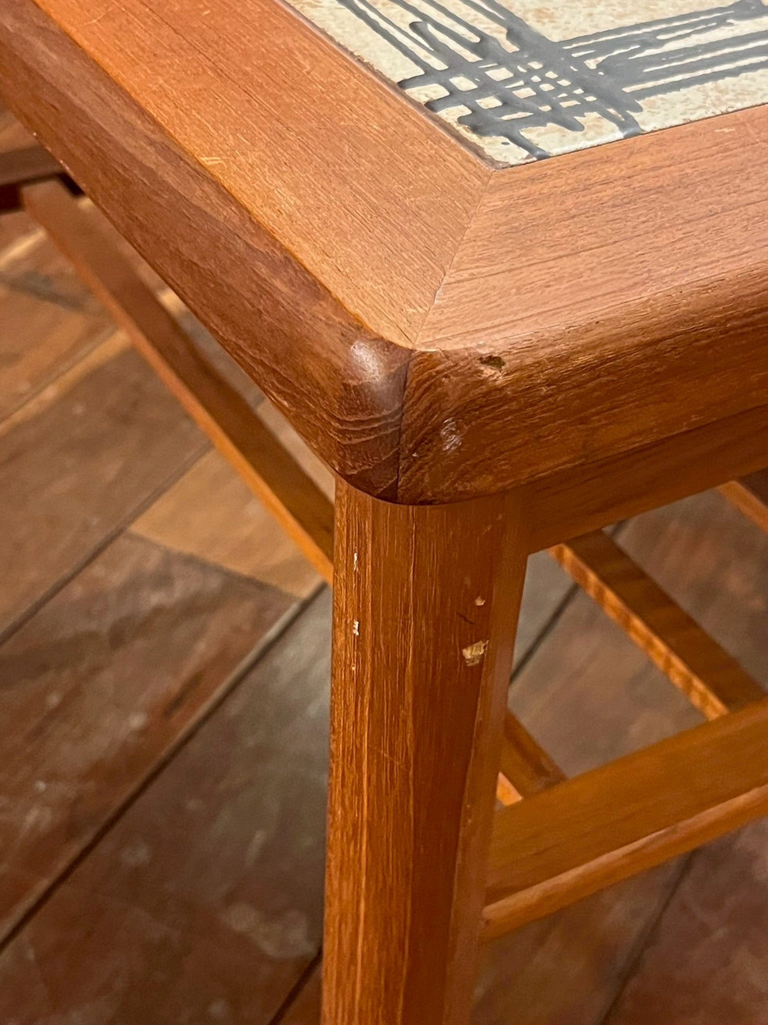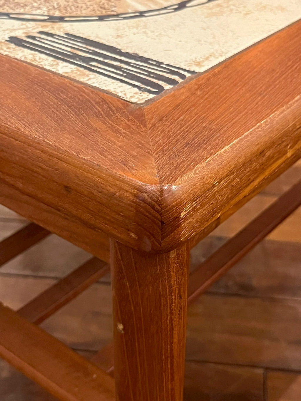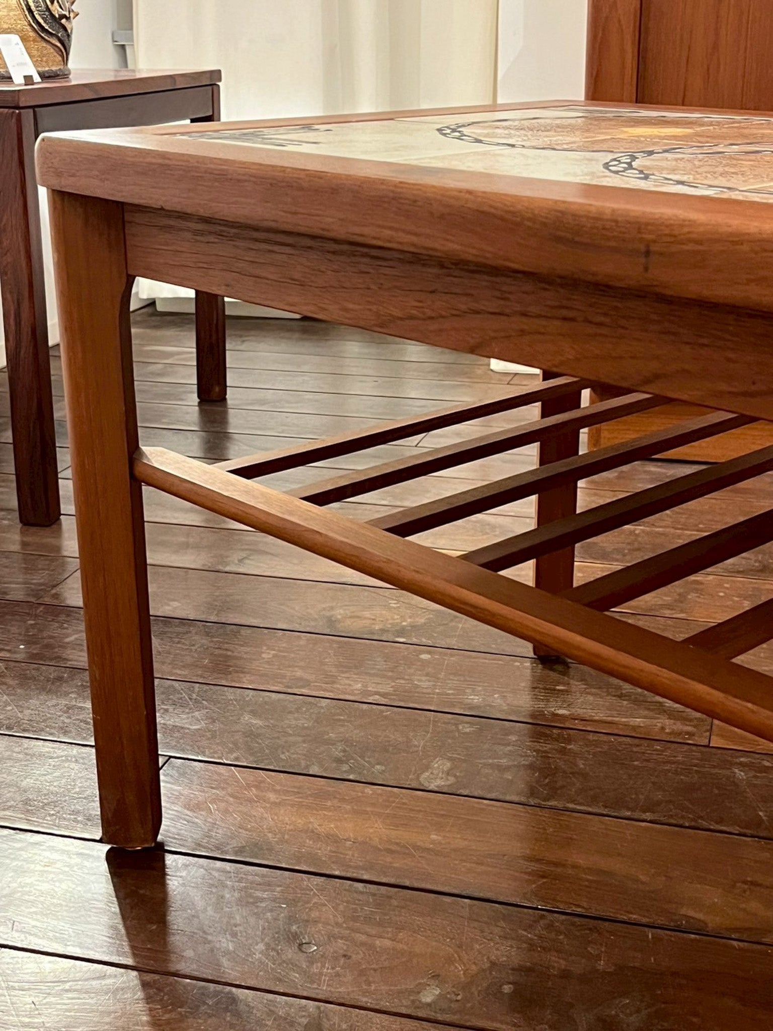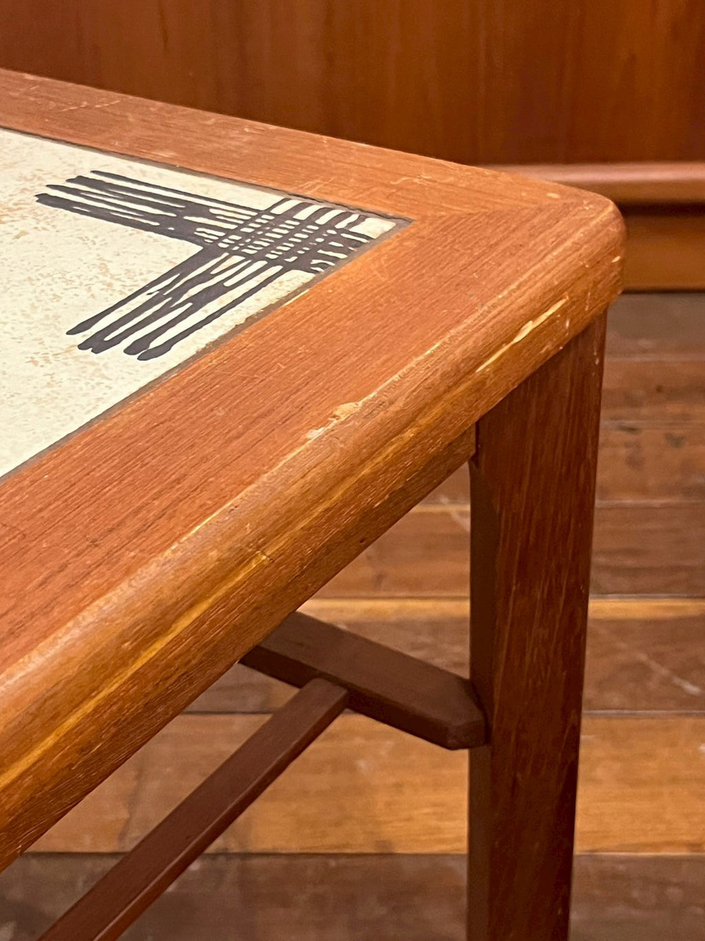 天板を彩る印象的なタイルは、陶芸家 Paul Hermann Poulsen のデザインで、タイル端には彼のサインが刻印されています。円を重ねた幾何学的なパターンと、四隅に配された繊細なラインが特徴的で、チーク材の温もりと絶妙なコントラストを生み出しています。