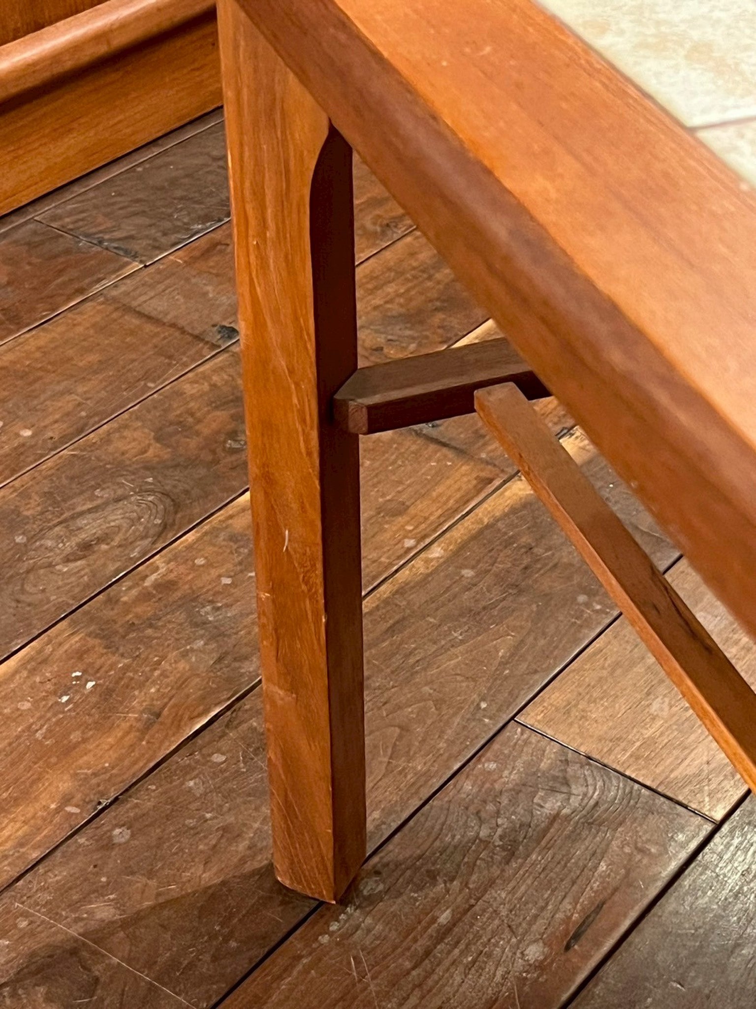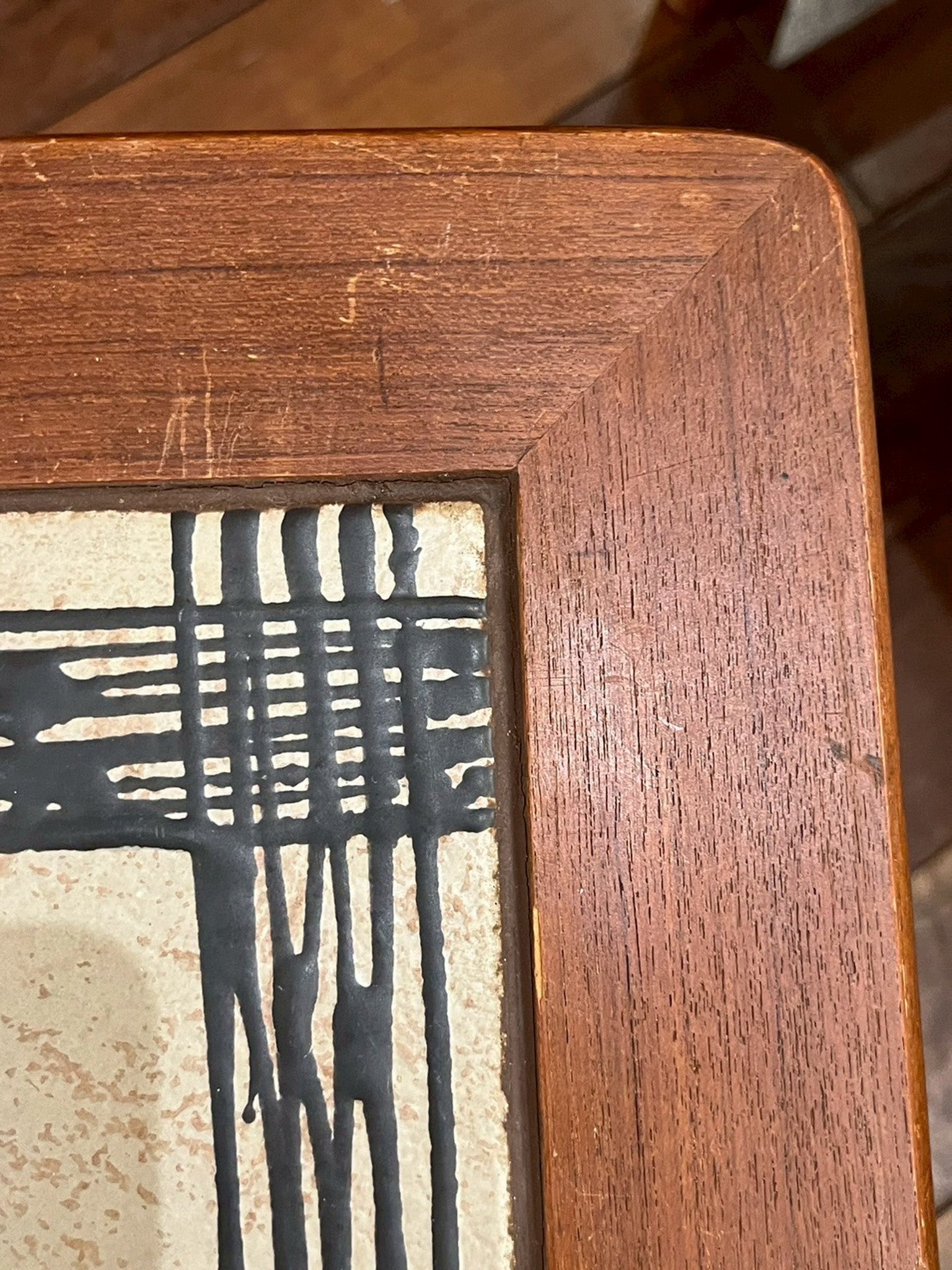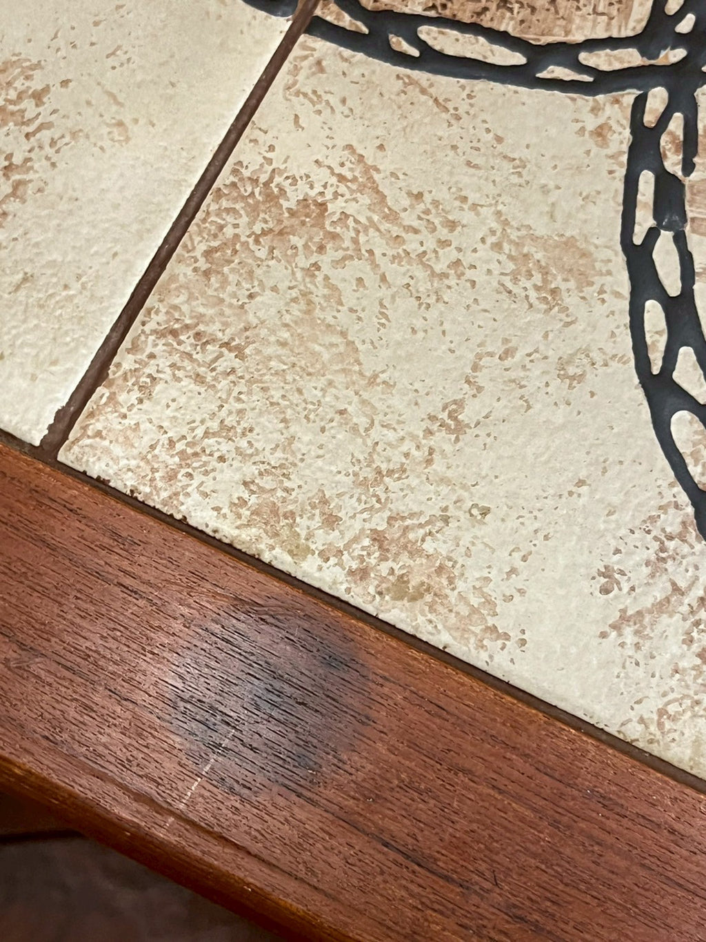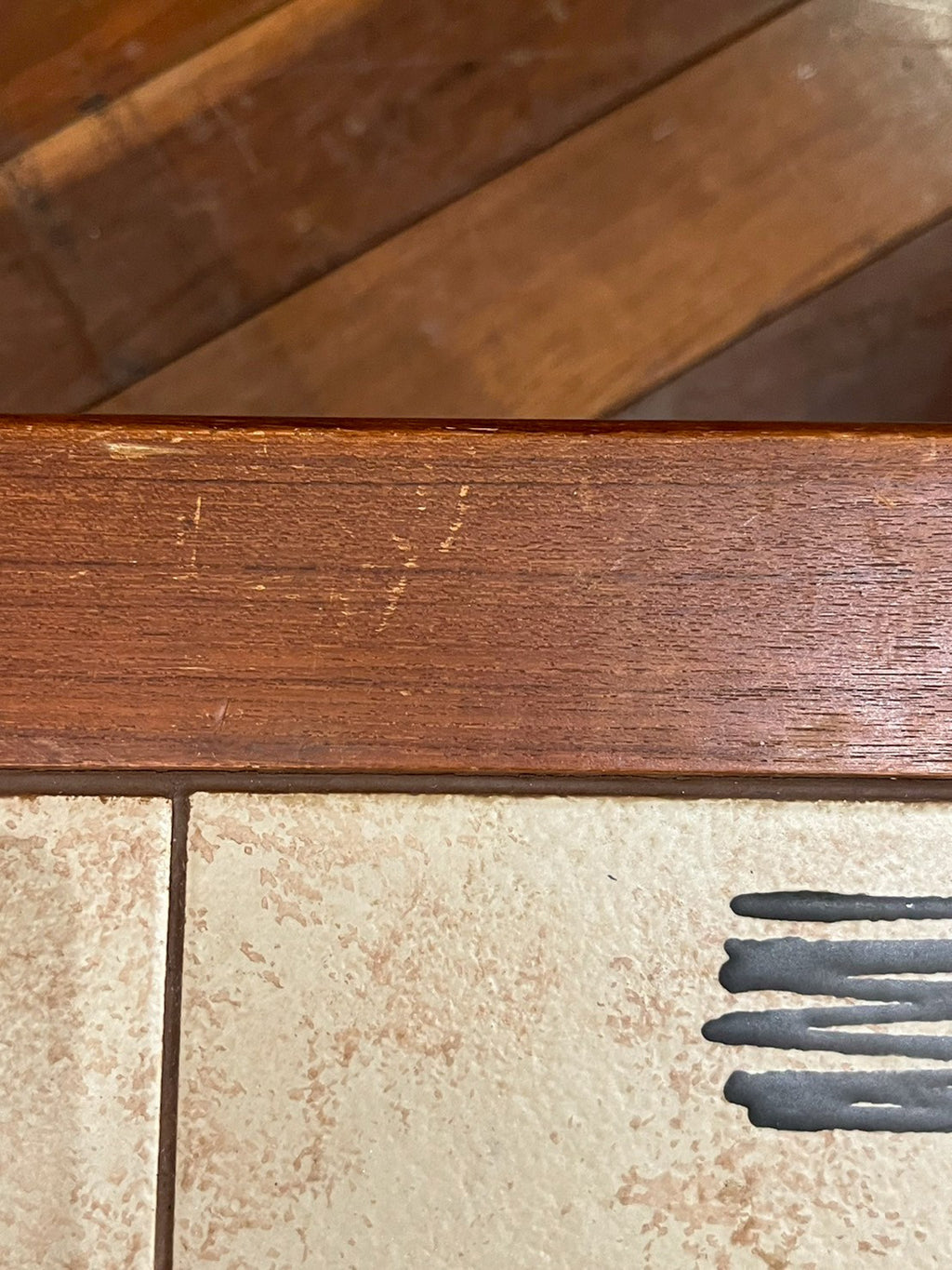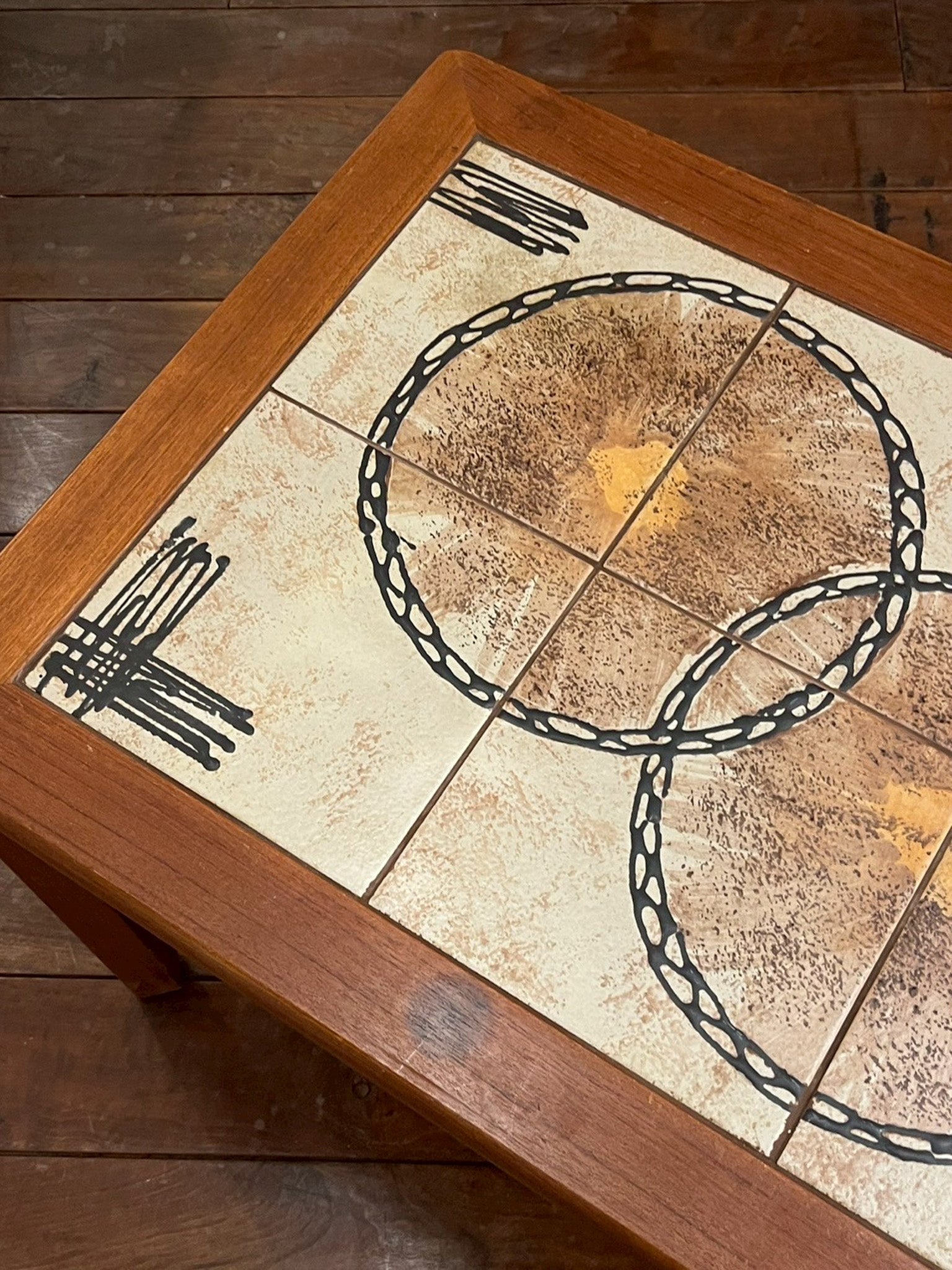 天板を彩る印象的なタイルは、陶芸家 Paul Hermann Poulsen のデザインで、タイル端には彼のサインが刻印されています。円を重ねた幾何学的なパターンと、四隅に配された繊細なラインが特徴的で、チーク材の温もりと絶妙なコントラストを生み出しています。