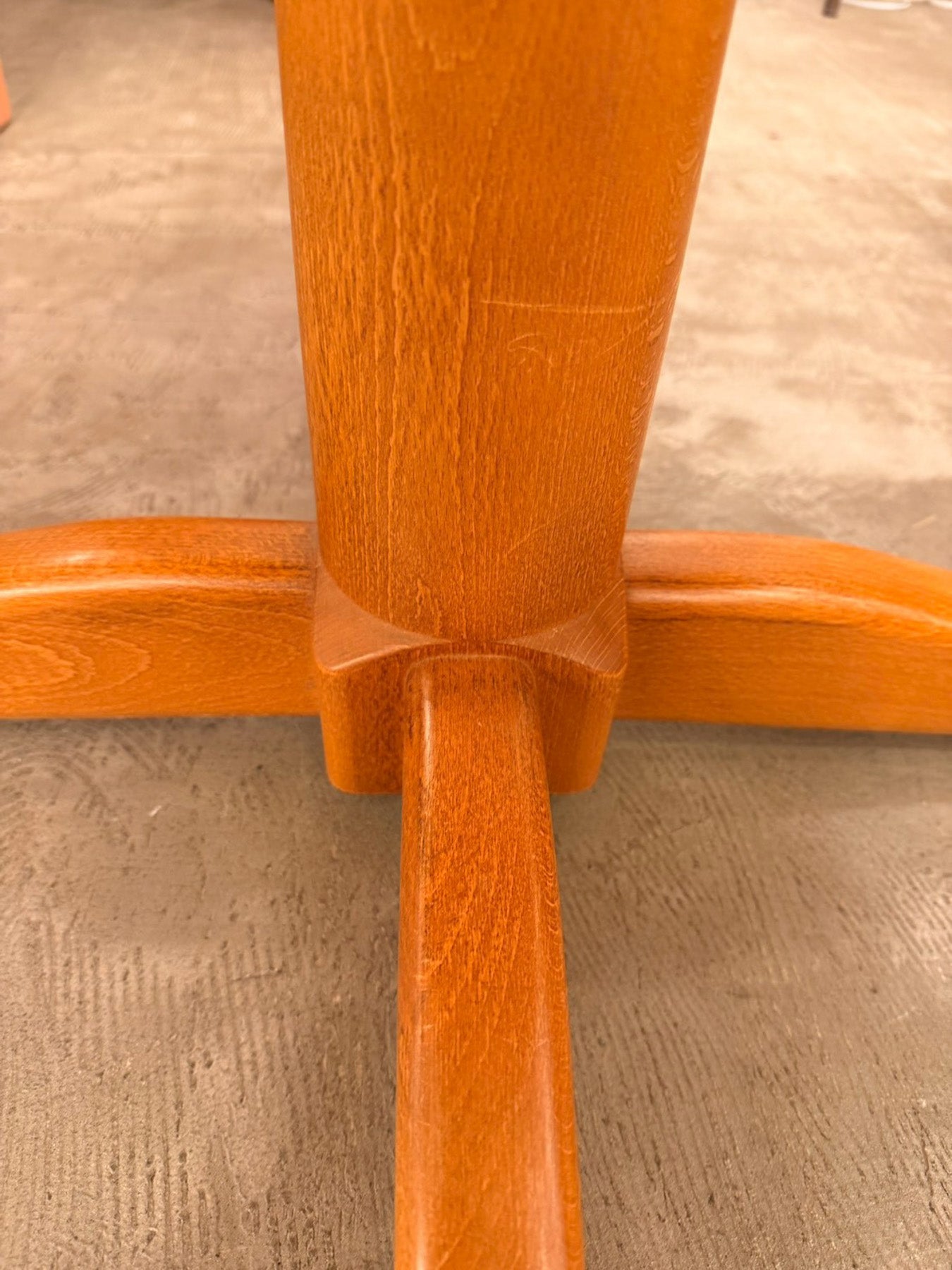 脚部は中央の支柱から四方に広がる4本脚ベース構造。安定感があり、椅子の出入りもしやすい設計です。直線と緩やかなカーブを組み合わせたフォルムが、クラシックすぎず、モダンすぎない絶妙なバランスを生み出しています。