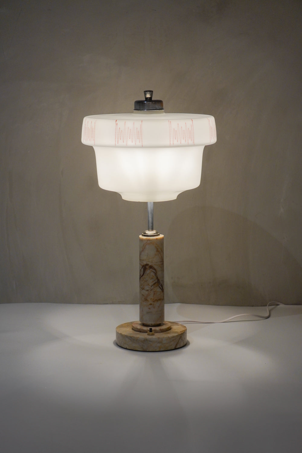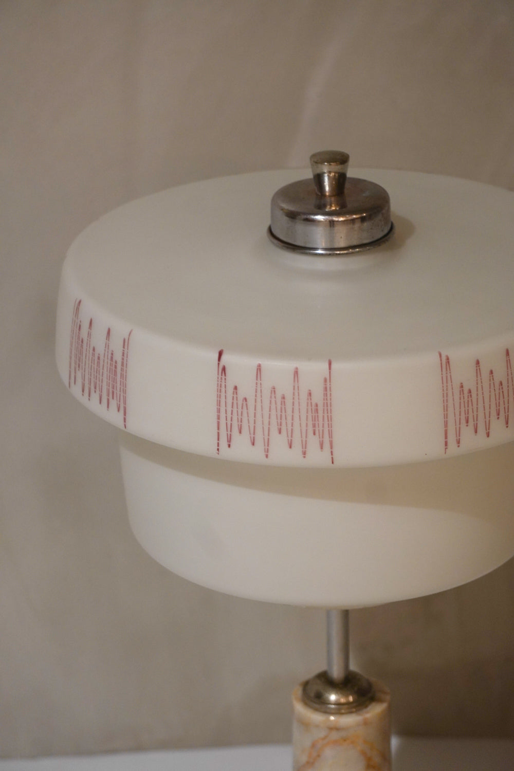 高級感漂う大理石のベースに、波形のようなデザインが施された、ミッドセンチュリー感のあるミルクガラスのシェードを組み合わせた独創的なテーブルランプです。