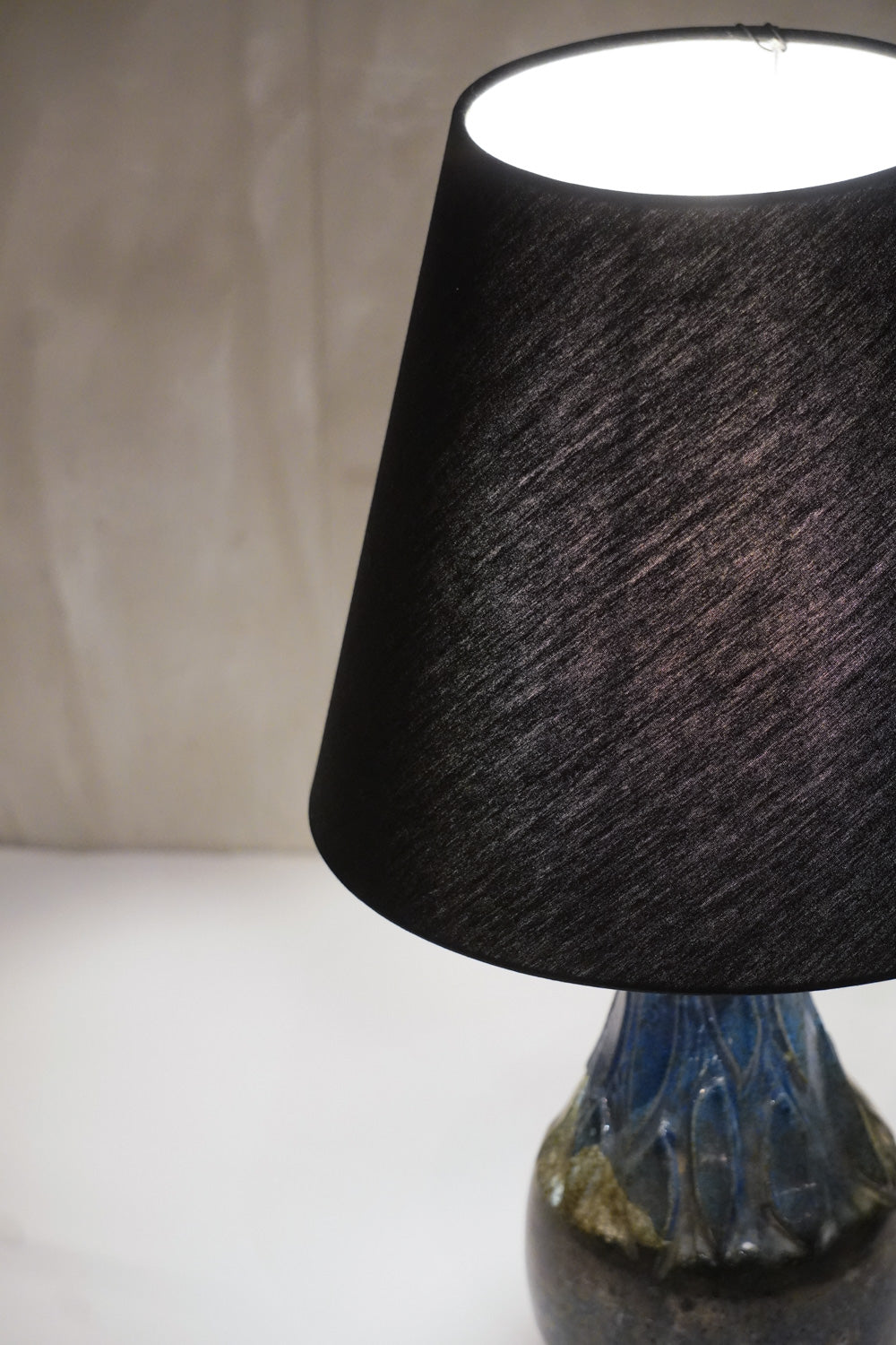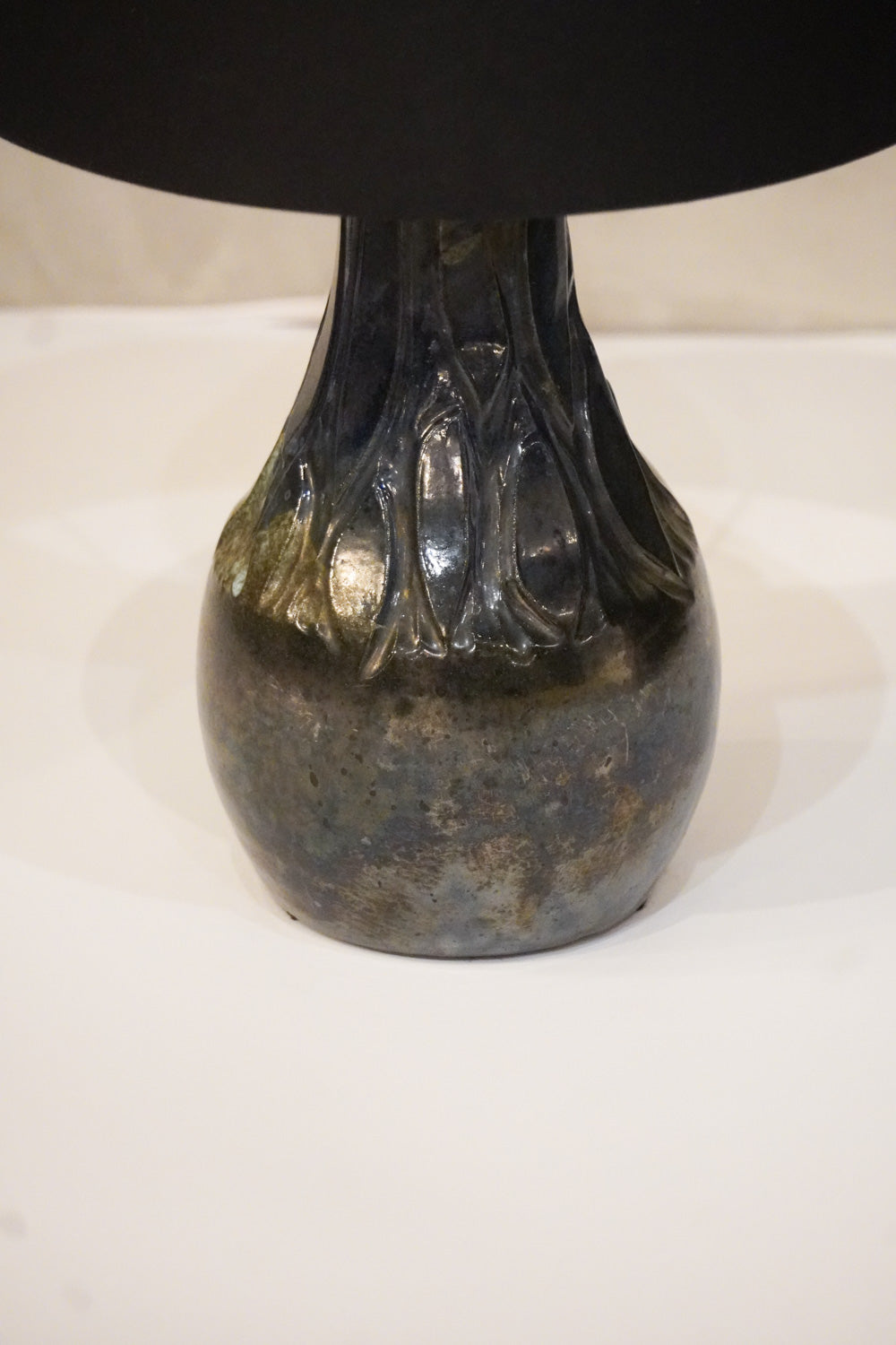 ひょうたんのような形で、深い溝のあるテクスチャが特徴的です。釉薬(うわぐすり)は、光の当たり方でメタリックな光沢を放っています。手作業で彫られた、有機的な流れる線が美しいです。