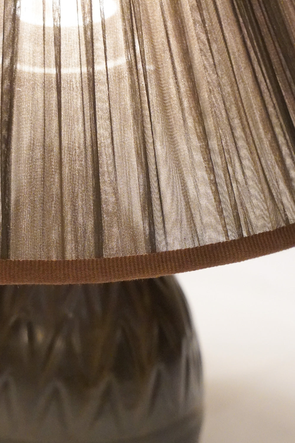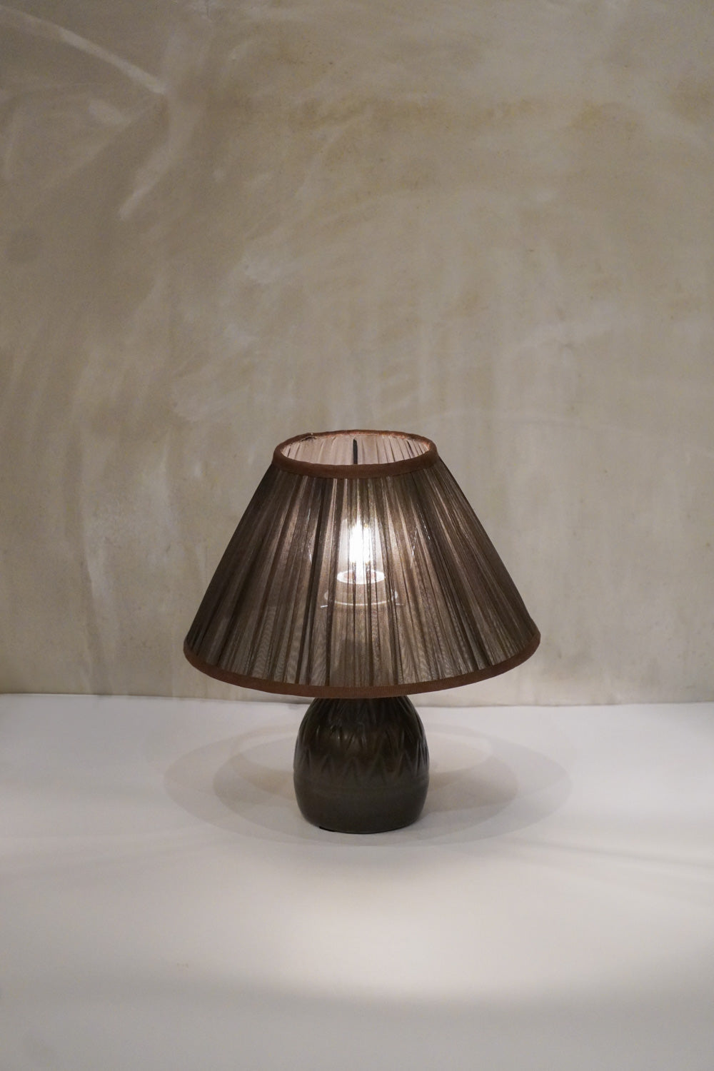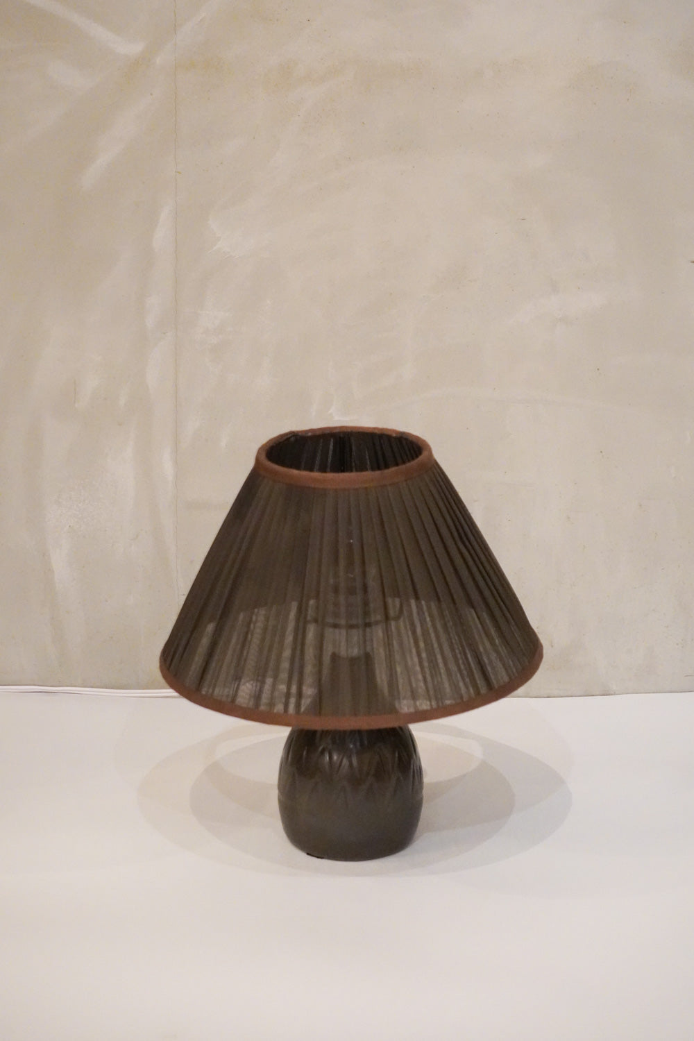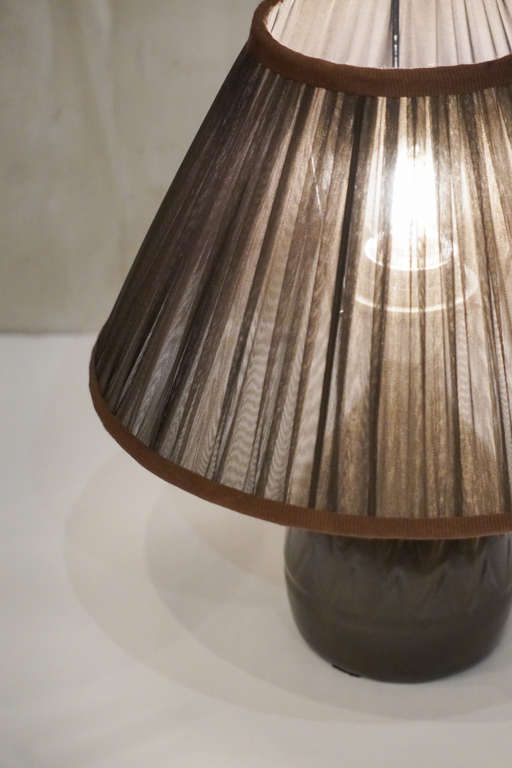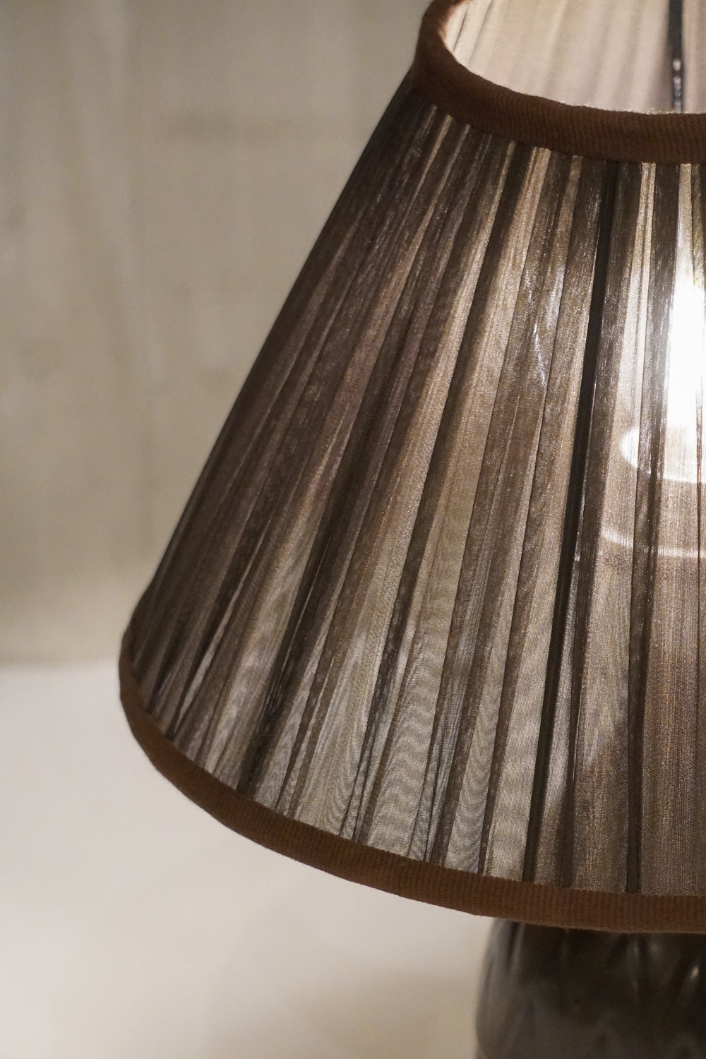 重厚感のある陶器の土台と、軽やかで繊細なプリーツシェードの対比が魅力です。点灯すると、柔らかな光がプリーツを通して広がり、落ち着いた温かみのある空間を演出します。