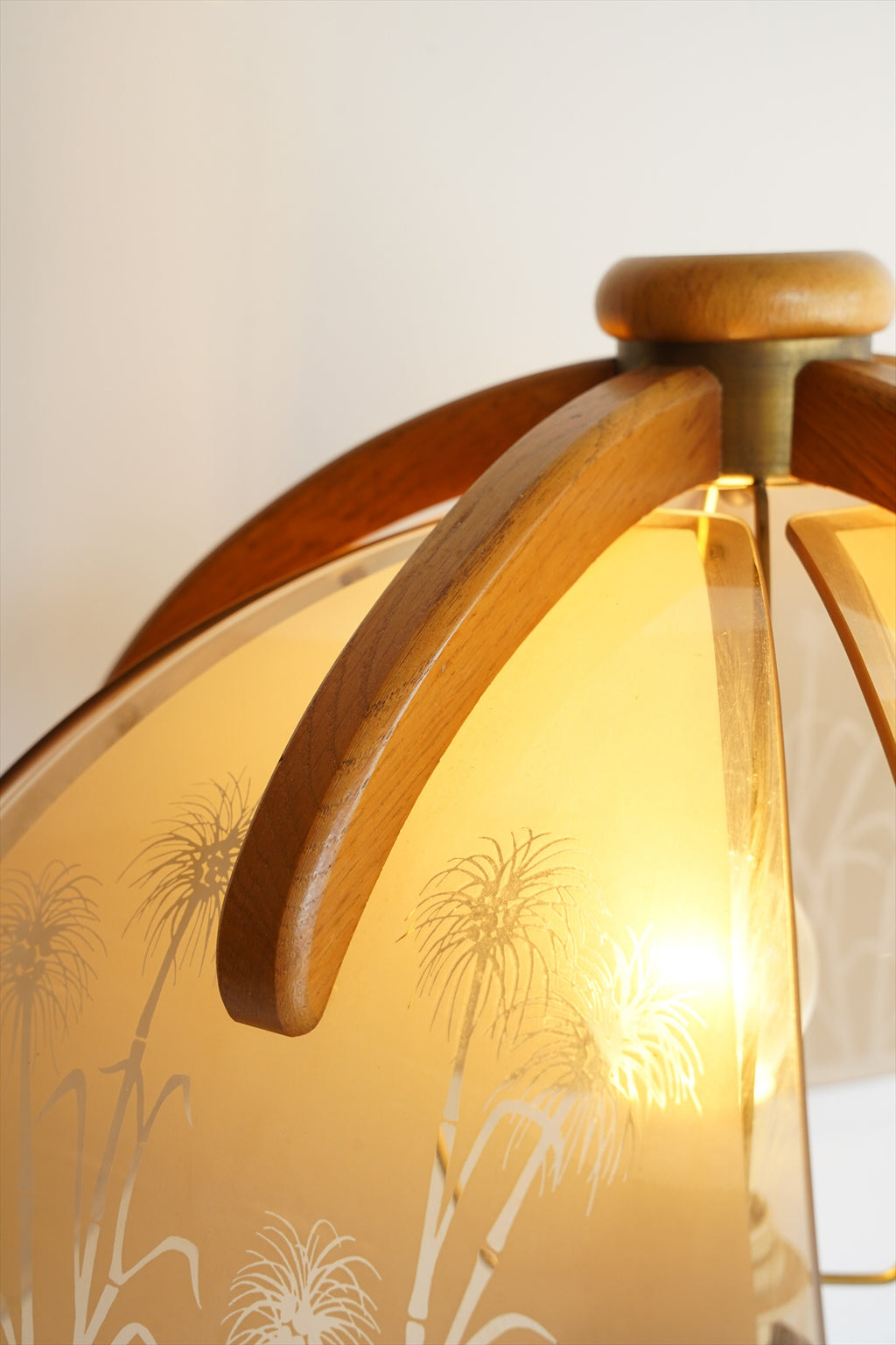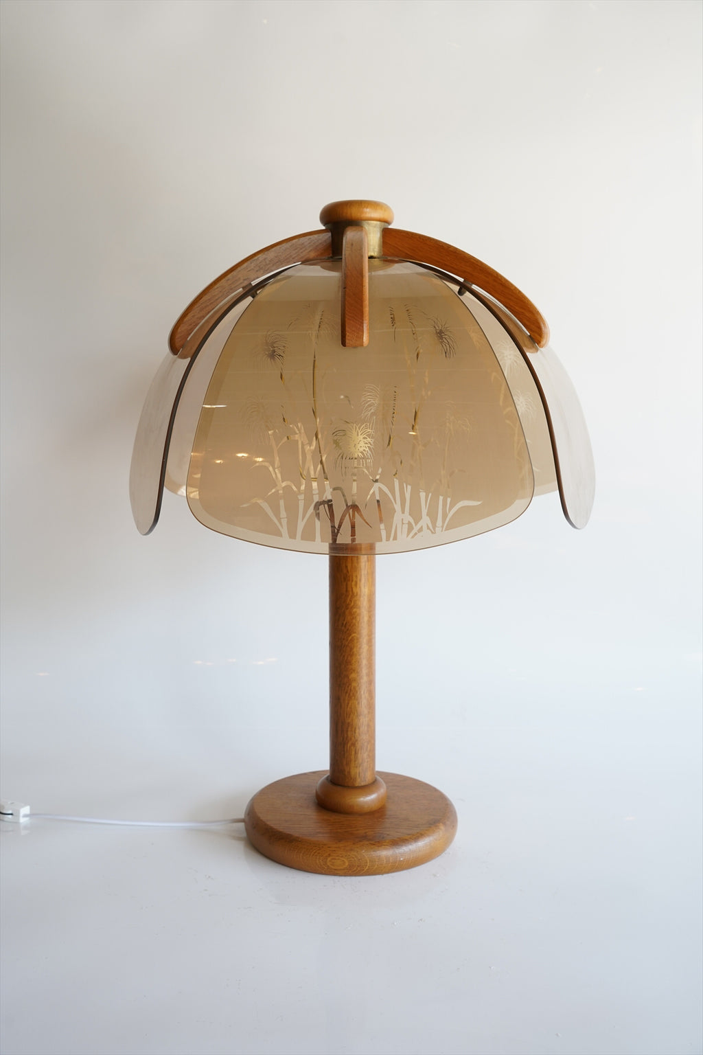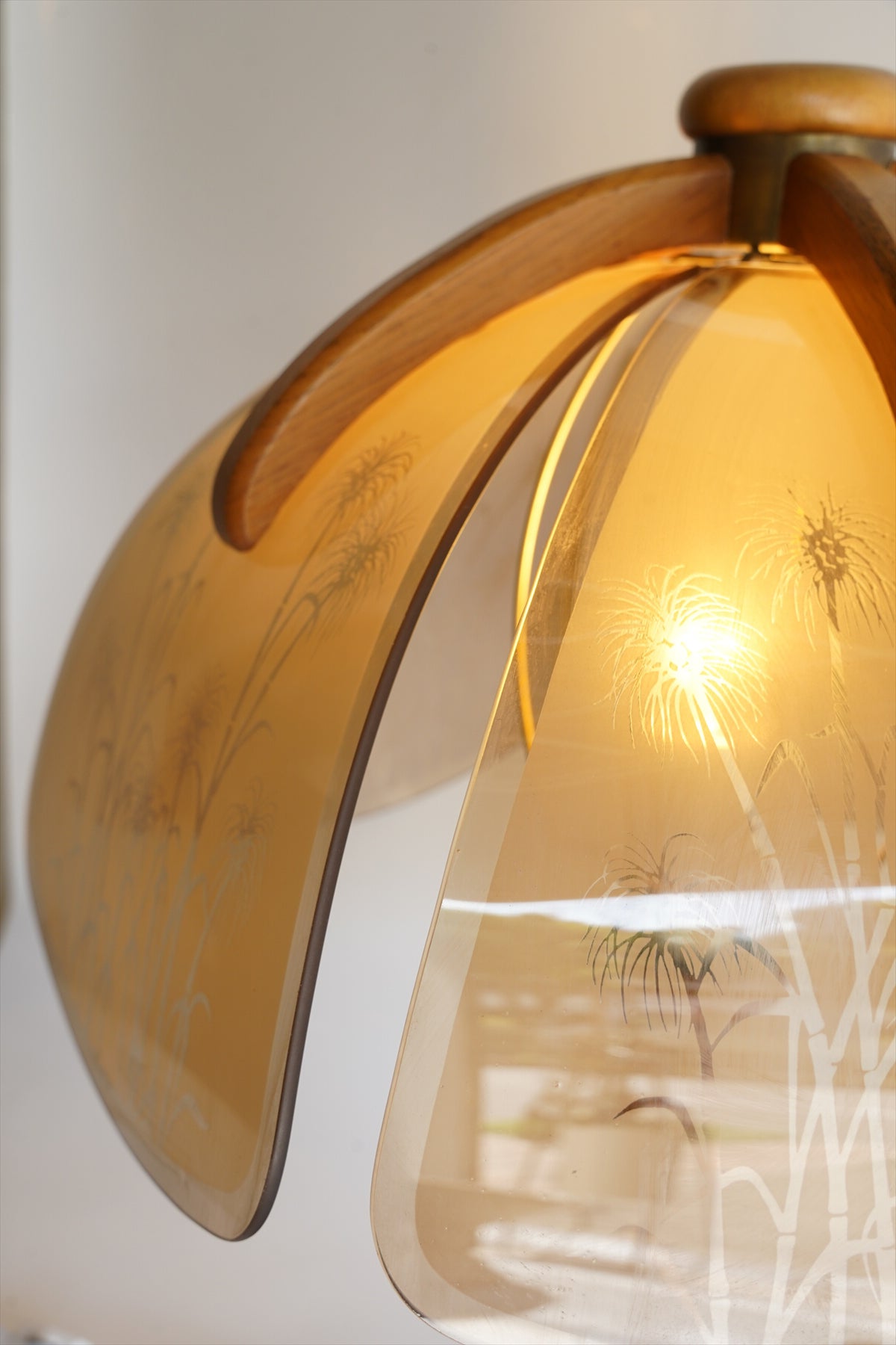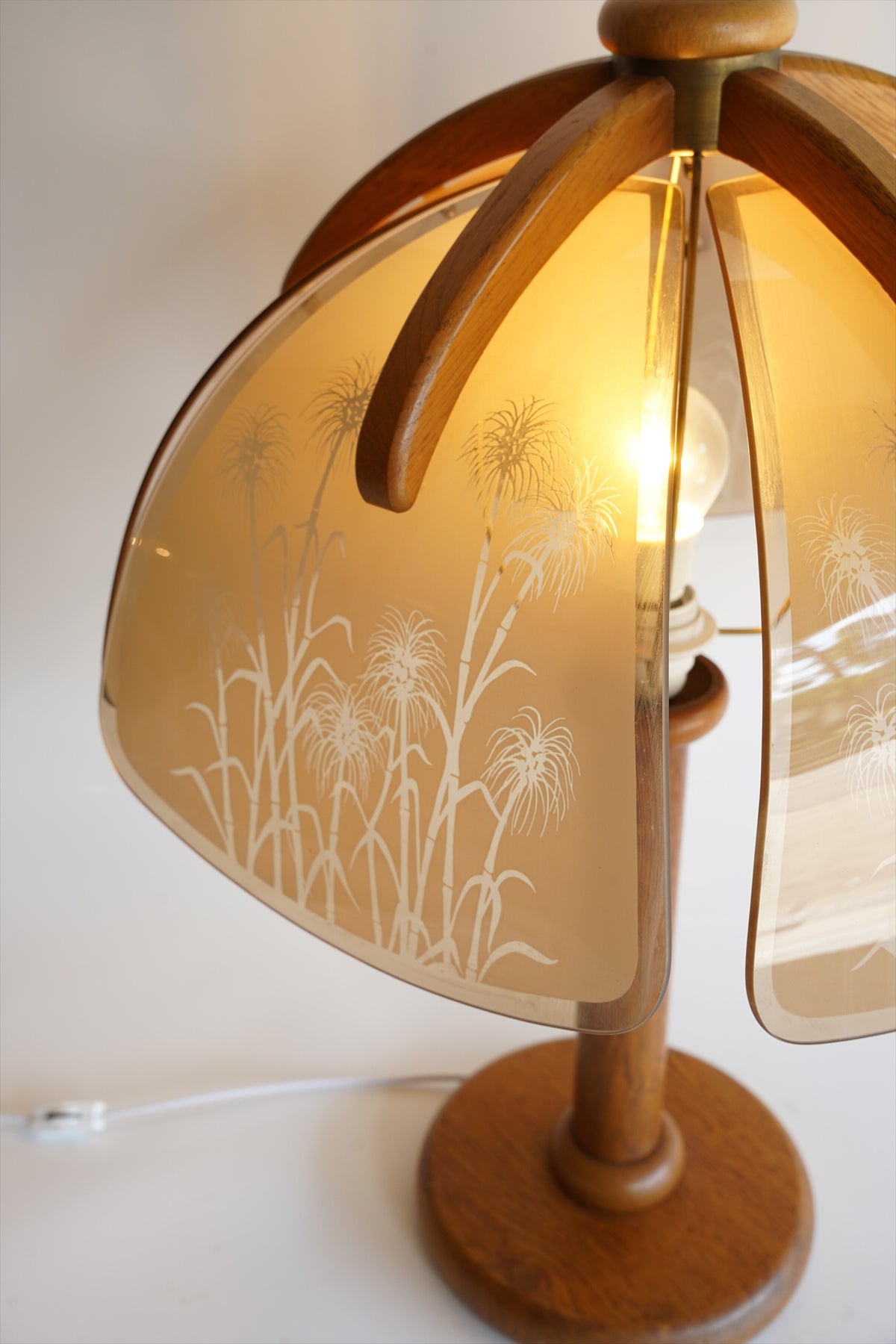 このデスクランプは、ユニークなデザインが魅力です。木の温かみのある曲線と、ガラスシェードが、お部屋に柔らかな光と落ち着きをもたらします。シェードには繊細な植物の模様が描かれており、明かりを灯すと幻想的な影が広がり、まるでアート作品のようです。