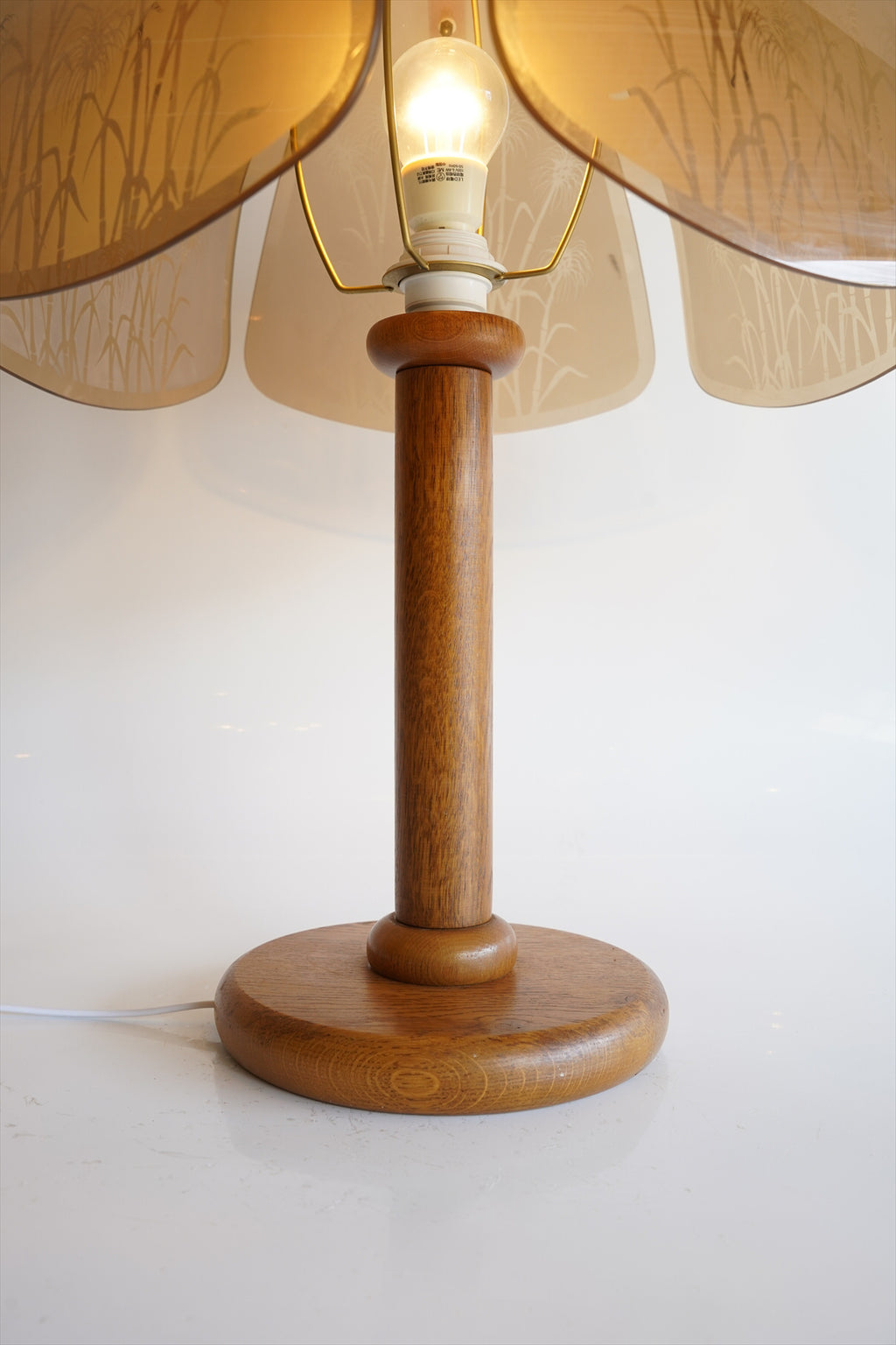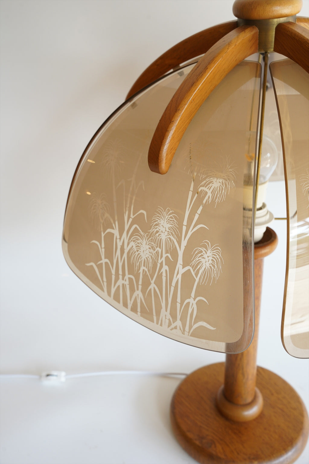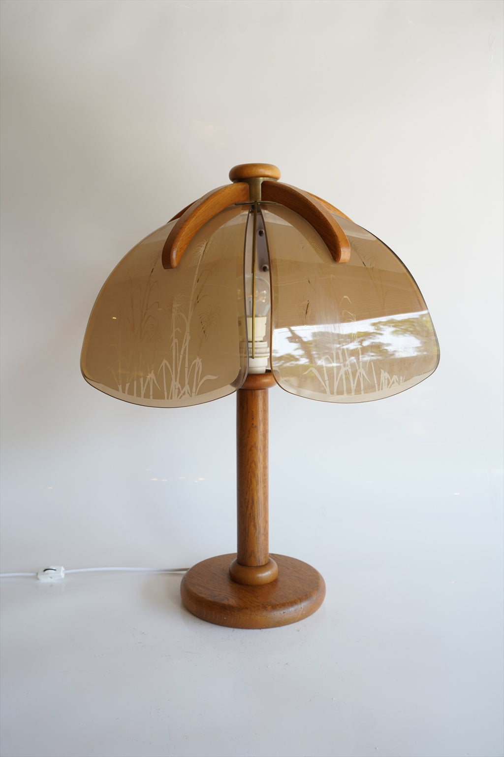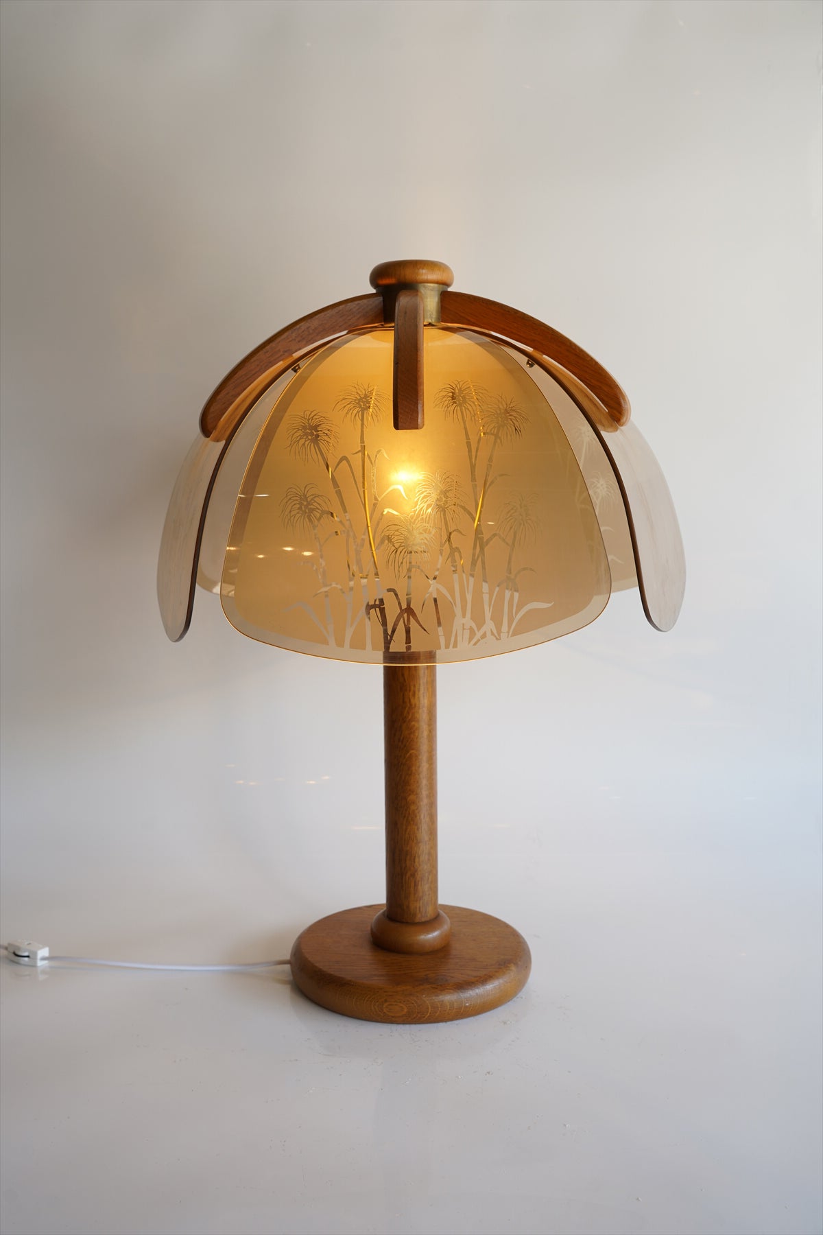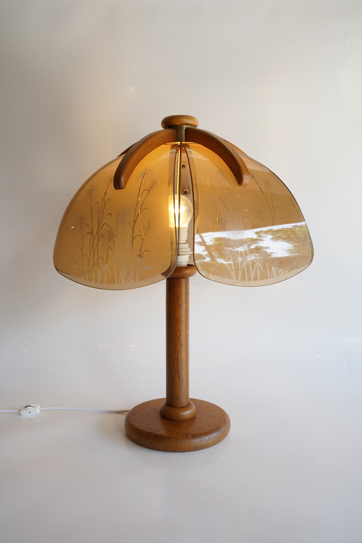 このデスクランプは、ユニークなデザインが魅力です。木の温かみのある曲線と、ガラスシェードが、お部屋に柔らかな光と落ち着きをもたらします。シェードには繊細な植物の模様が描かれており、明かりを灯すと幻想的な影が広がり、まるでアート作品のようです。