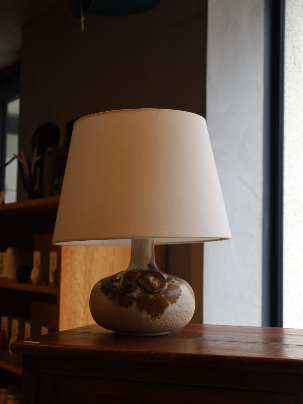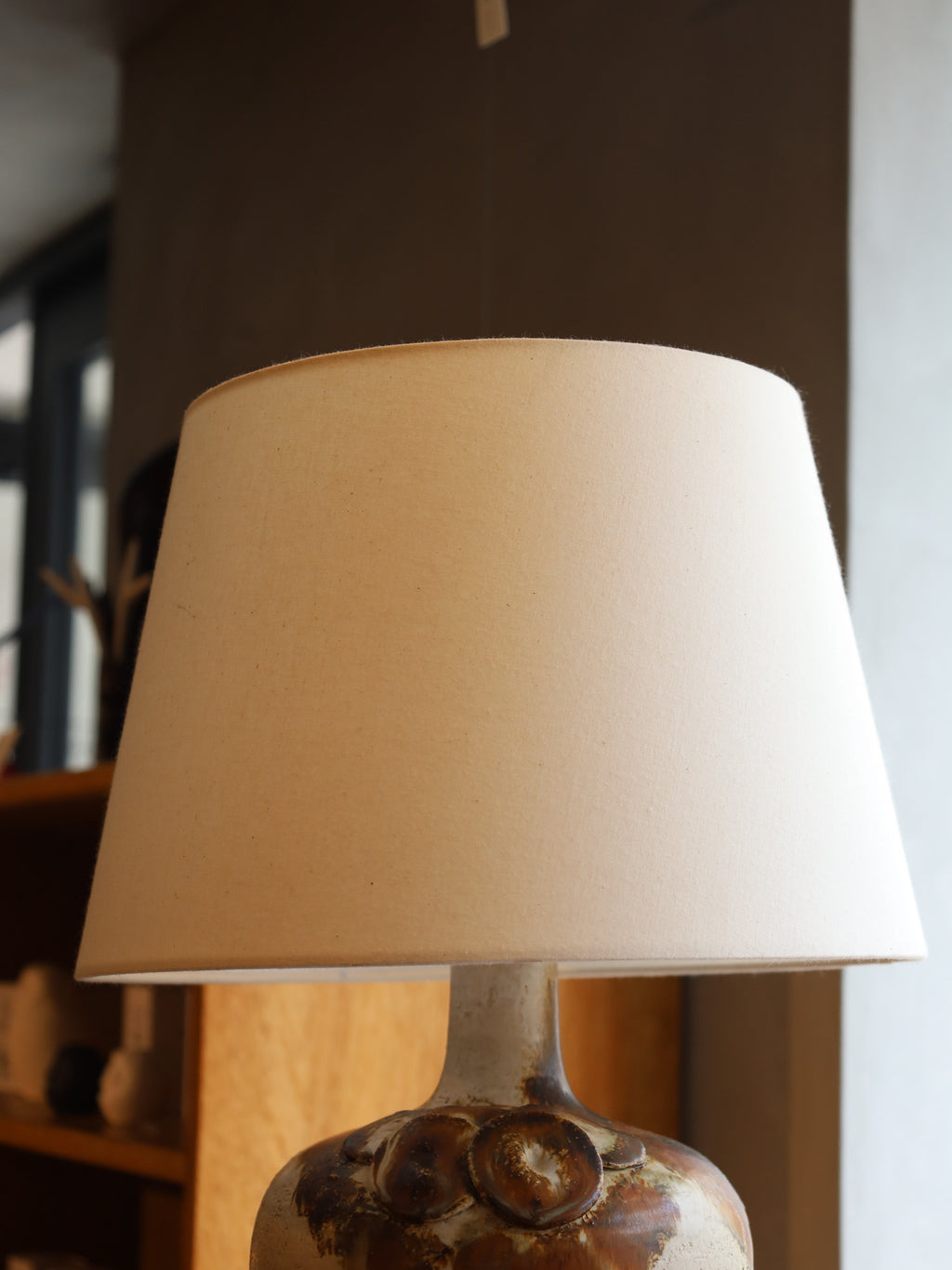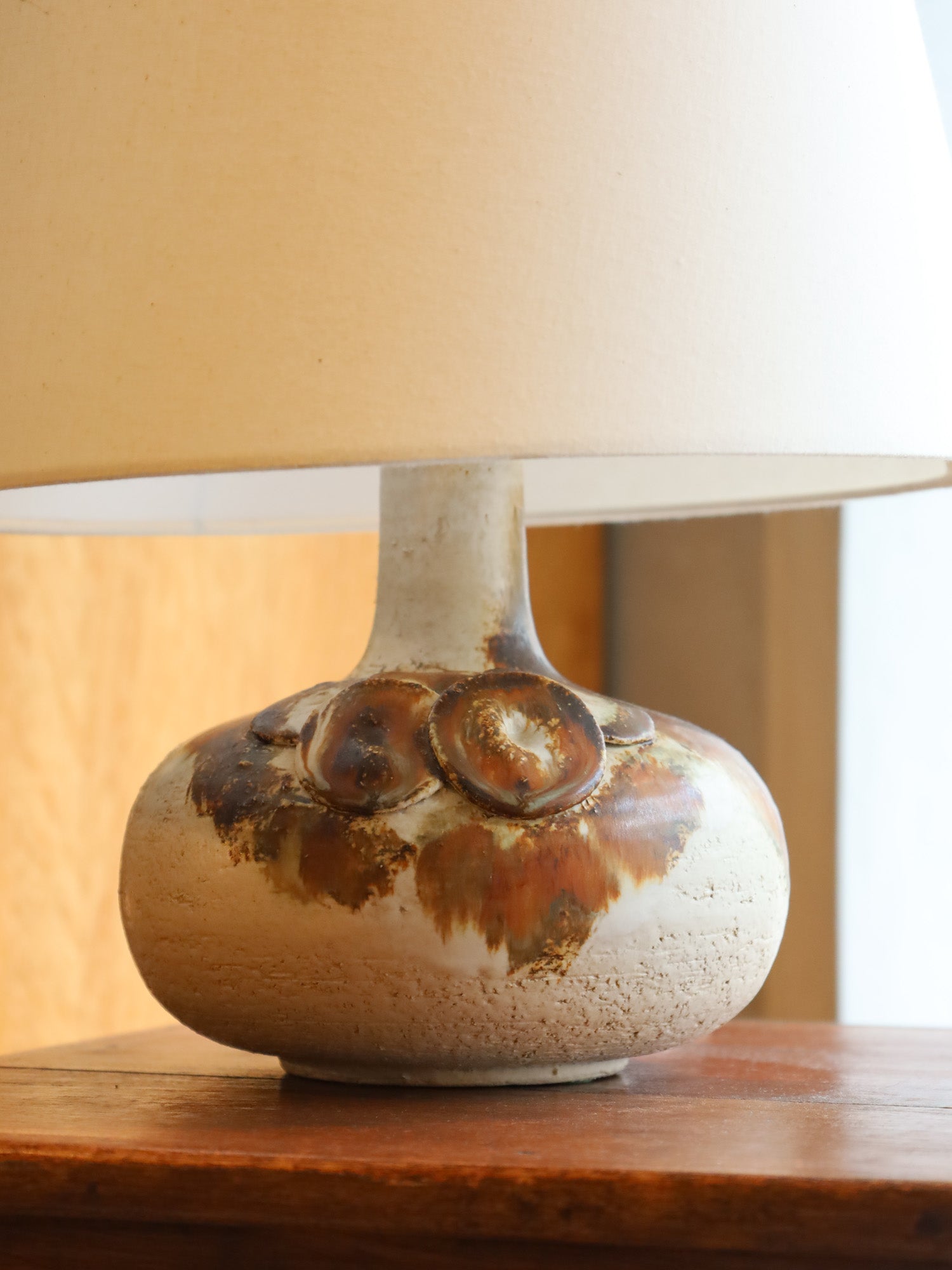 手作りの陶器をベースに、抽象的な円形模様とざらつきのある質感が特徴的なテーブルランプ。