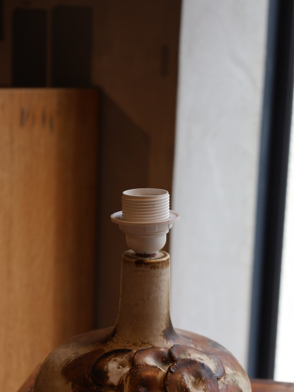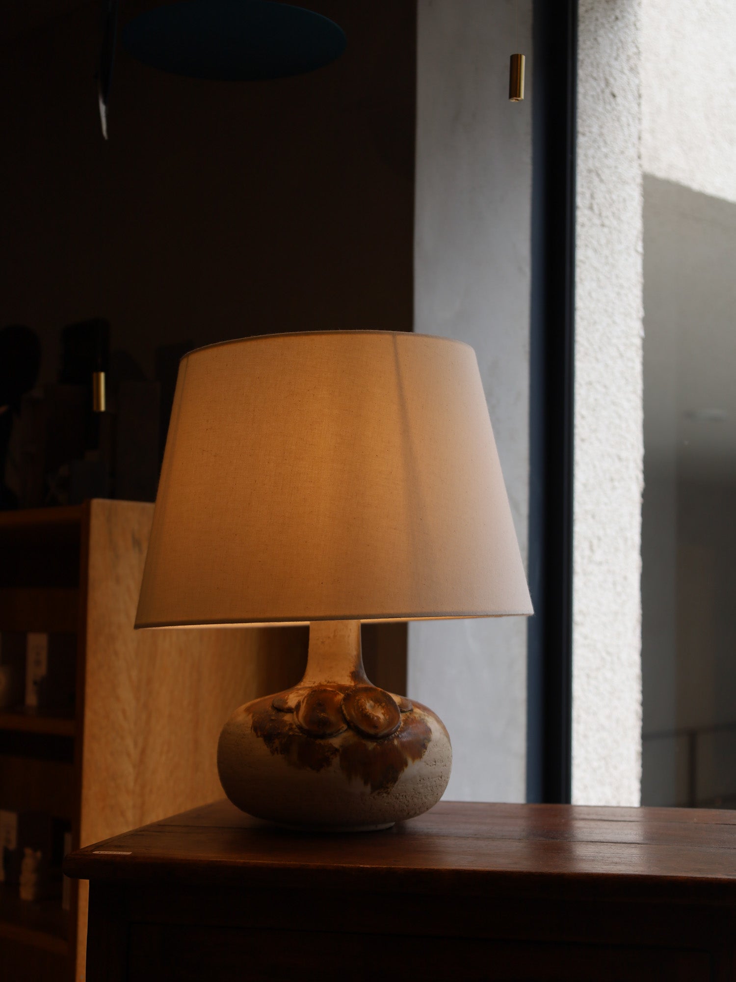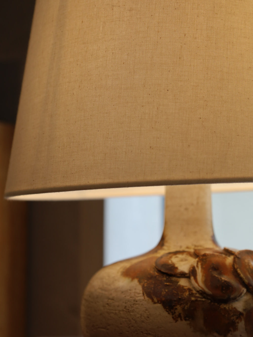 手作りの陶器をベースに、抽象的な円形模様とざらつきのある質感が特徴的なテーブルランプ。