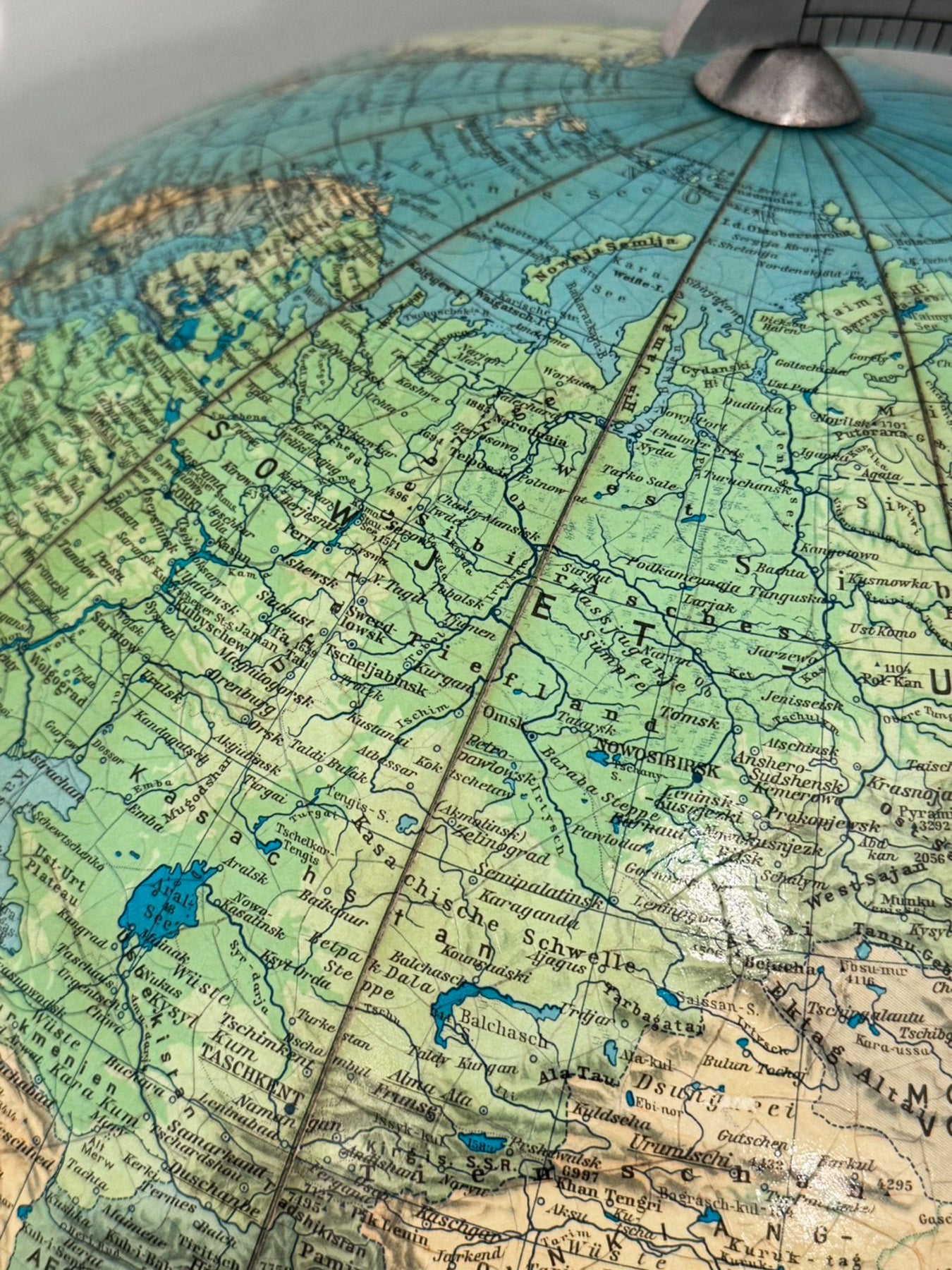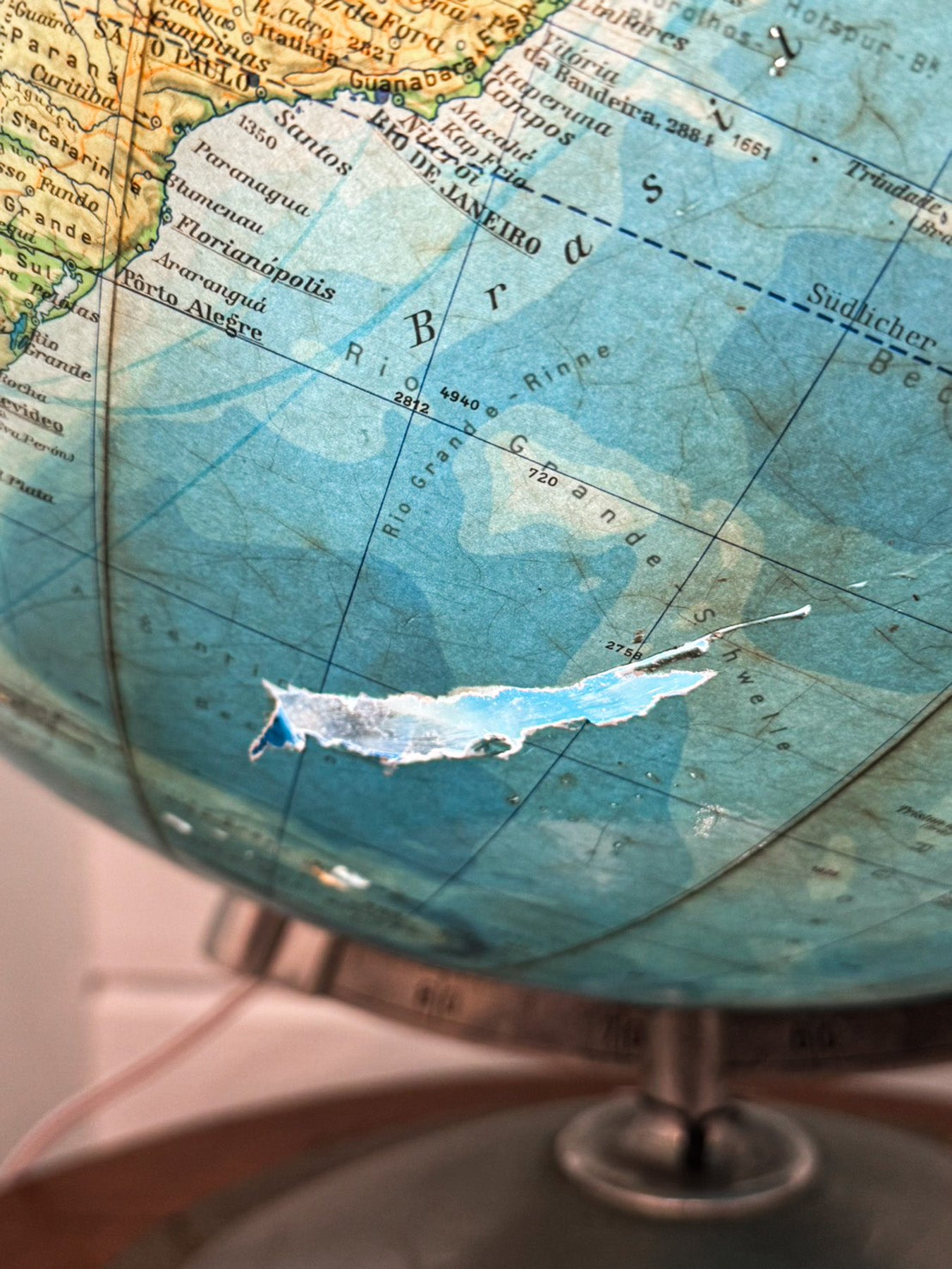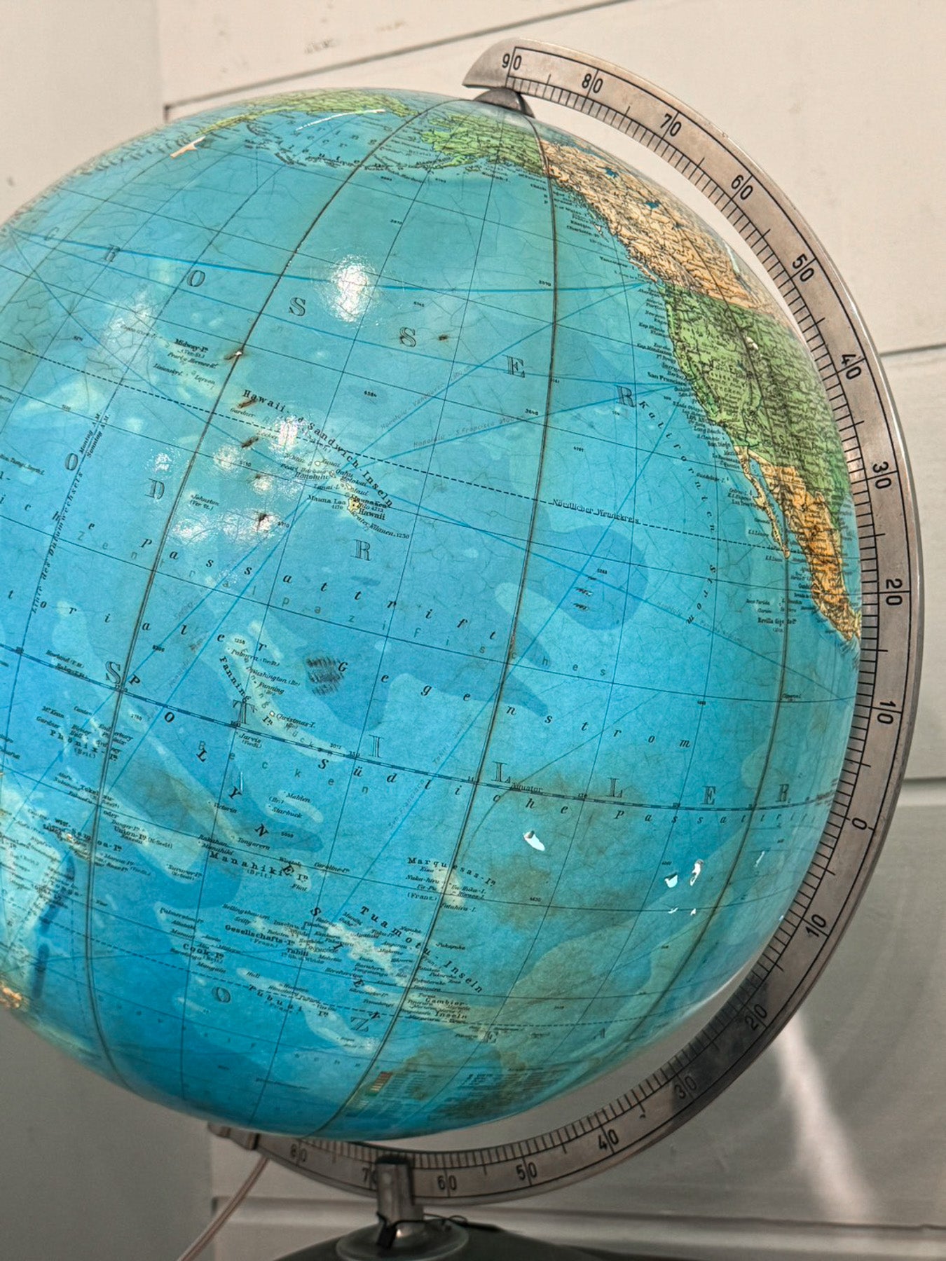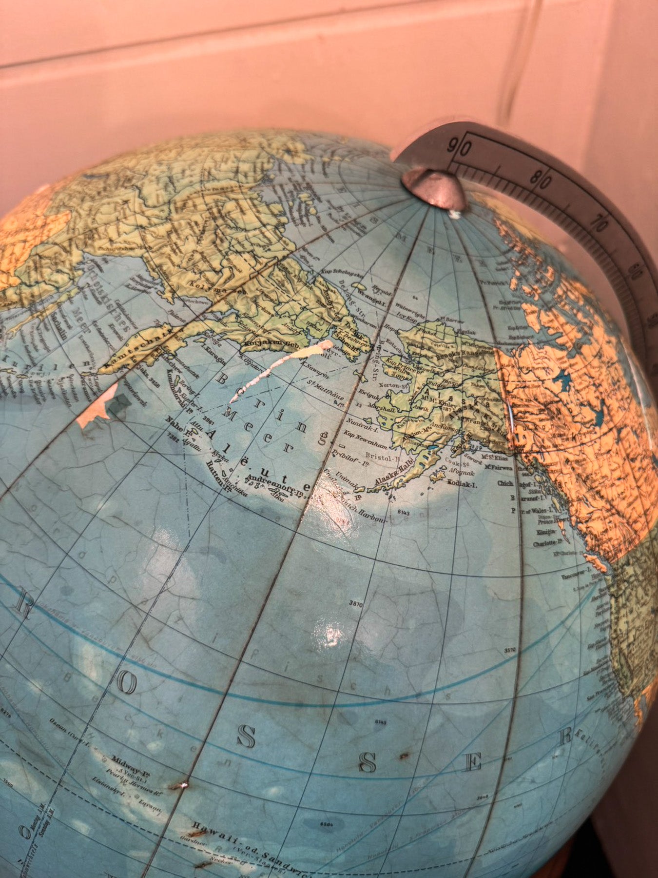 長年の旅を経たような、紙の剥がれや色褪せも、 この地球儀が持つ歴史の証であり、唯一無二の魅力です。