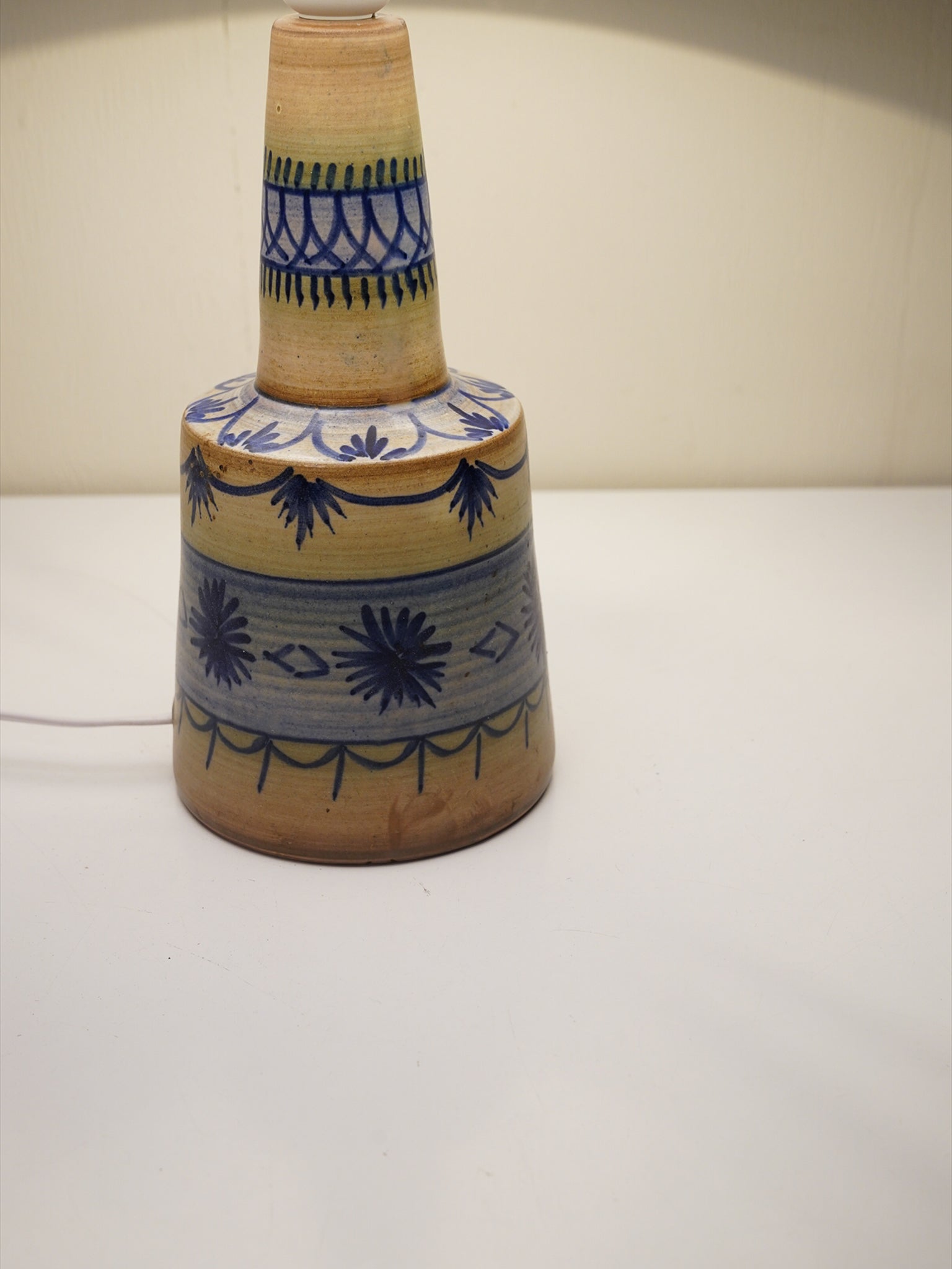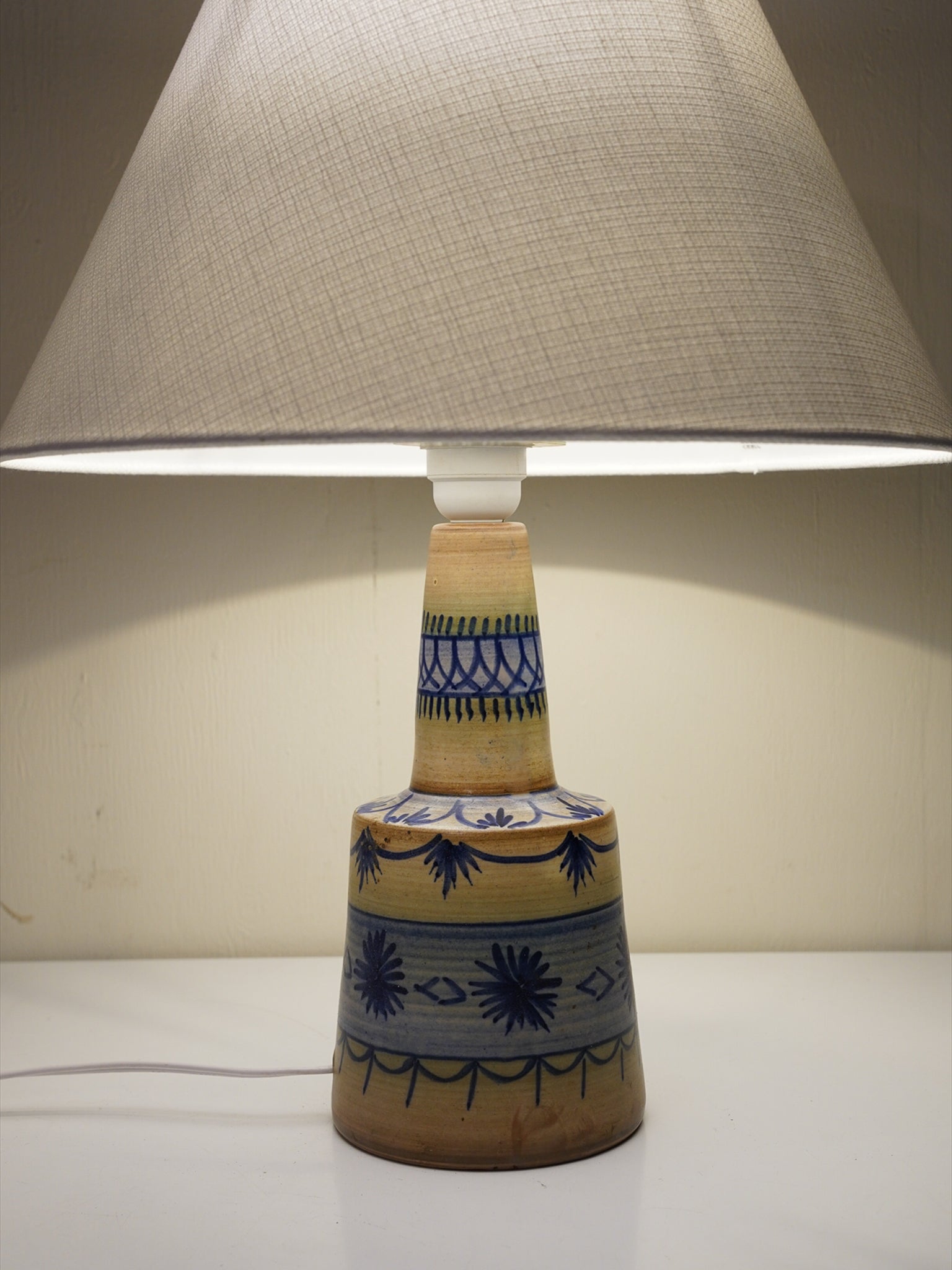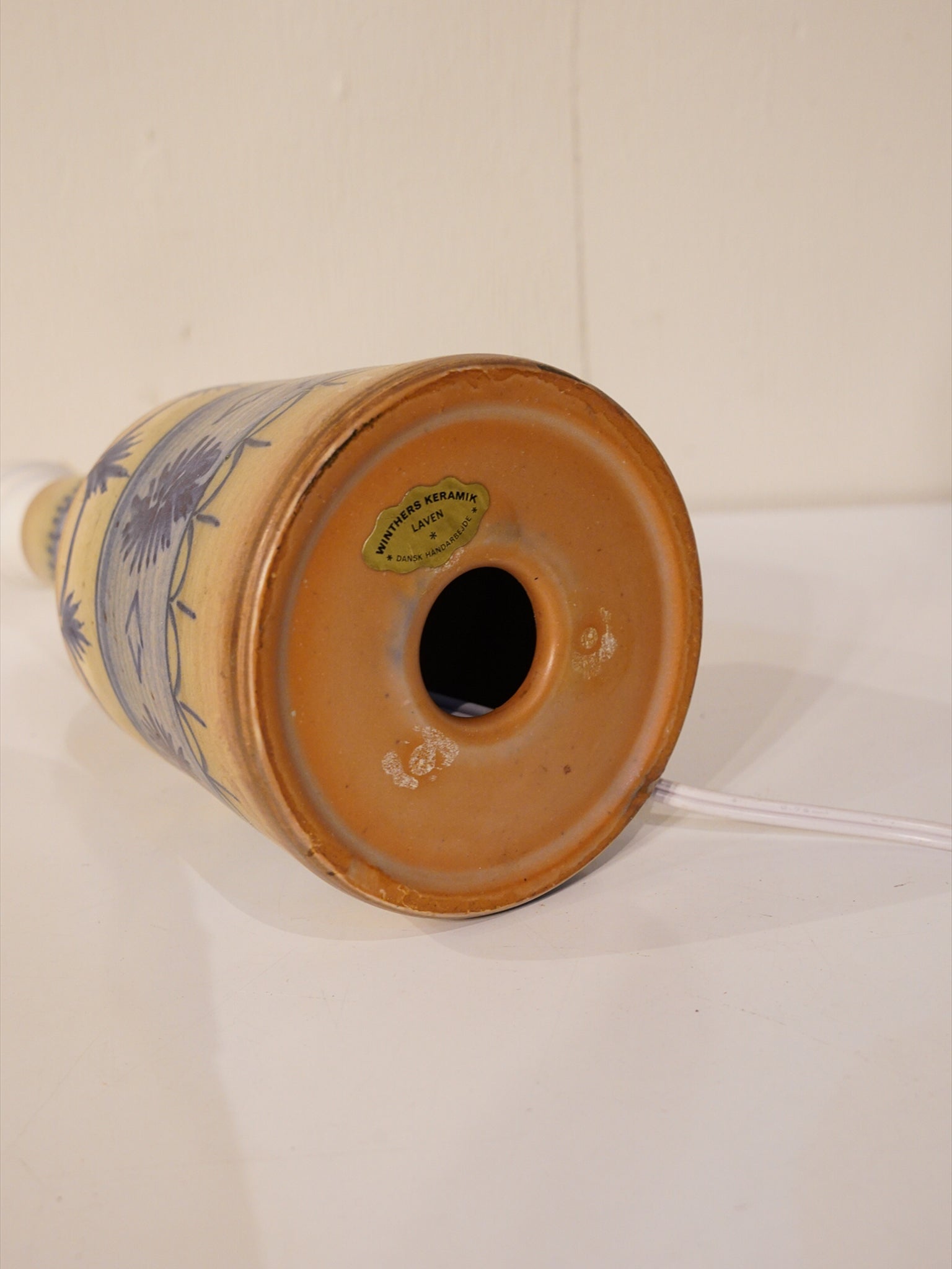 デンマークのWinthers Keramikによる、手描き装飾が魅力のテーブルランプです。ベース裏のラベルには「WINTHERS KERAMIK LAVEN DANSK HÅNDARBEJDE」と記されており、職人の技が詰まった一点物です。