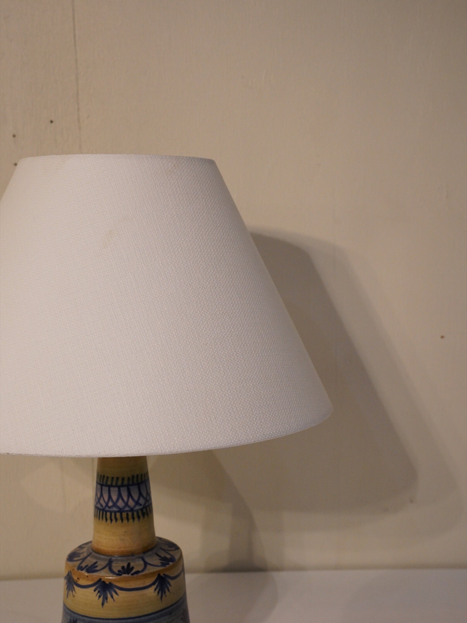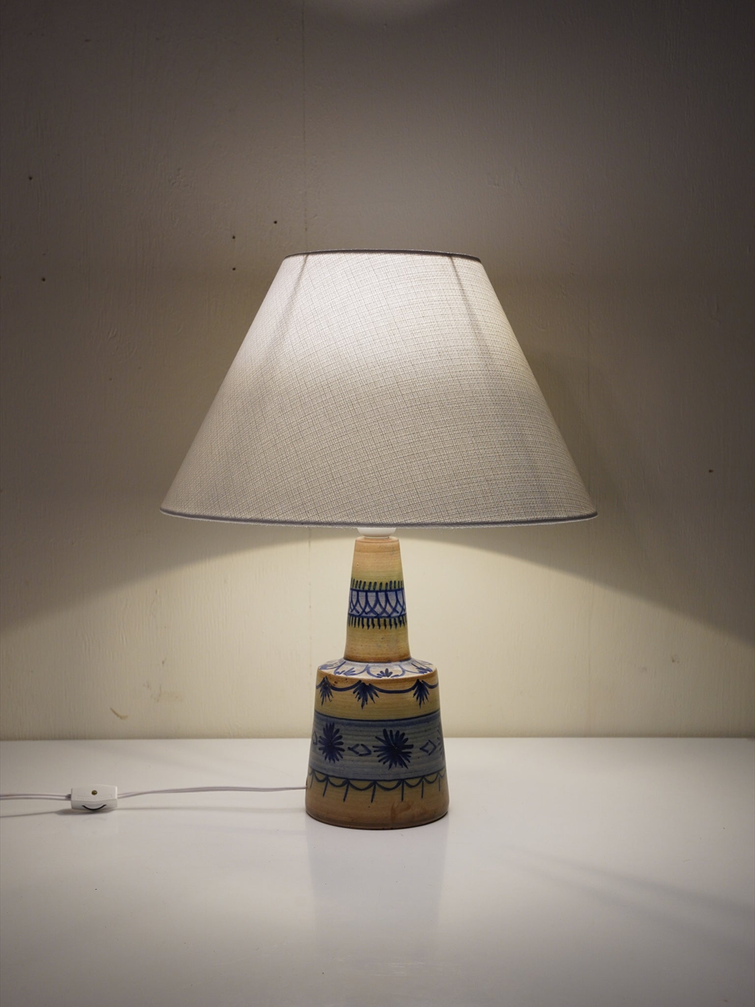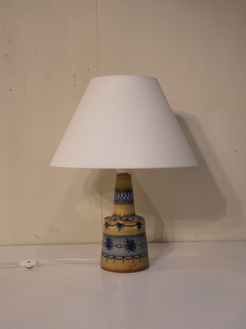 デンマークのWinthers Keramikによる、手描き装飾が魅力のテーブルランプです。ベース裏のラベルには「WINTHERS KERAMIK LAVEN DANSK HÅNDARBEJDE」と記されており、職人の技が詰まった一点物です。