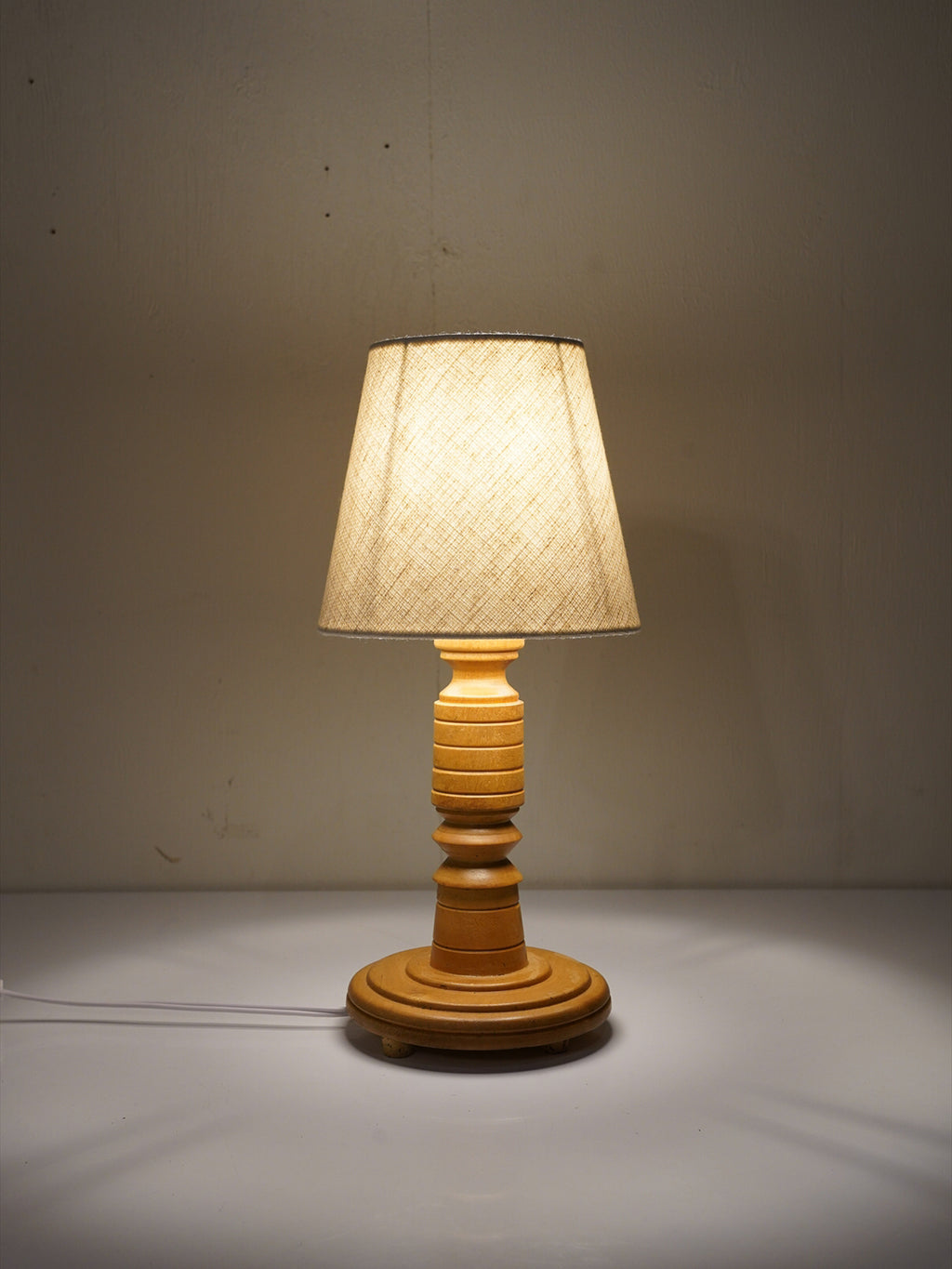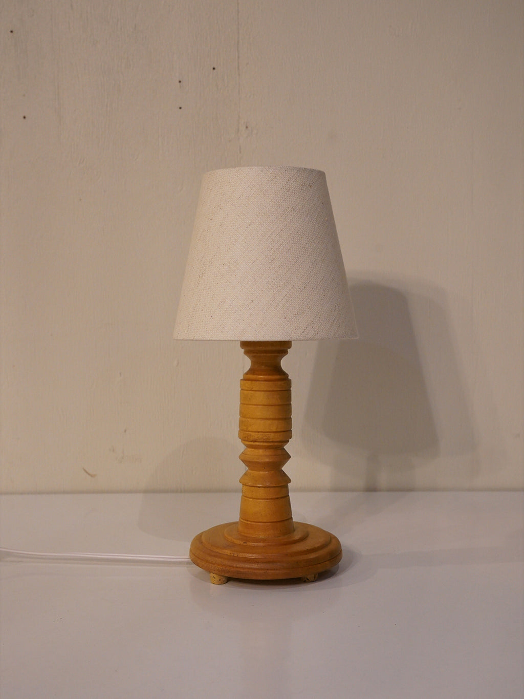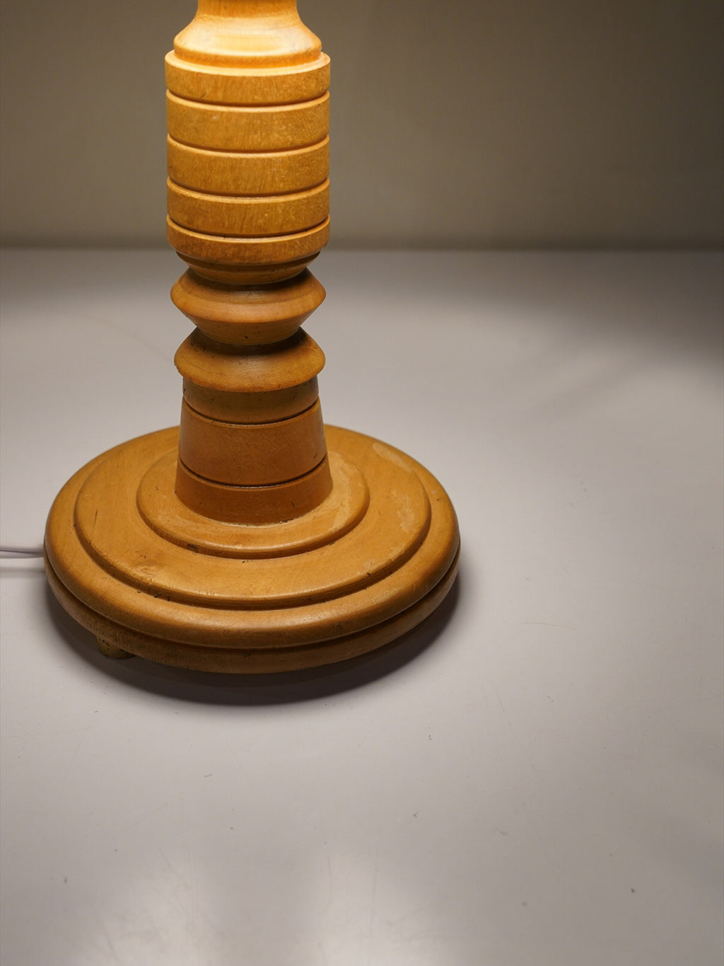 中央の支柱部分は、伝統的な燭台を思わせる階層的なフォルムが特徴で、丸みを帯びた段差がリズミカルな陰影を生み出しています。滑らかな木肌からは、ヴィンテージらしい心地よい経年変化の風合いが感じられます。