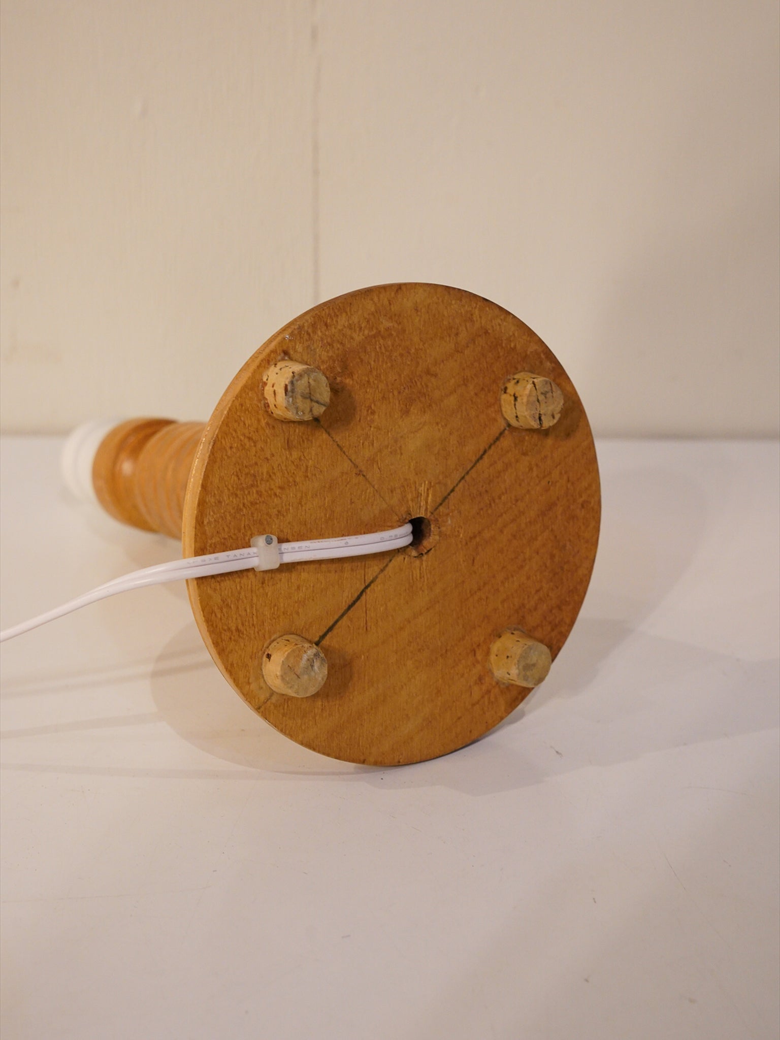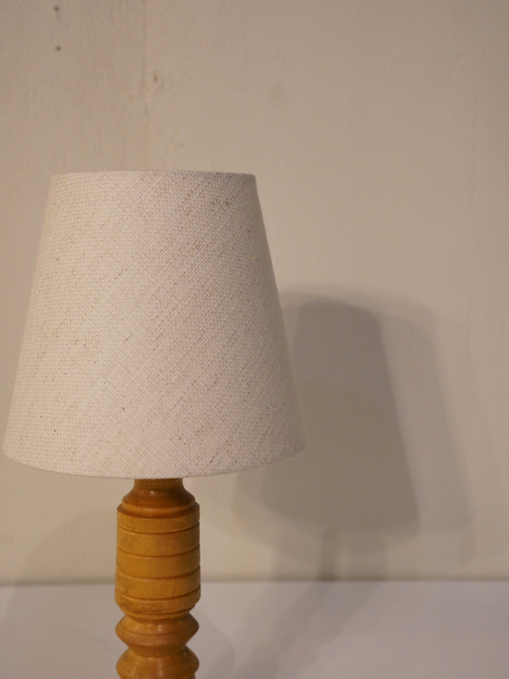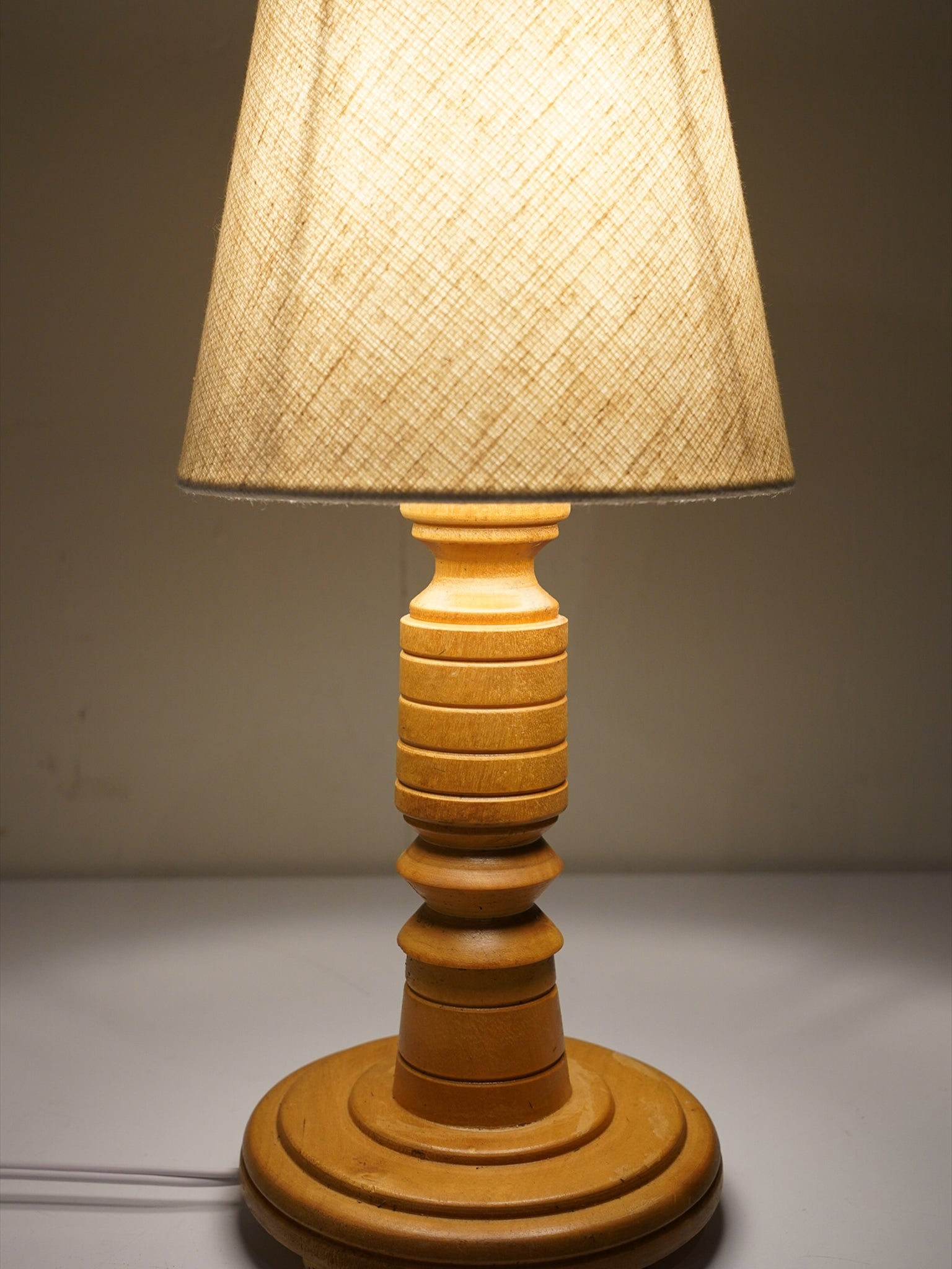 中央の支柱部分は、伝統的な燭台を思わせる階層的なフォルムが特徴で、丸みを帯びた段差がリズミカルな陰影を生み出しています。滑らかな木肌からは、ヴィンテージらしい心地よい経年変化の風合いが感じられます。