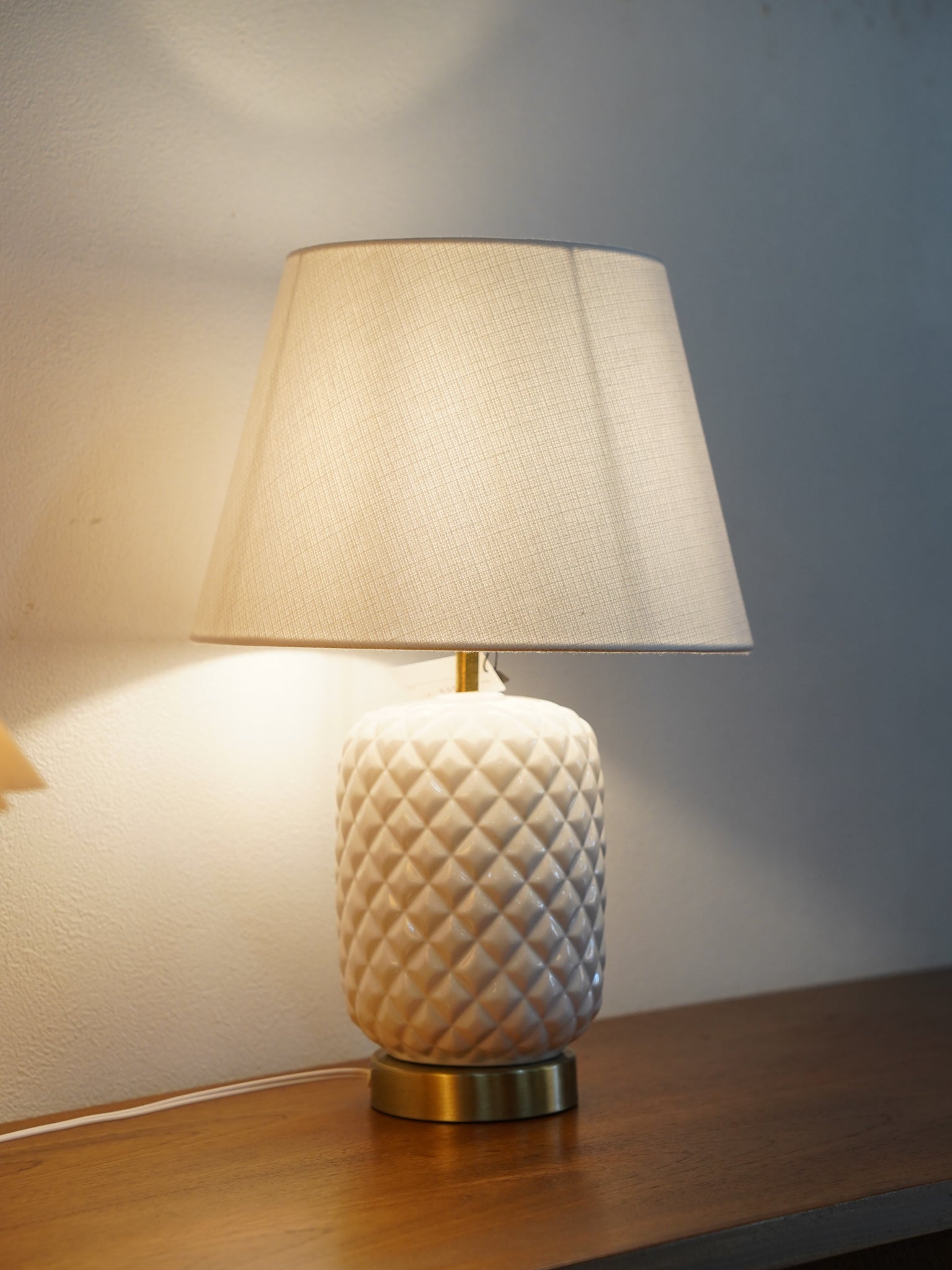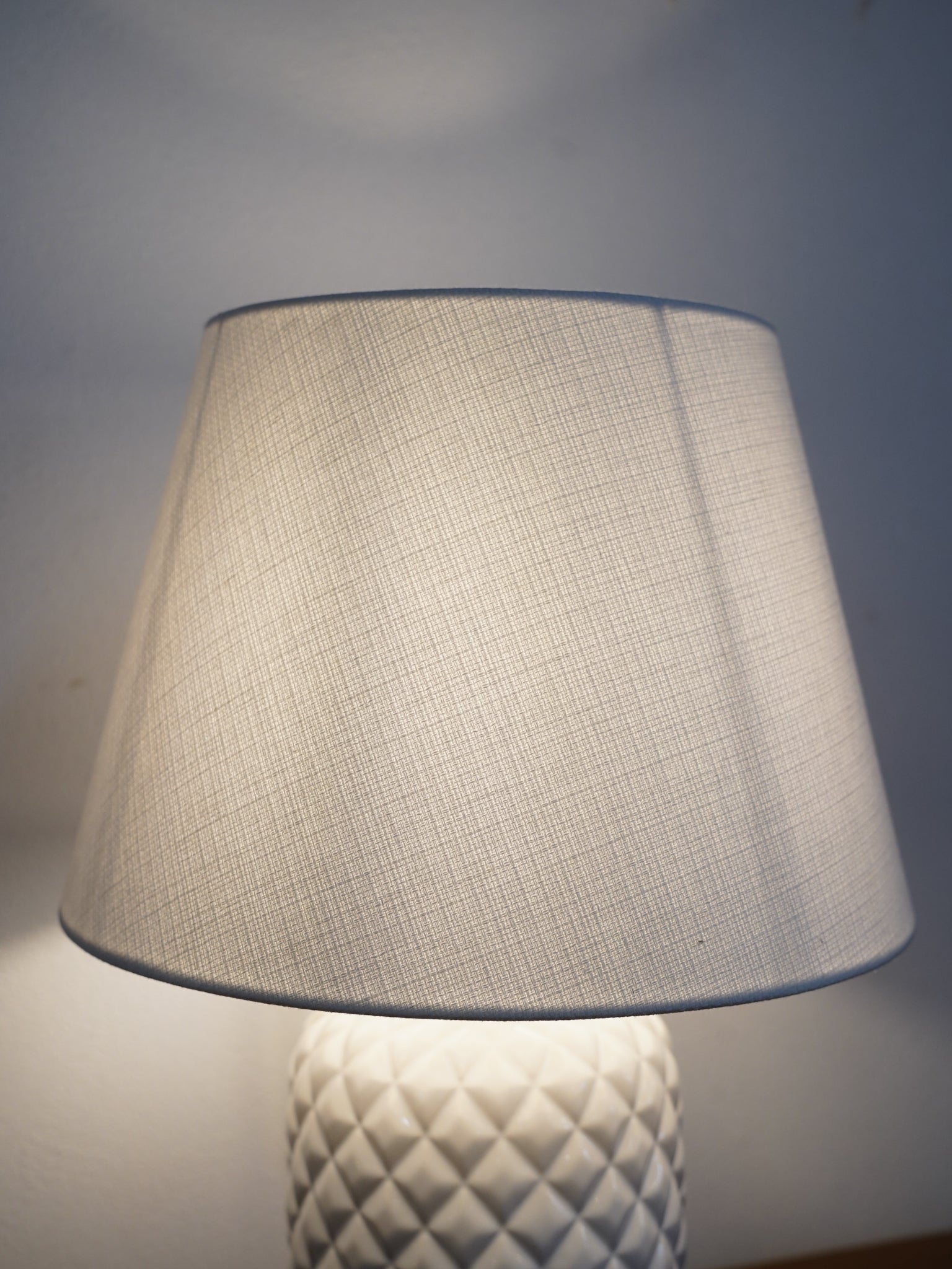 陶器特有の柔らかな光沢が、格子状の凹凸によって美しい陰影を生み出し、消灯時でも彫刻作品のような佇まいを見せます。