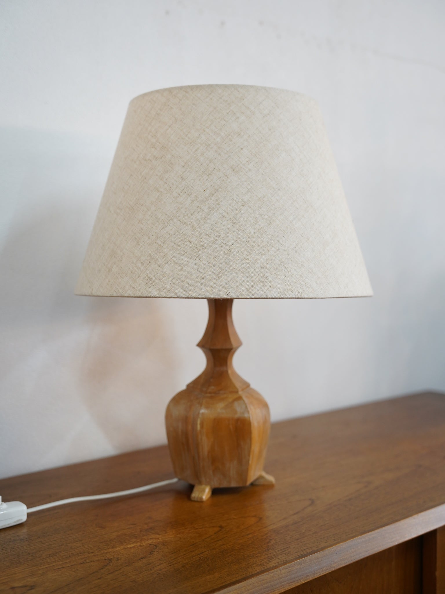 柔らかな光を透過するファブリックシェードと、飴色に輝くウッドベース。