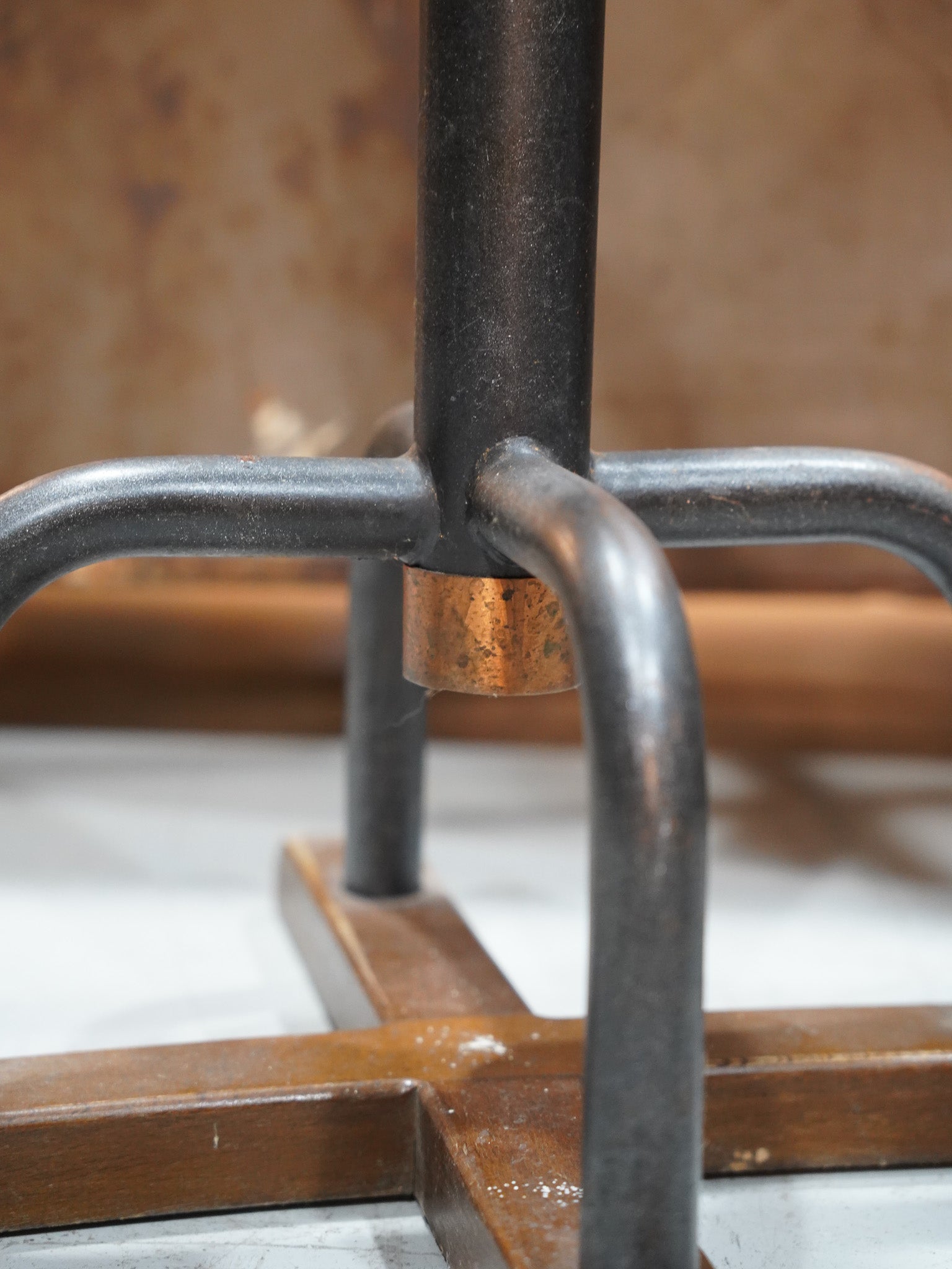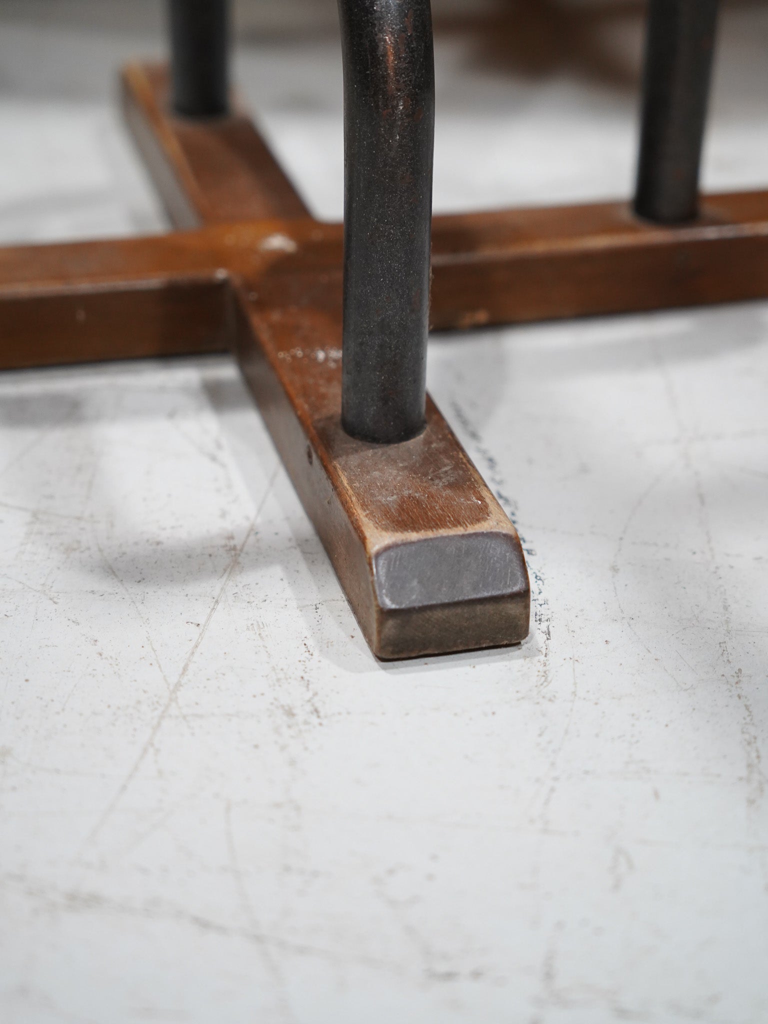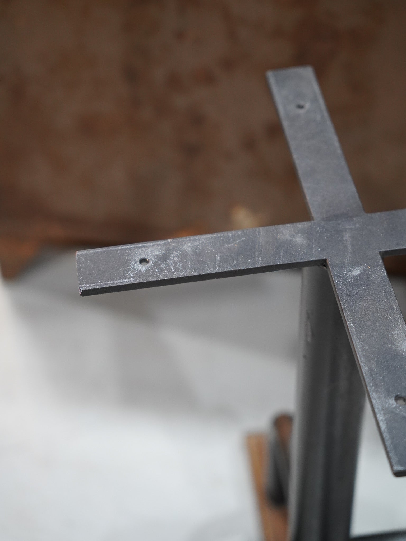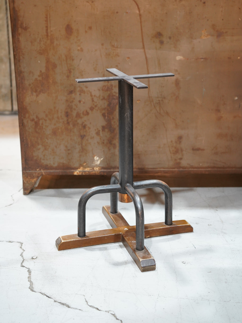 重厚なアイアン(鉄)と味わい深い木材を組み合わせた、十字ベースのテーブル脚です。無骨なアイアンの質感と、使い込まれたような木材の風合いが、空間にインダストリアルやアンティークな雰囲気をプラスします。カフェテーブルやサイドテーブル、ディスプレイ台のDIYに最適です。
