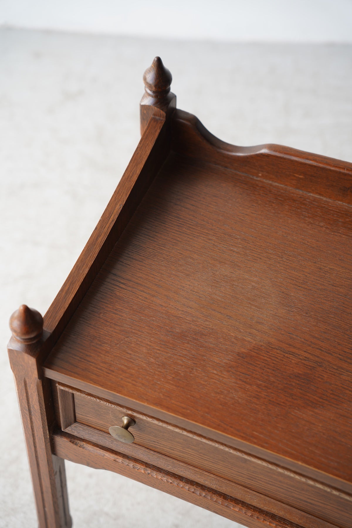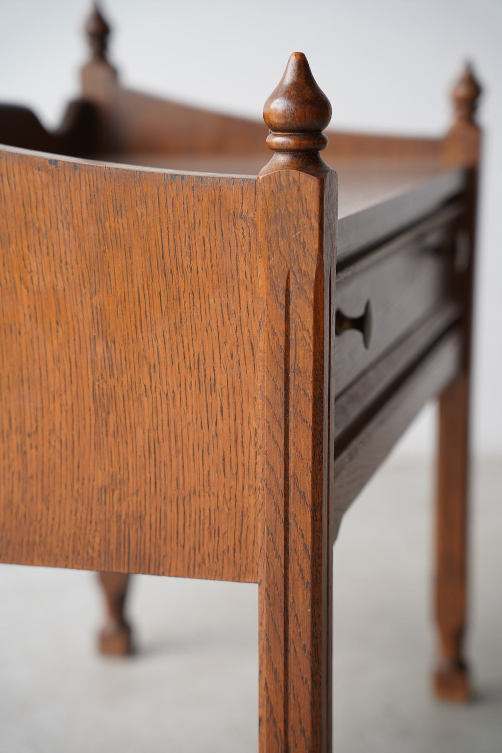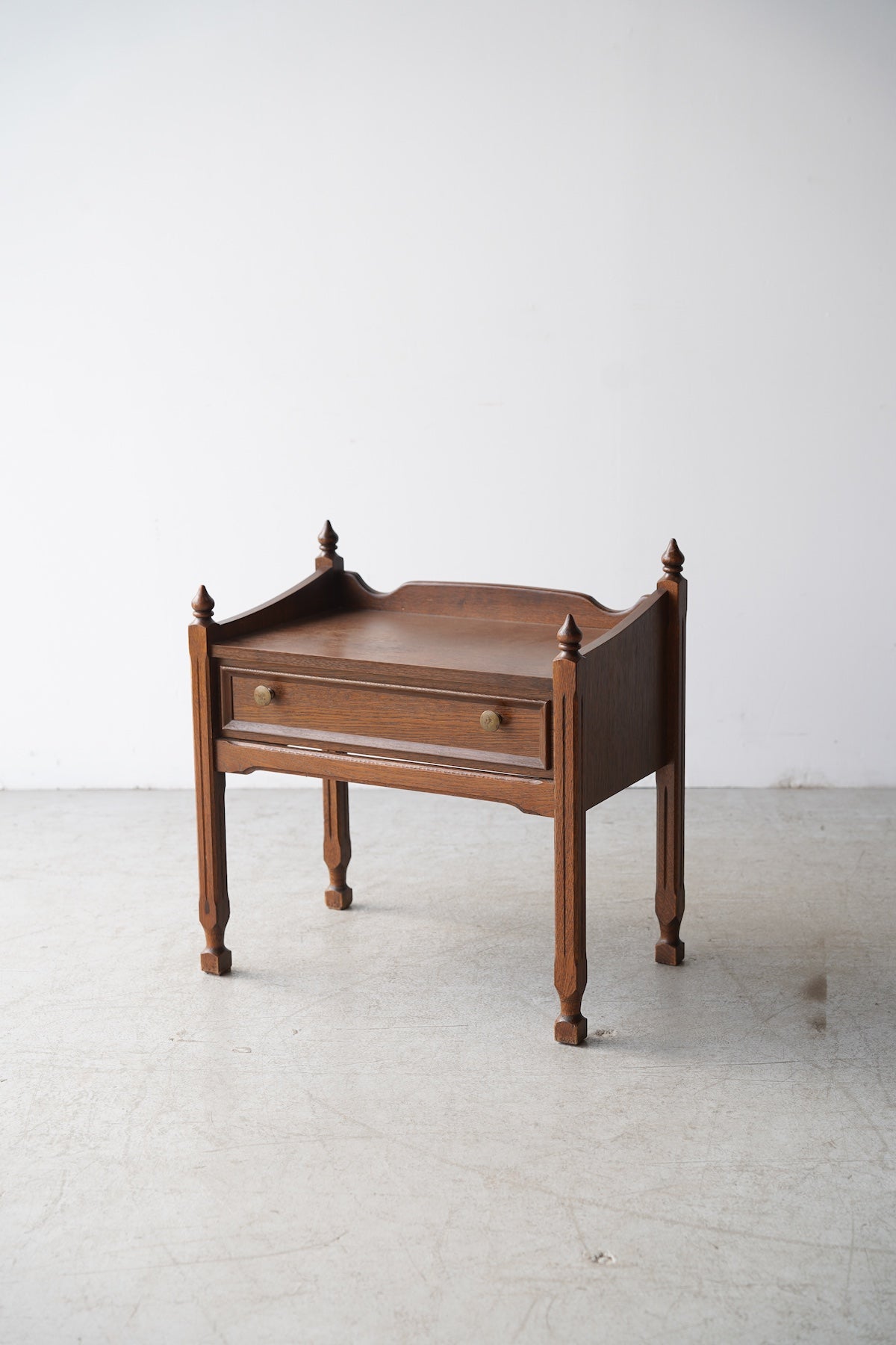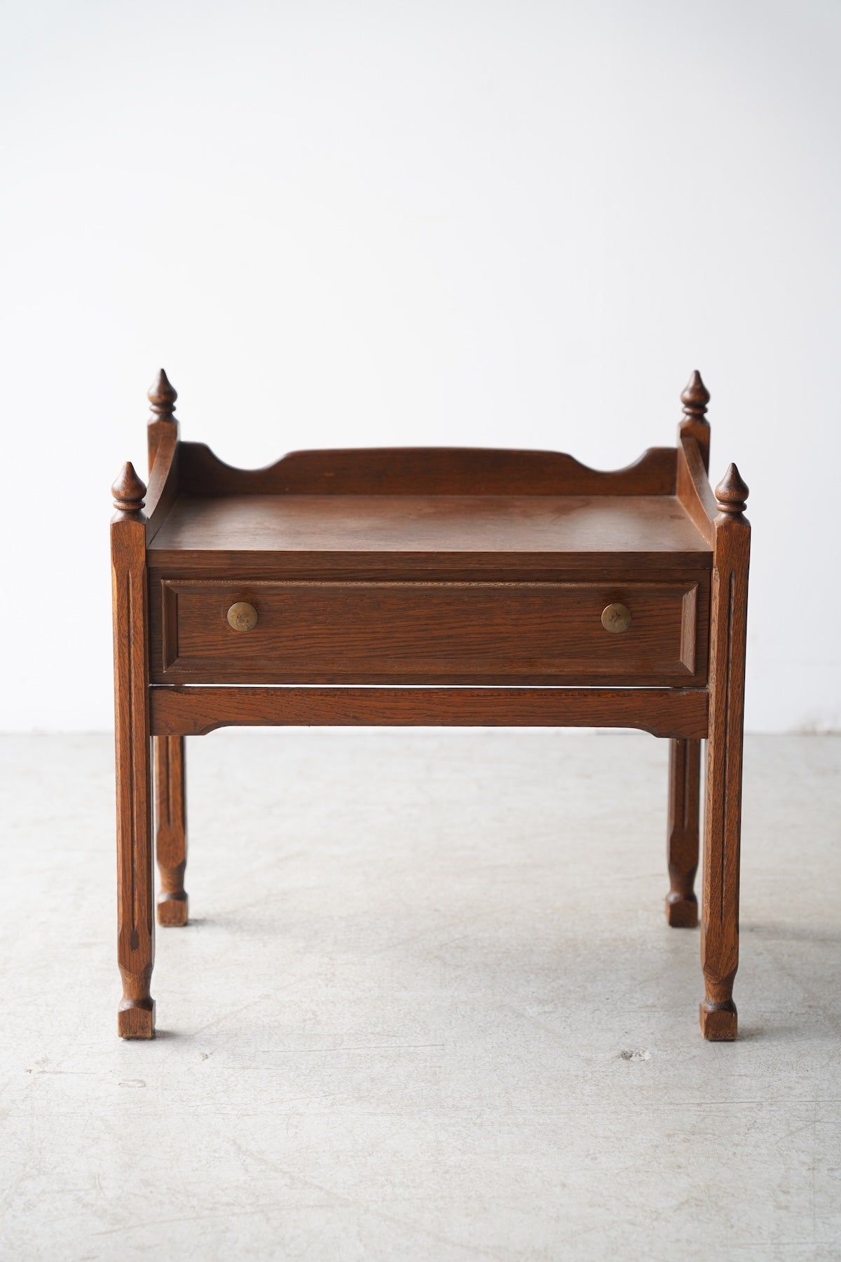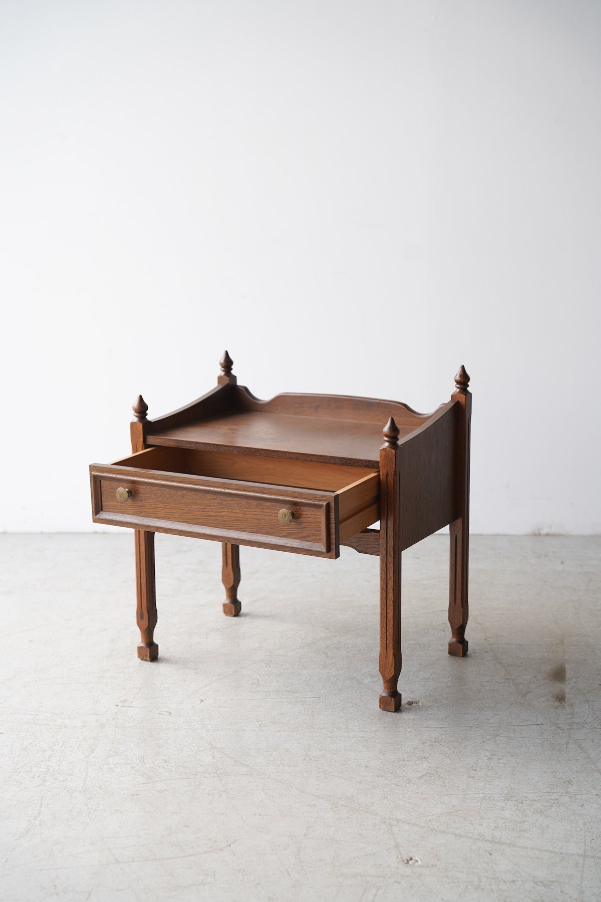 オークウッドの美しい木目と、クラシカルなデザインが目を引くドロワー(引き出し)付きのナイトテーブルです。