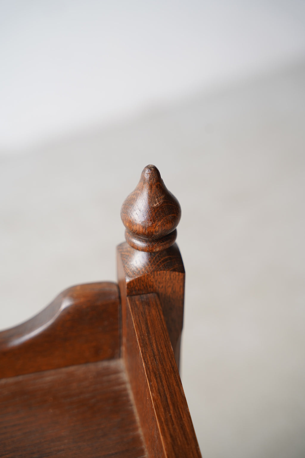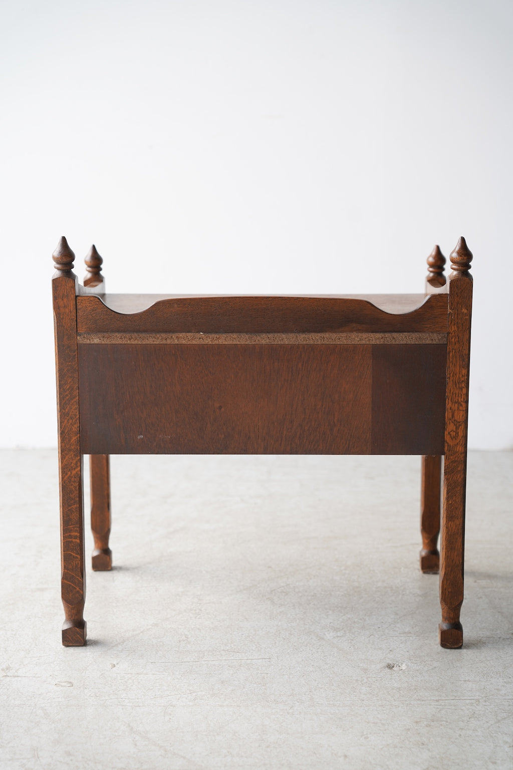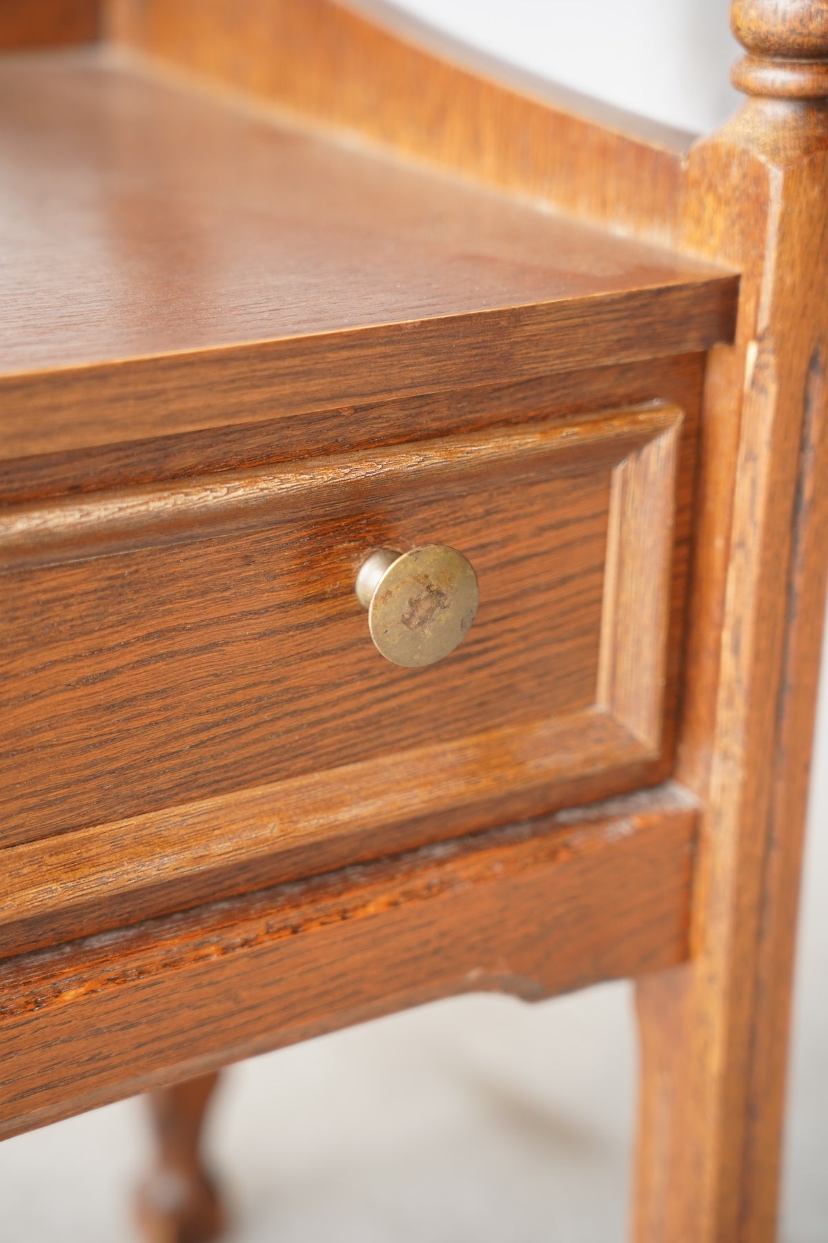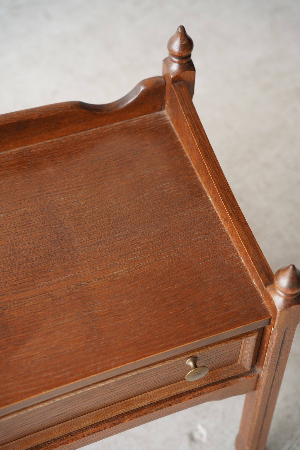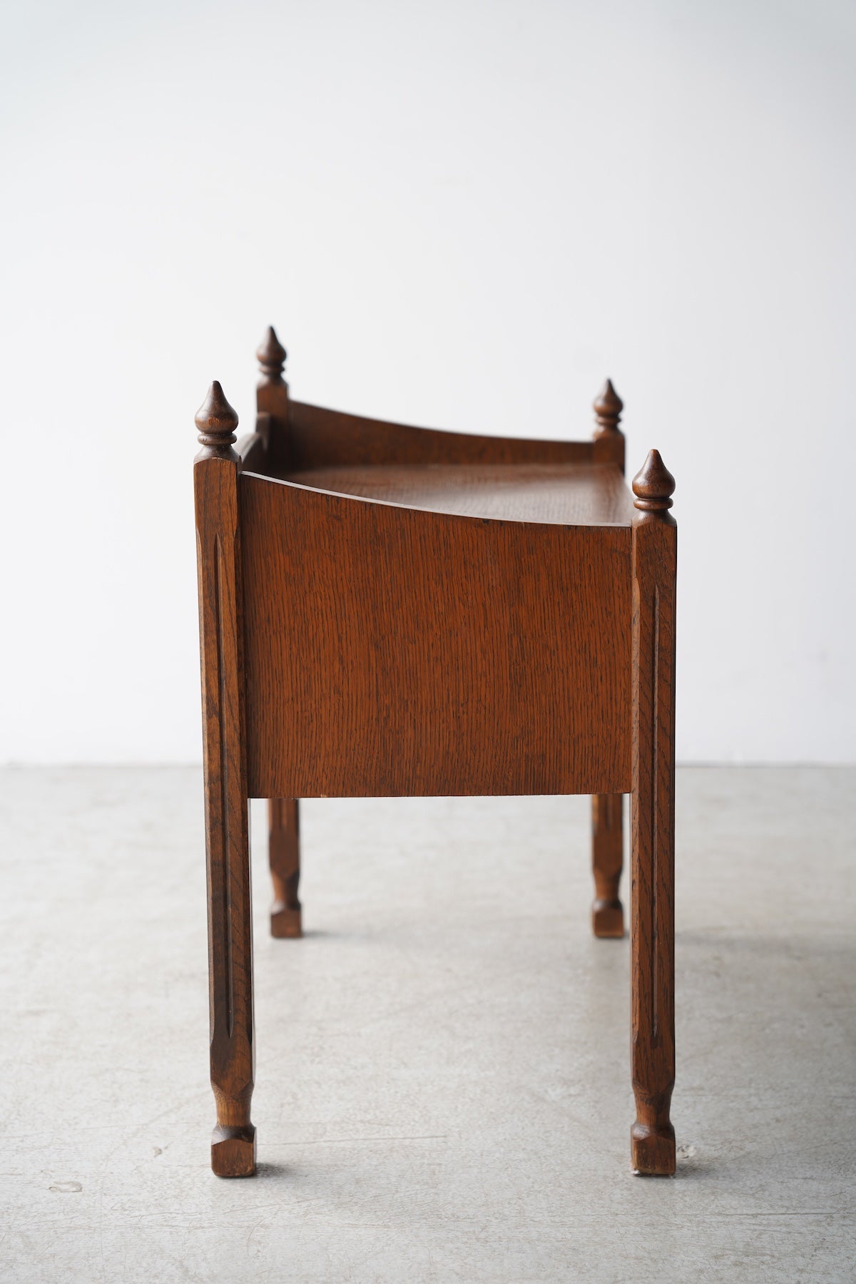 オークウッドの美しい木目と、クラシカルなデザインが目を引くドロワー(引き出し)付きのナイトテーブルです。