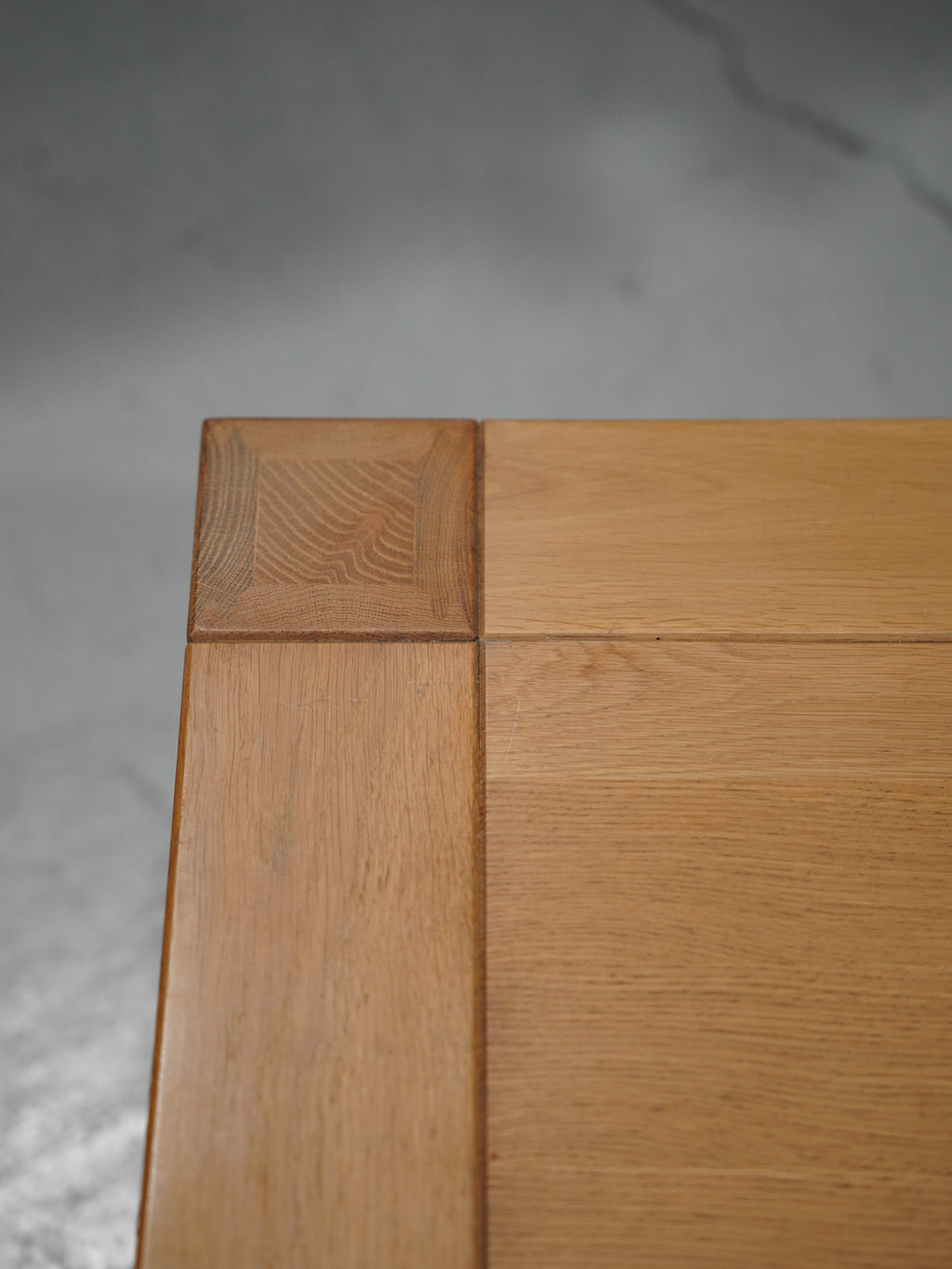 オーク材特有の力強い木目が、装飾のないシンプルなデザインに深みと表情を与えています。そのソリッドな佇まいは、空間に確かな静けさと安定感をもたらします。