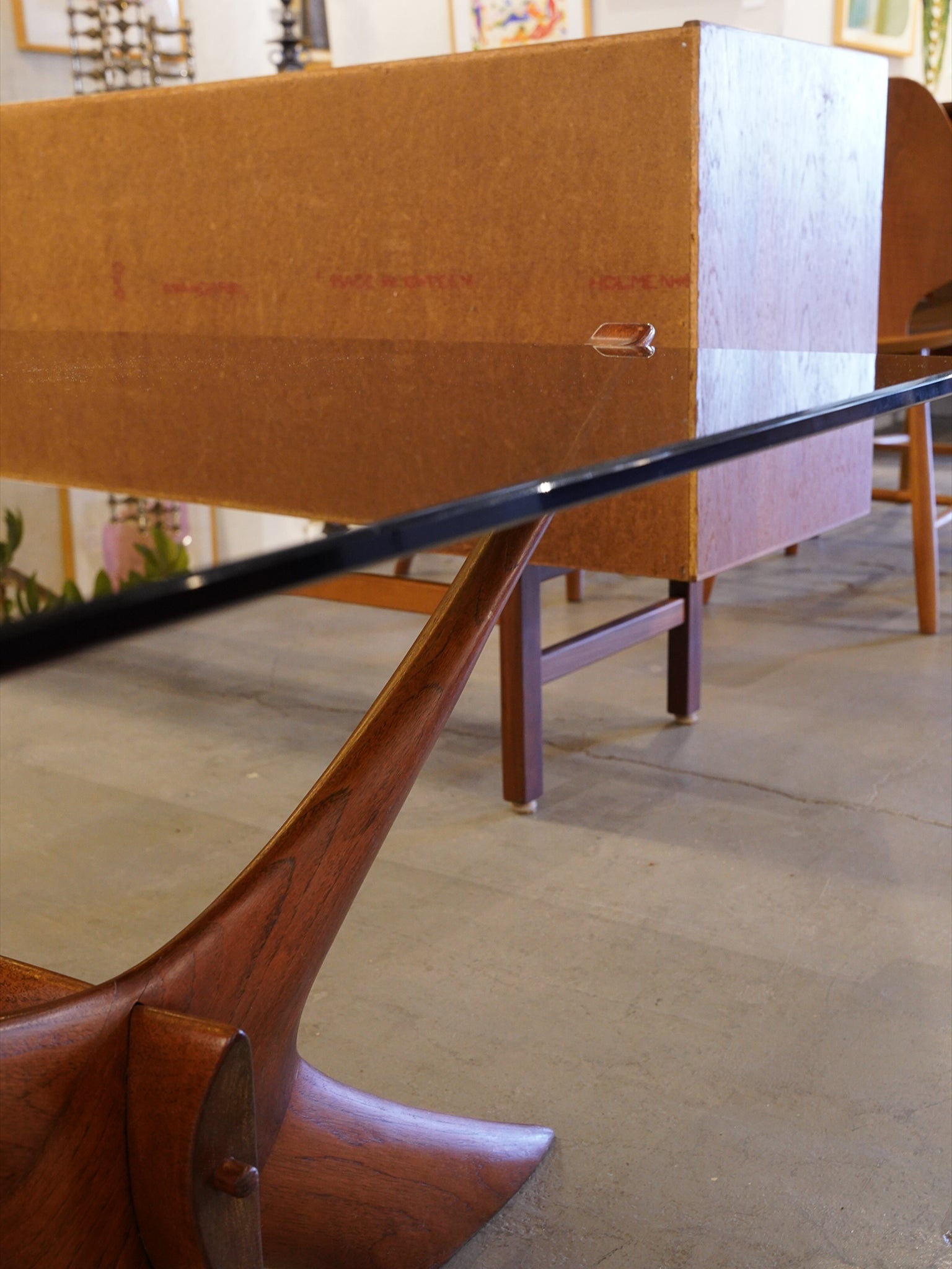 深みのある色調のウッドフレームと、落ち着いたトーンのガラスが織りなすコントラストは、ヴィンテージ家具ならではの知的な品格を漂わせます。