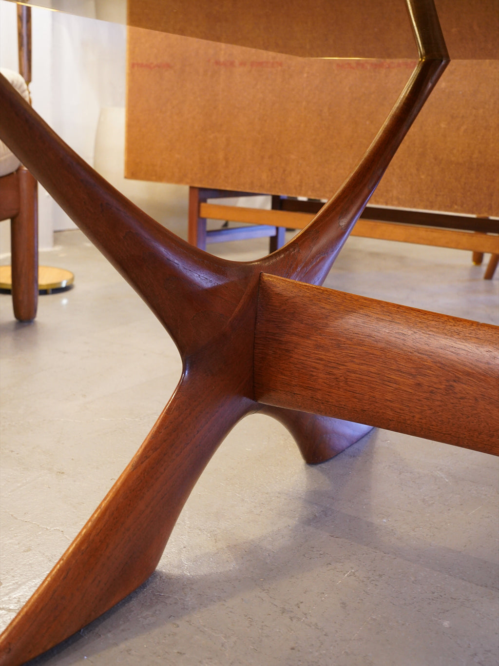 最大の見どころは、彫刻作品を彷彿とさせる有機的なX字型のベースデザインにあります。滑らかで力強い曲線は、北欧の優れた職人技を象徴しており、どの角度から眺めても完璧なプロポーションを誇ります。また、厚みのあるスモークガラス天板を採用することで、この芸術的な脚部の構造を遮ることなく視覚的に愉しめるよう設計されており、重厚感がありながらも空間を軽やかに彩ります。
