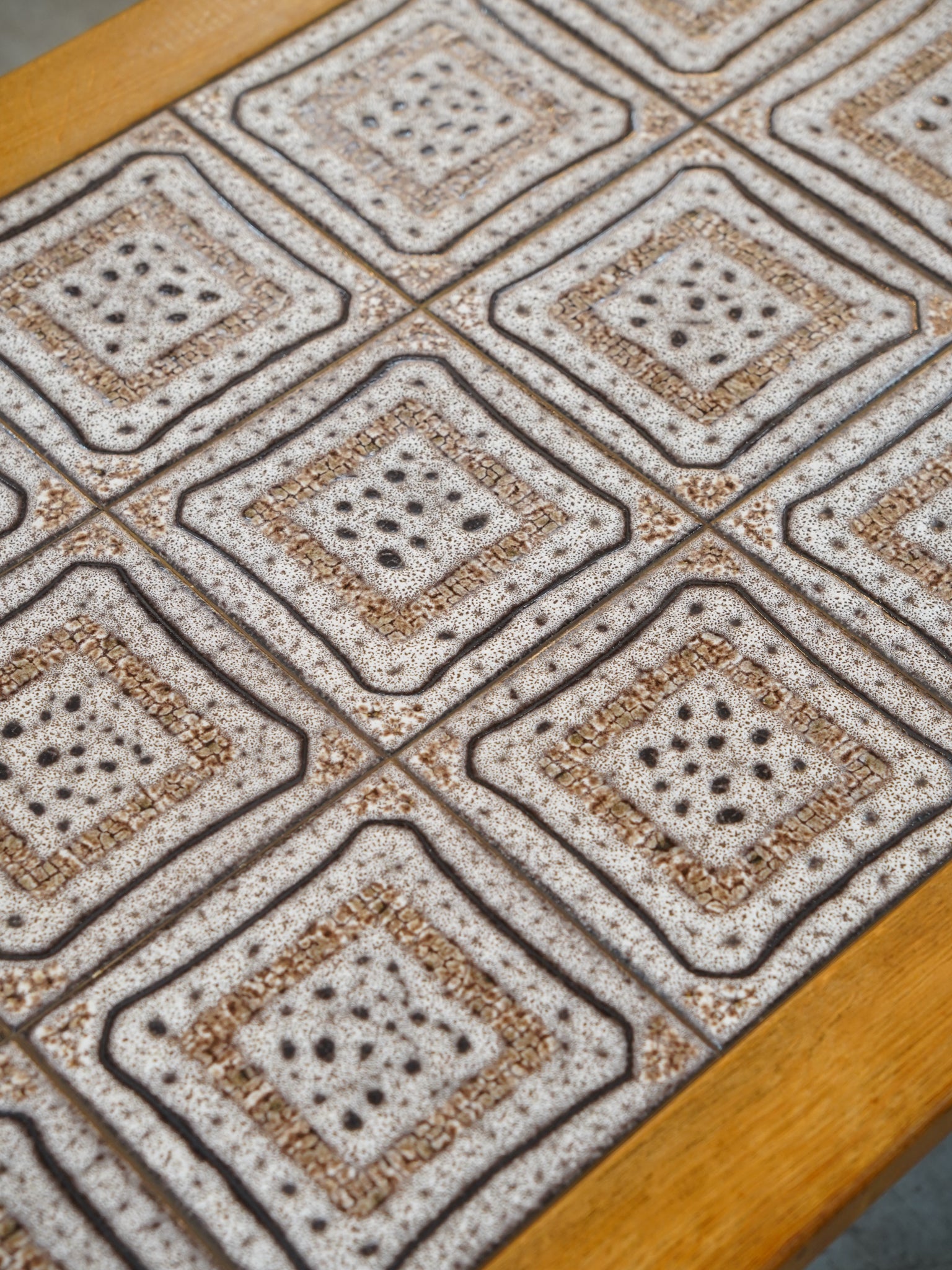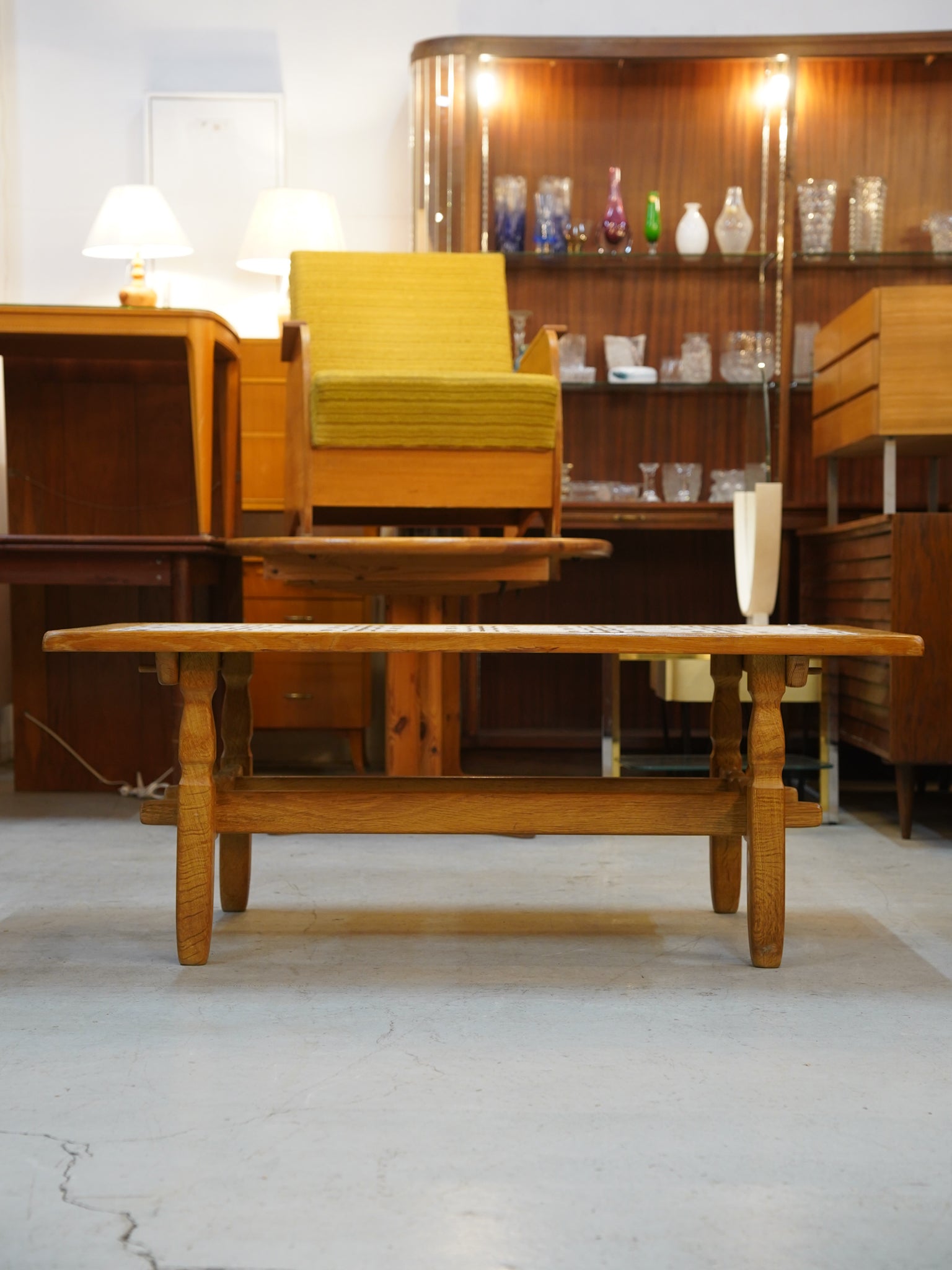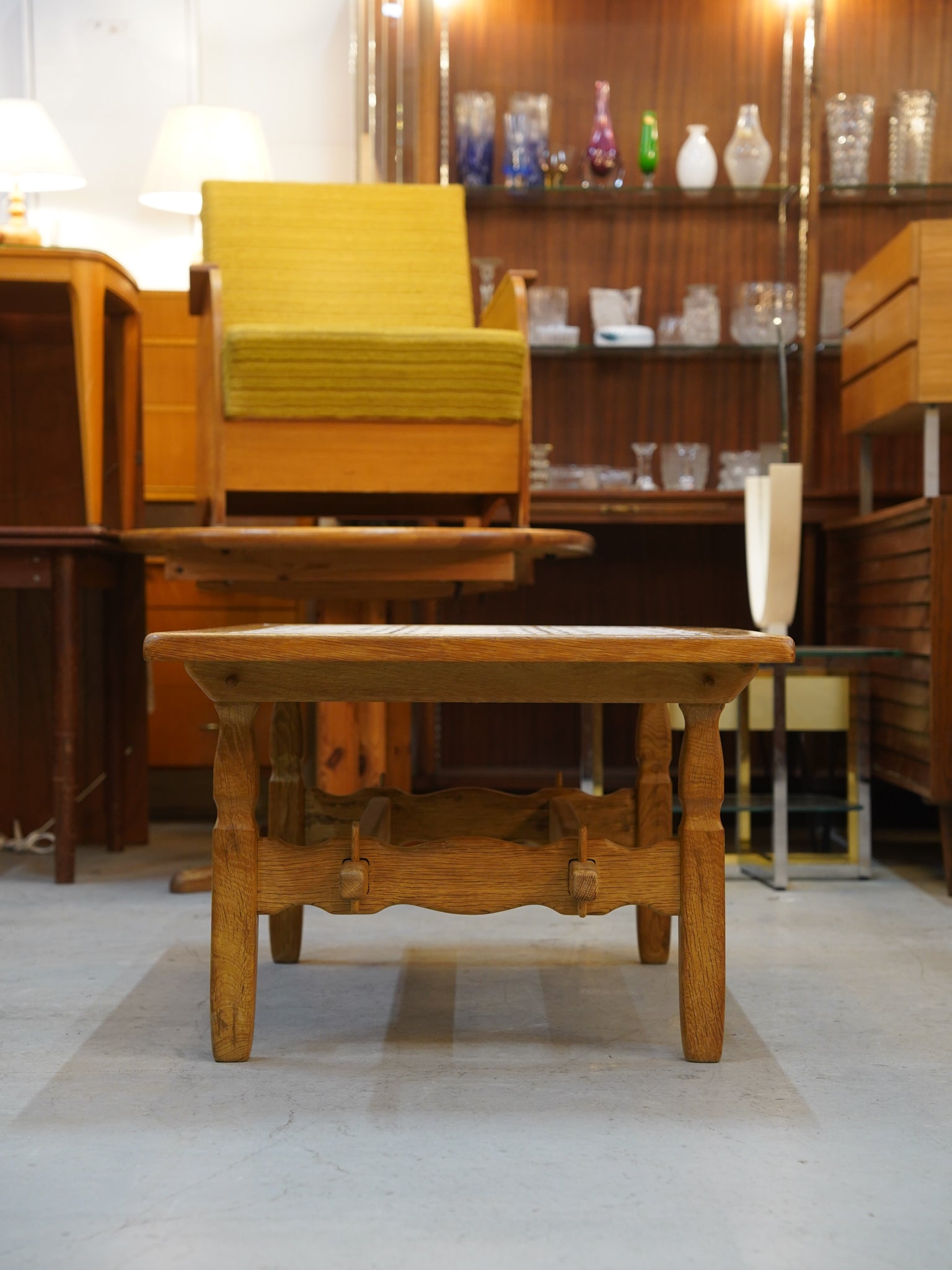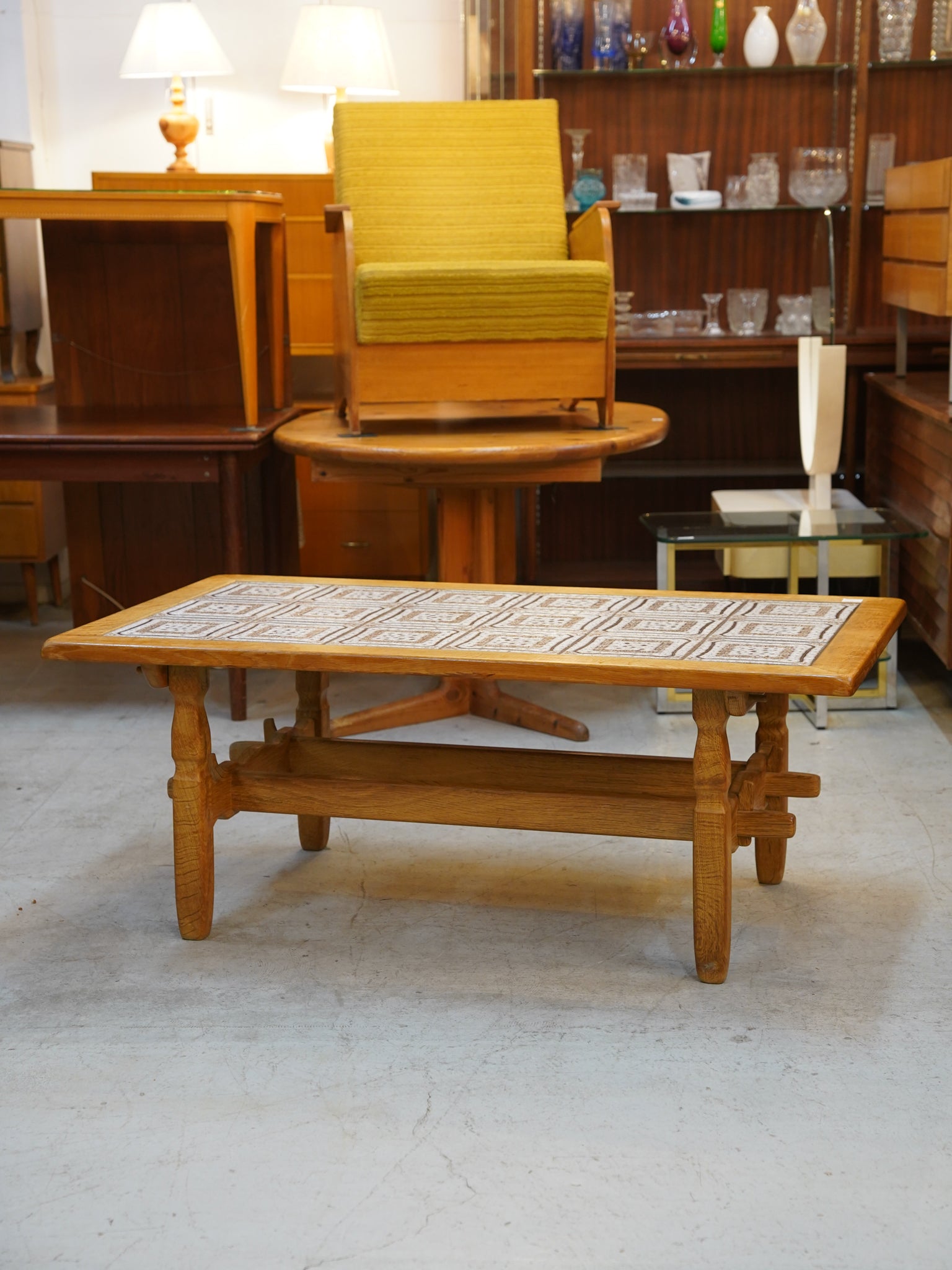 明るく穏やかな木色のオーク無垢材を贅沢に使用し、天板中央にヴィンテージ特有の幾何学タイルを配したコーヒーテーブルです。