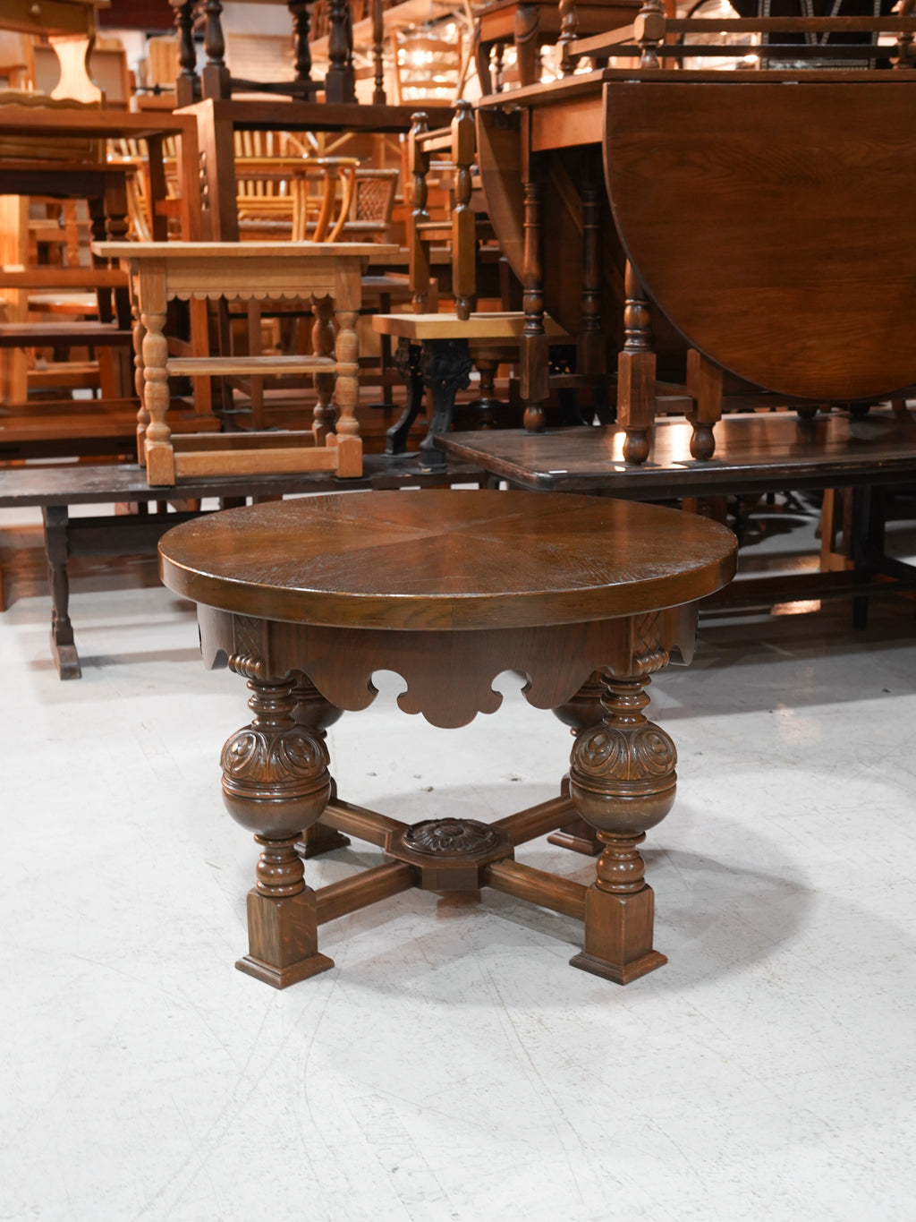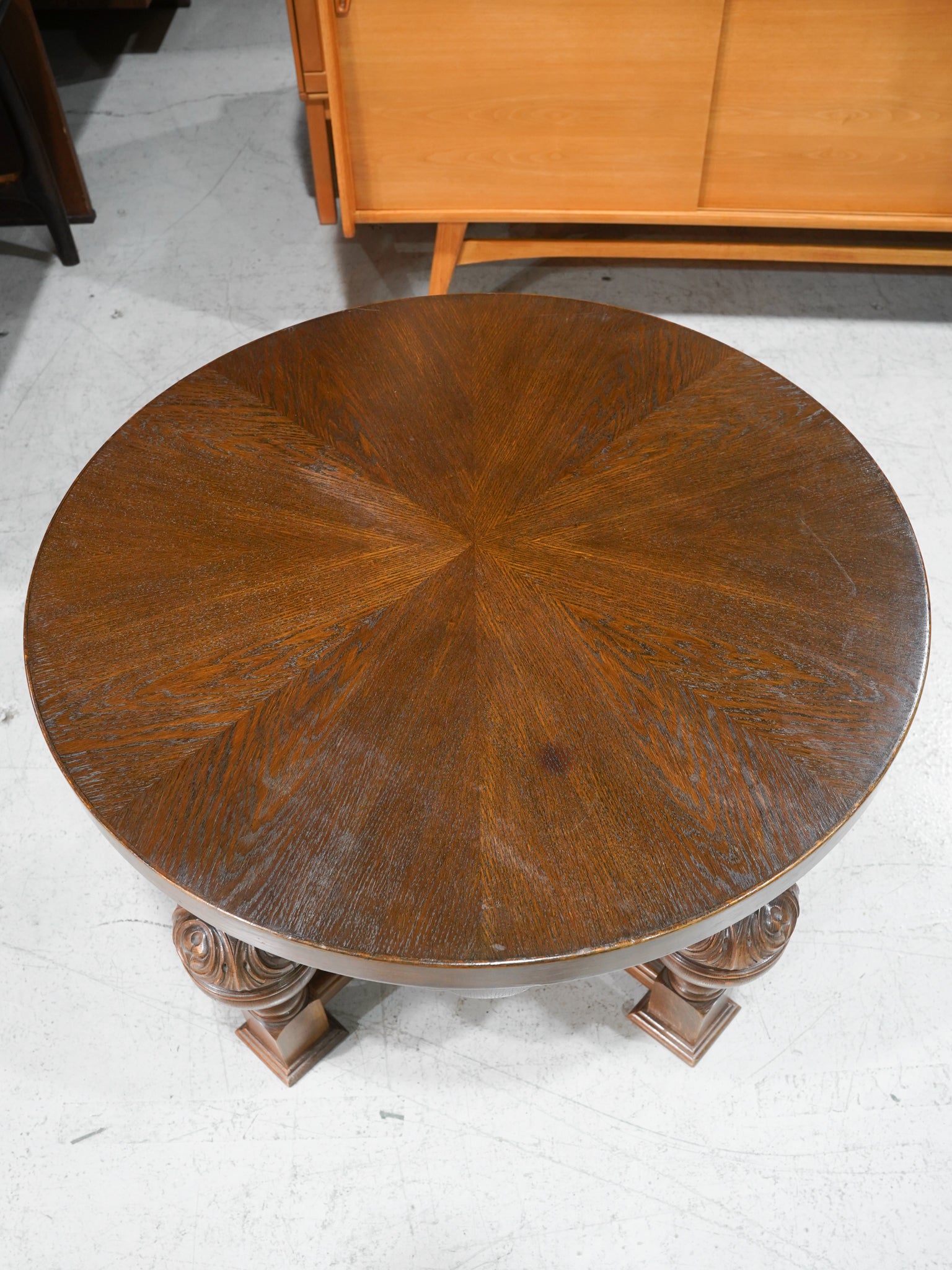 深みのある色調と、力強く緻密なダークウッドの質感が、空間に圧倒的な落ち着きをもたらすラウンドテーブルです。