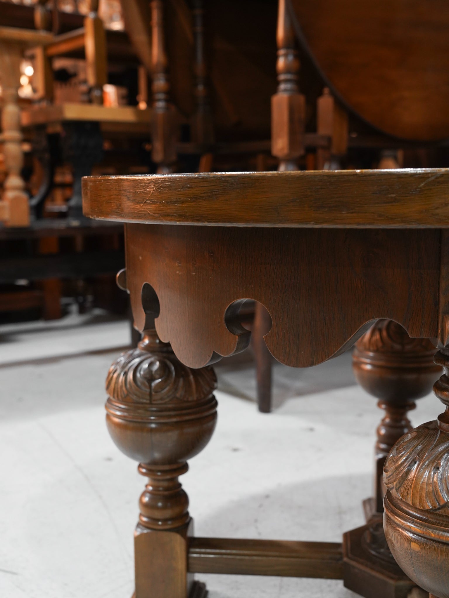 天板から脚部に至るまで贅沢に施された装飾は、見る角度によって異なる陰影を生み出し、クラシック家具特有のドラマチックな表情を演出します。