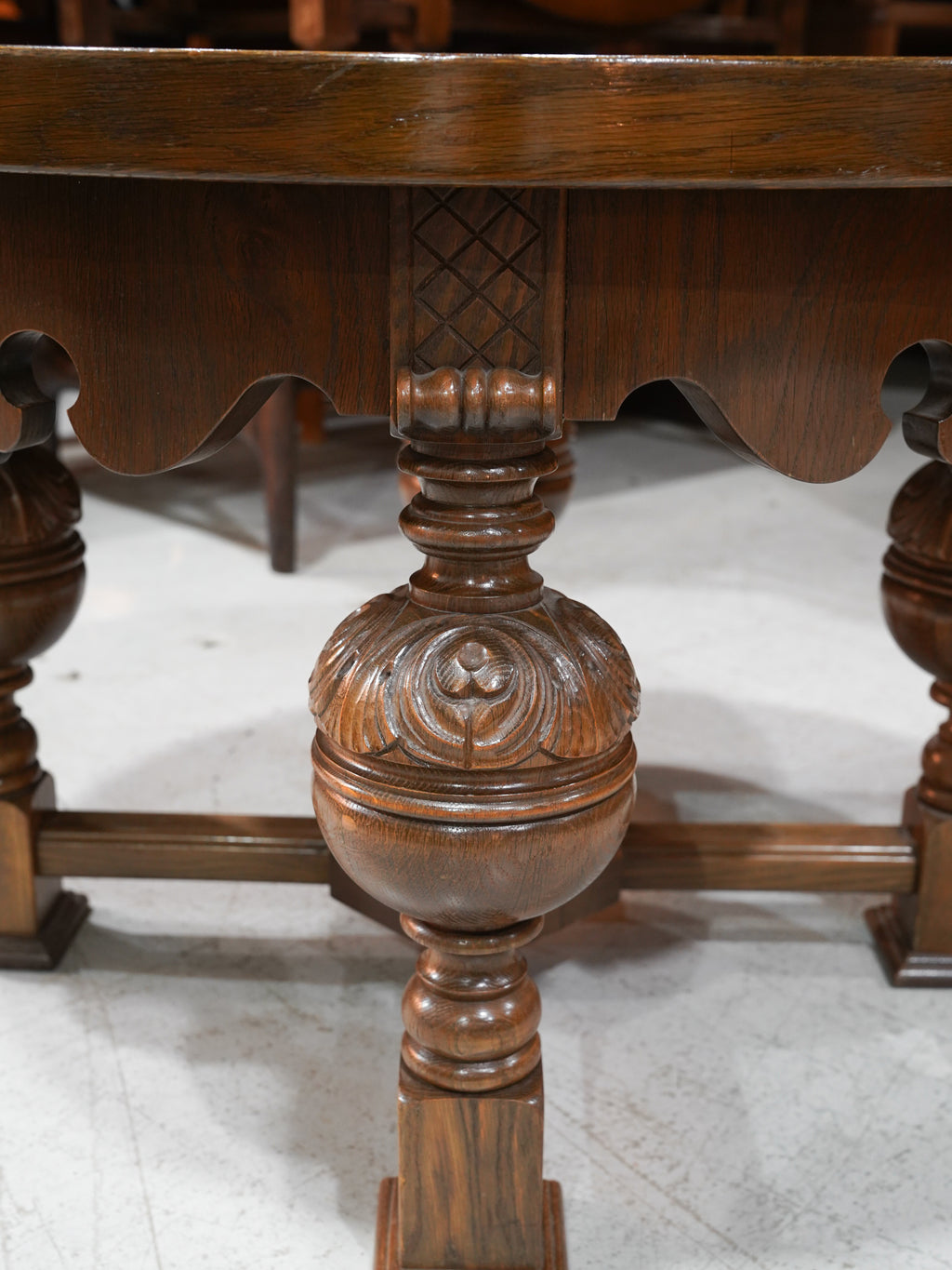 手作業による精緻な彫り込みが施された脚部は、どっしりとした安定感と共に、空間に華やかなアクセントを添えています。