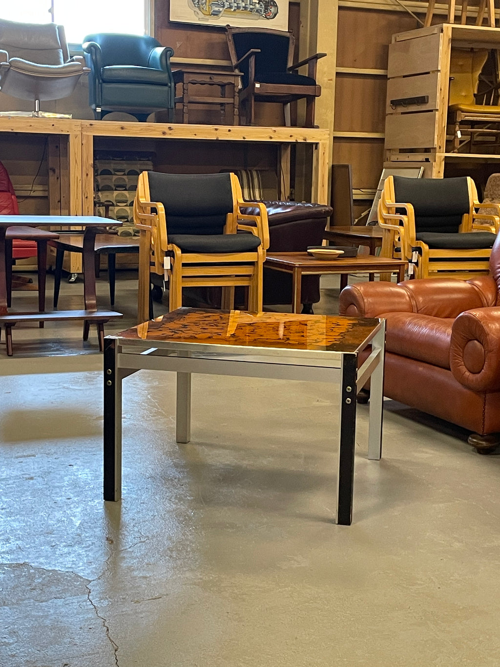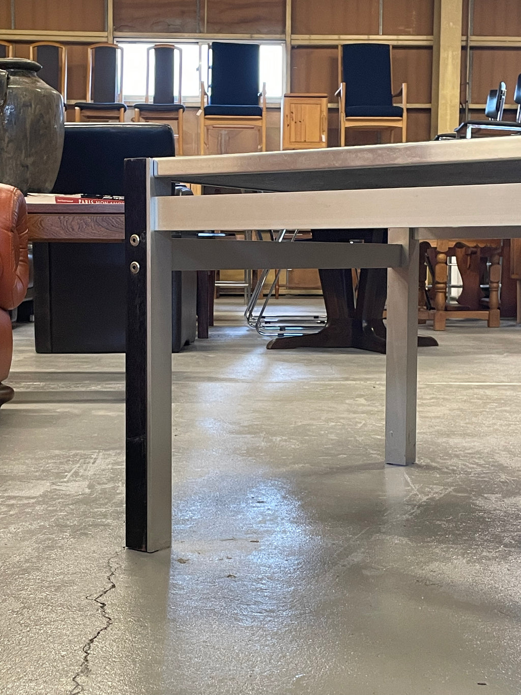 直線的でスタイリッシュなフォルムは、レザーソファなどのヴィンテージ家具とも相性抜群。リビングのコーヒーテーブルとしてはもちろん、アパレル等の店舗什器としても空間を格上げしてくれます。