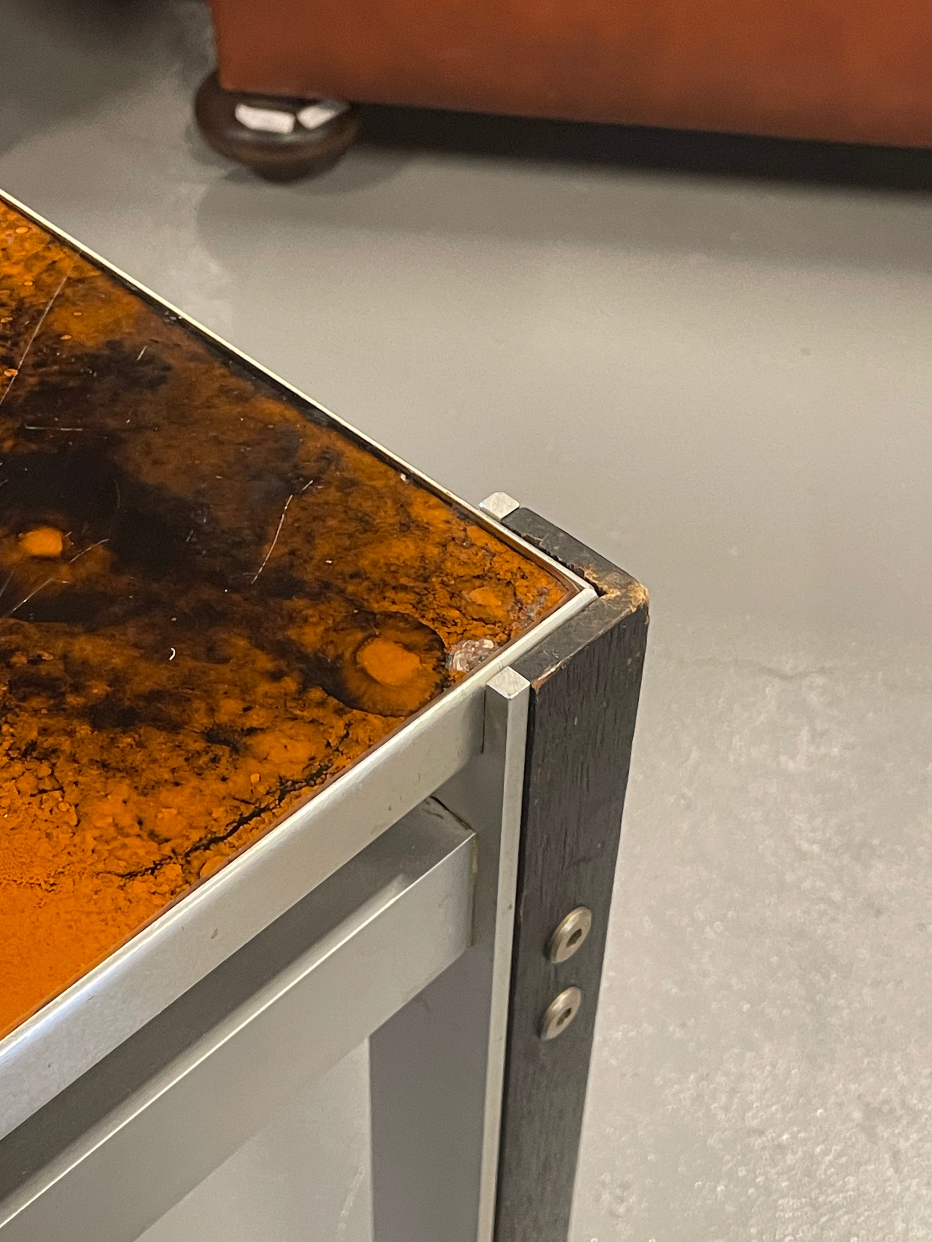 天板の艶やかなガラス、重厚感のあるウッド、そしてシャープなアルミニウムの脚部という異素材の絶妙な組み合わせが、ミッドセンチュリー期ならではの洗練されたモダンデザインを体現しています。光の当たり方や見る角度によって表情を変えるガラストップは、空間に唯一無二の存在感を放ちます。