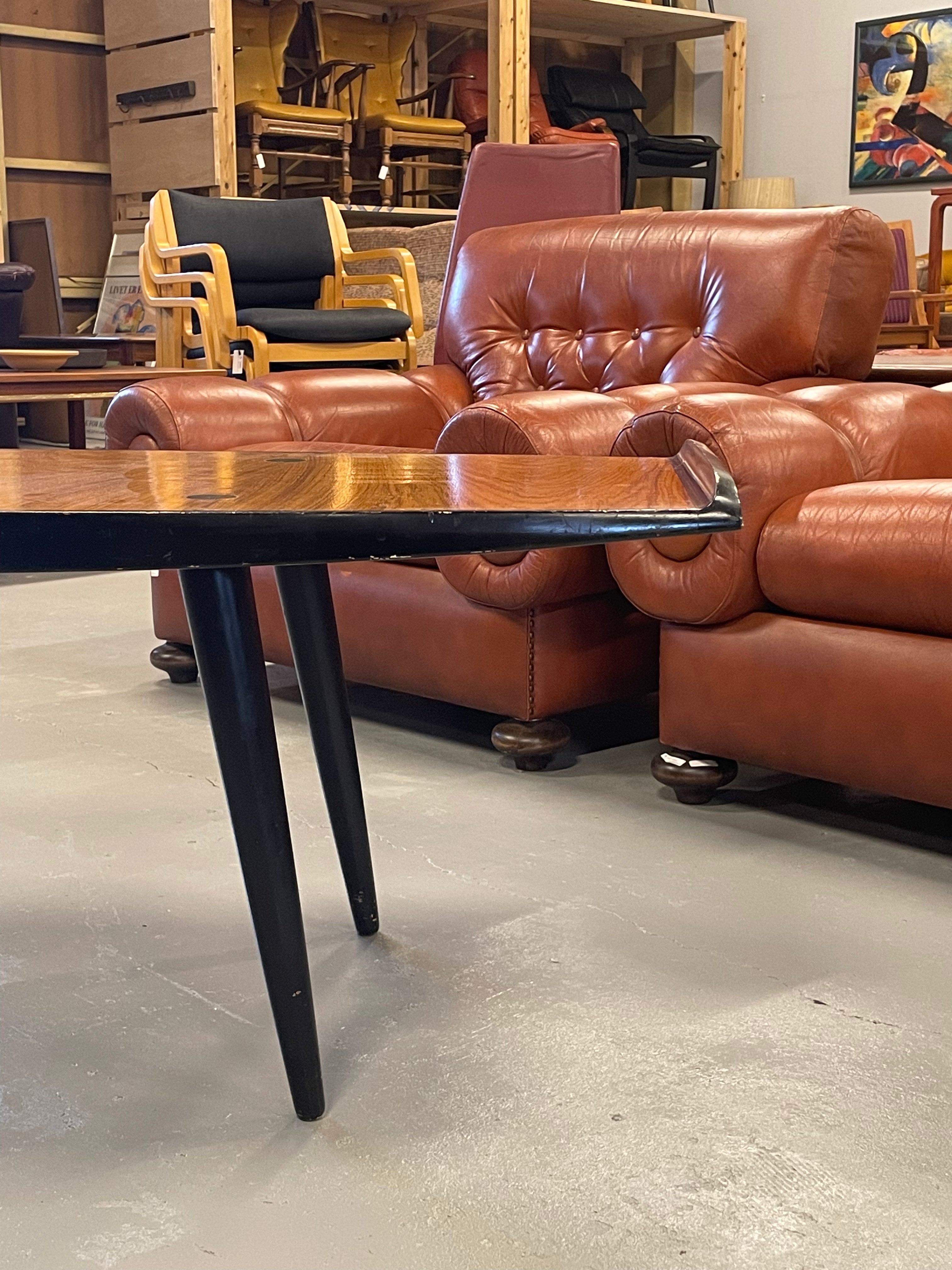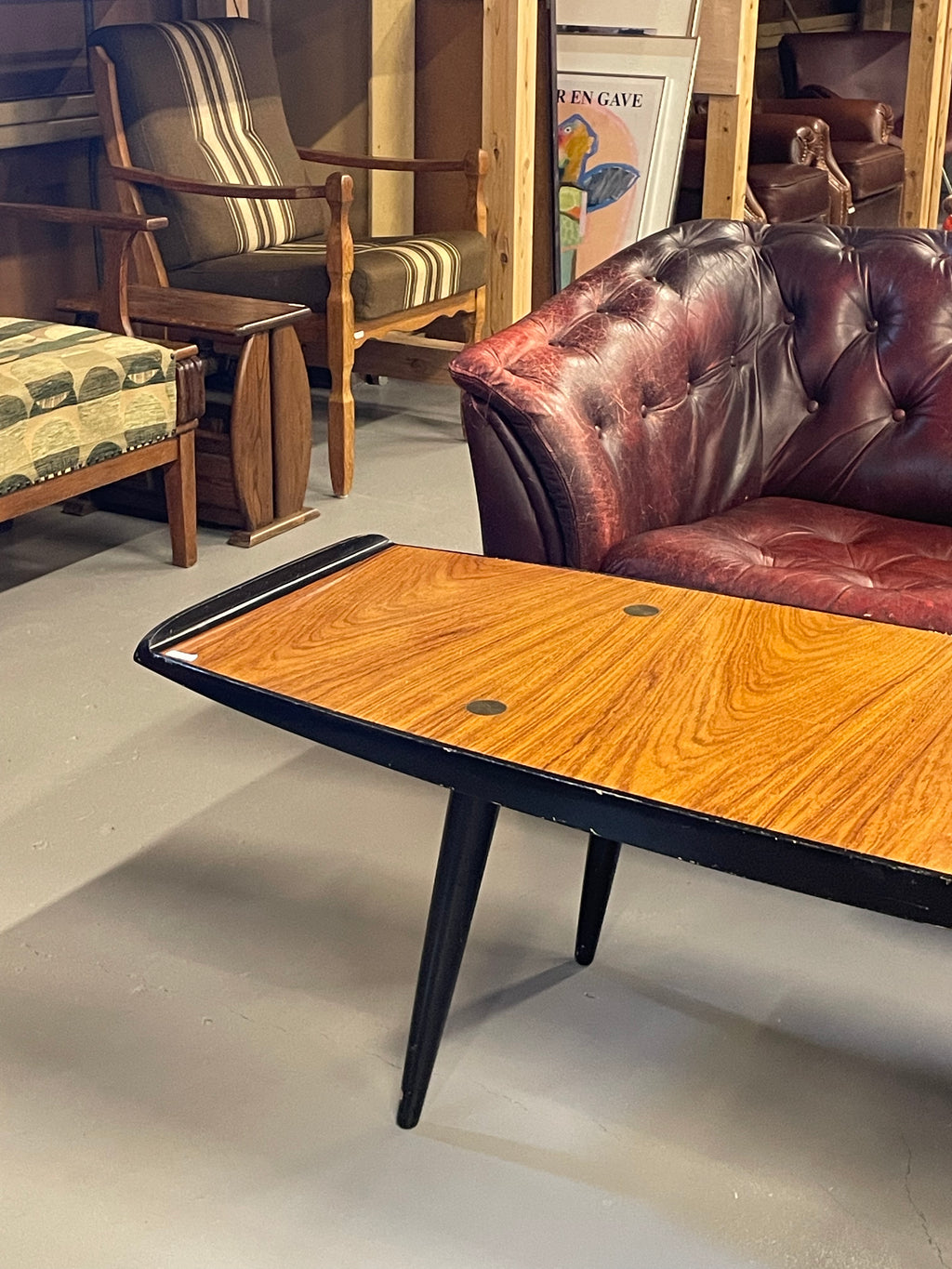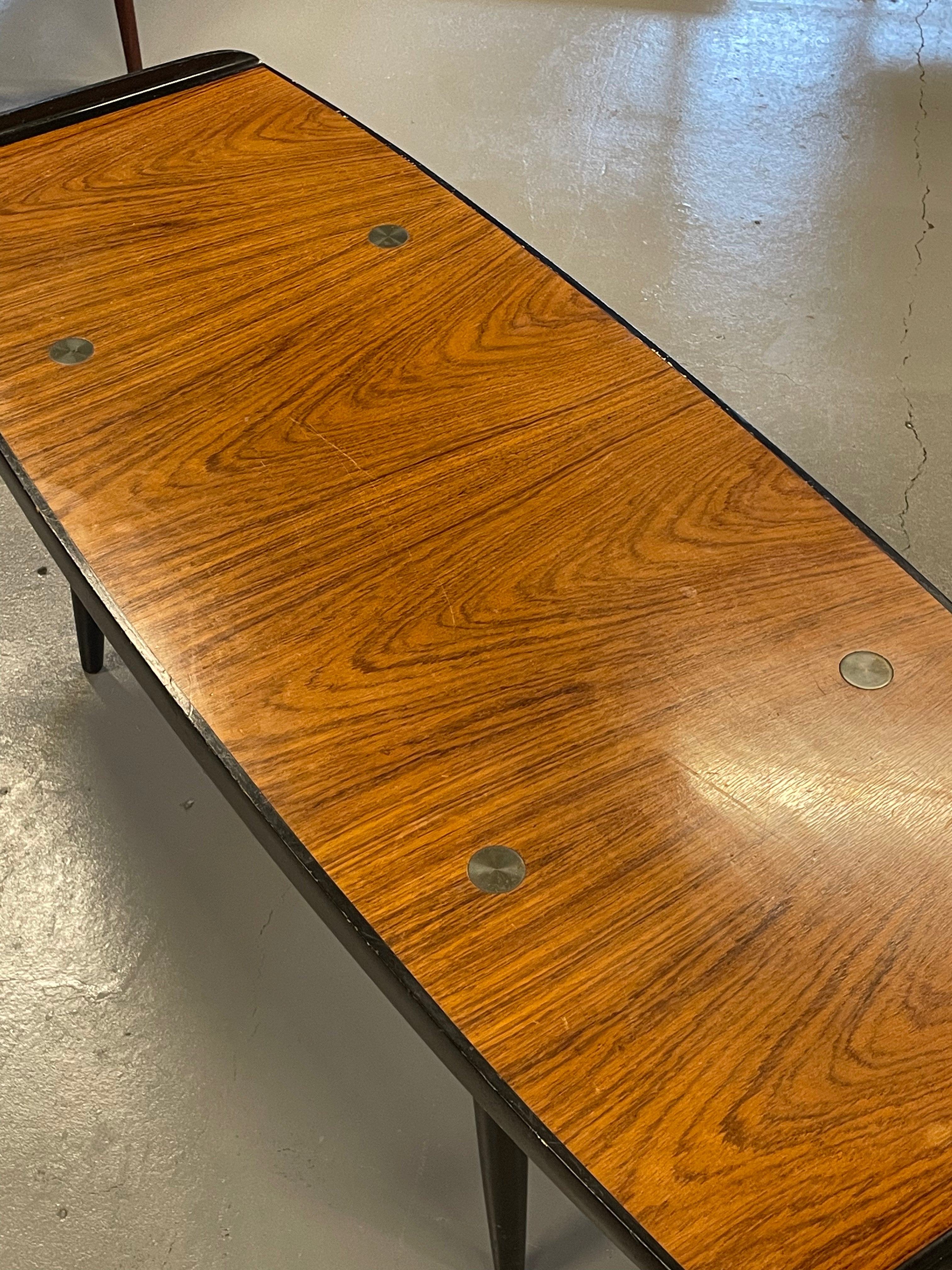 美しいチーク材の木目と、縁取りや脚部にあしらわれたブラックのコントラストが目を惹く、Treman社製のヴィンテージ・コーヒーテーブルです。