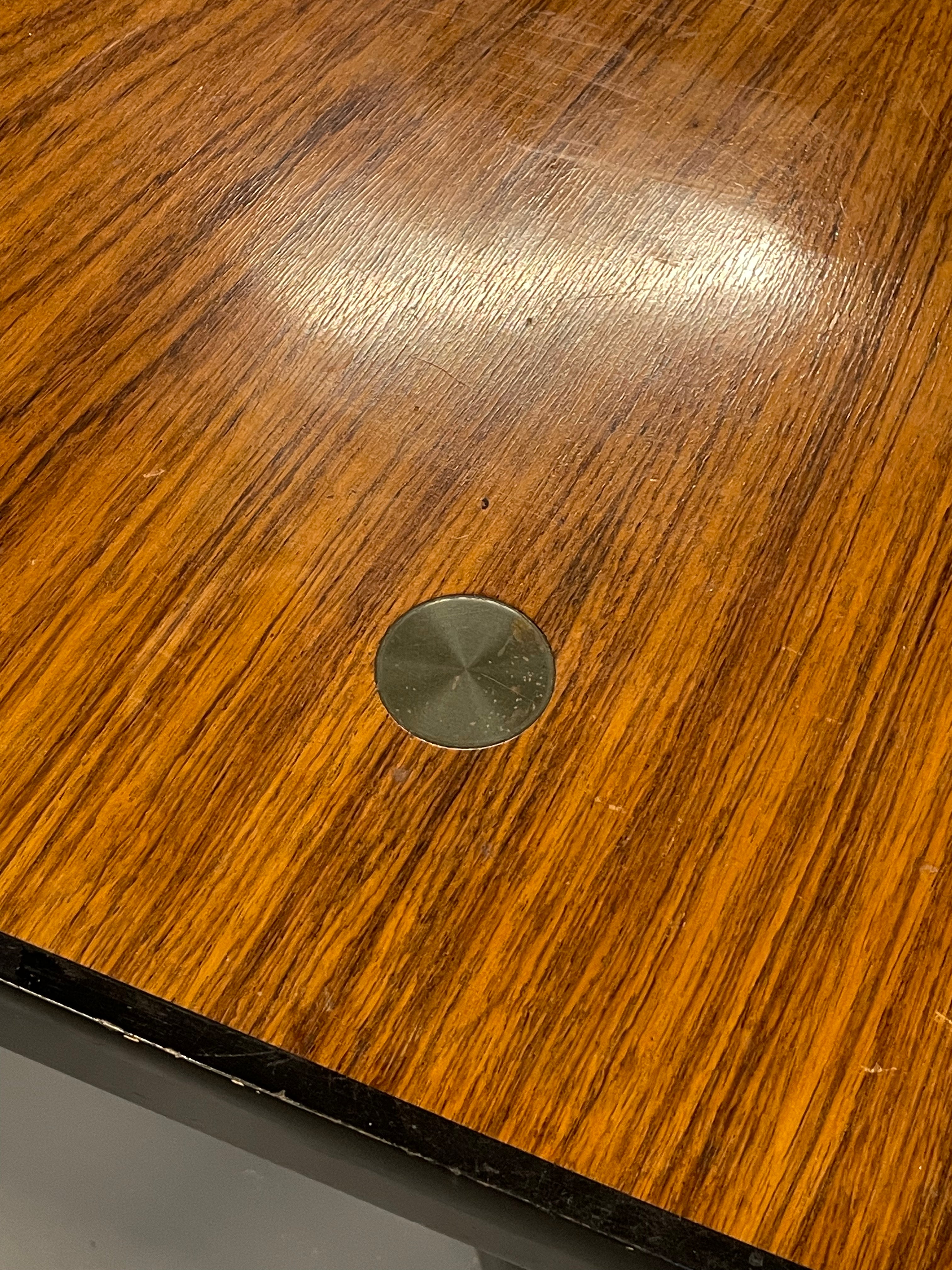天板にはアクセントとして円形のメタルパーツが埋め込まれており、ミッドセンチュリー期らしい遊び心と洗練されたモダンデザインを感じさせます。エッジの効いたブラックのラインが、お部屋の空間をグッと引き締めてくれます。