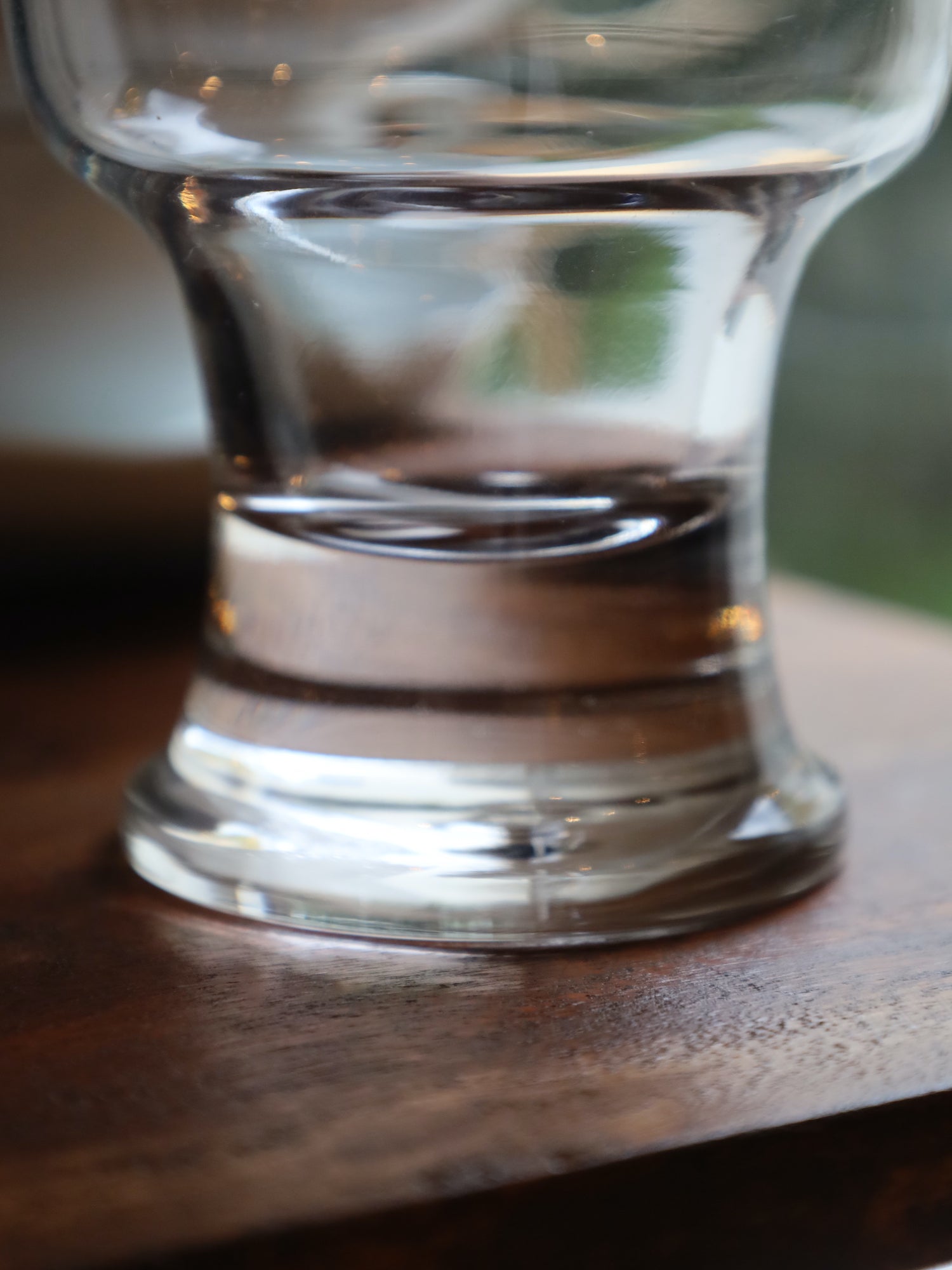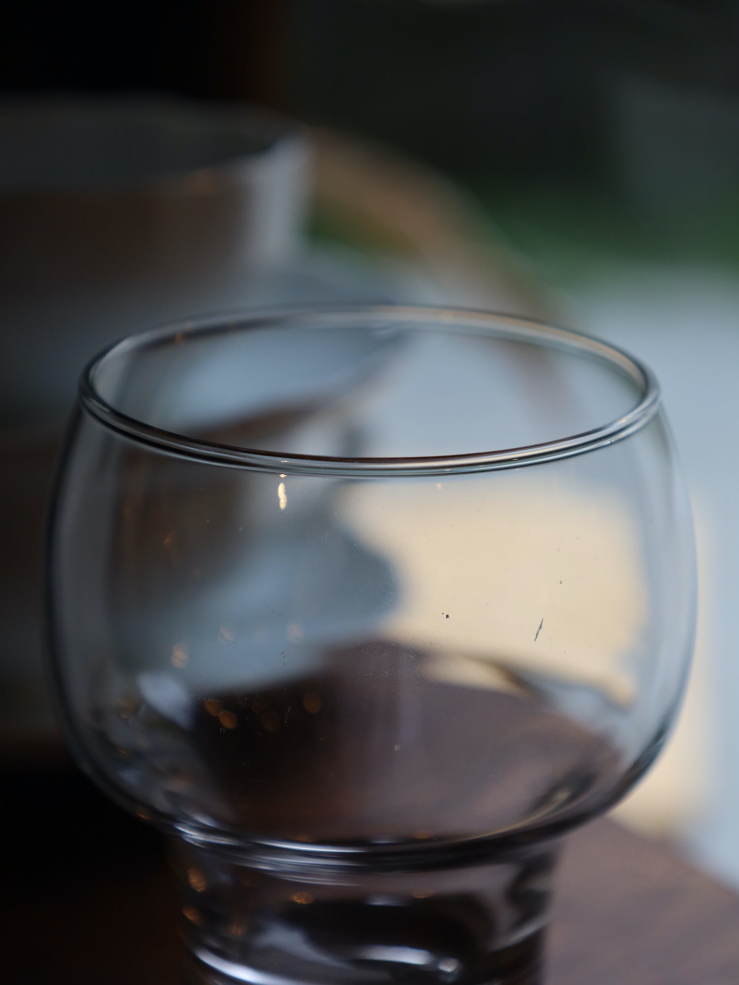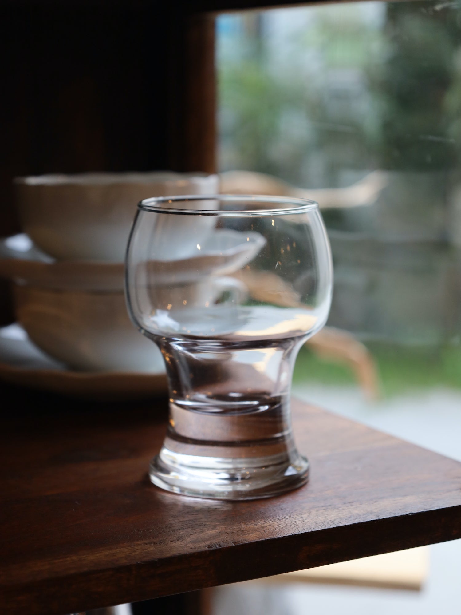 厚手のガラスが醸し出す重厚感と、丸く膨らんだ上部のデザインは、かつてのテイスティンググラスを思わせる、香りや味わいを意識した設計です。レトロながらもモダンな佇まいは、現在のライフスタイルにも自然に溶け込みます。
