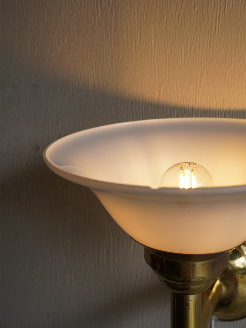 ラッパ型に広がるフロストガラスのシェードは、光を優しく拡散し、壁面に美しい間接照明の陰影を描き出します。眩しすぎない穏やかな光は、寝室のベッドサイドや廊下、リビングの間接照明として理想的。