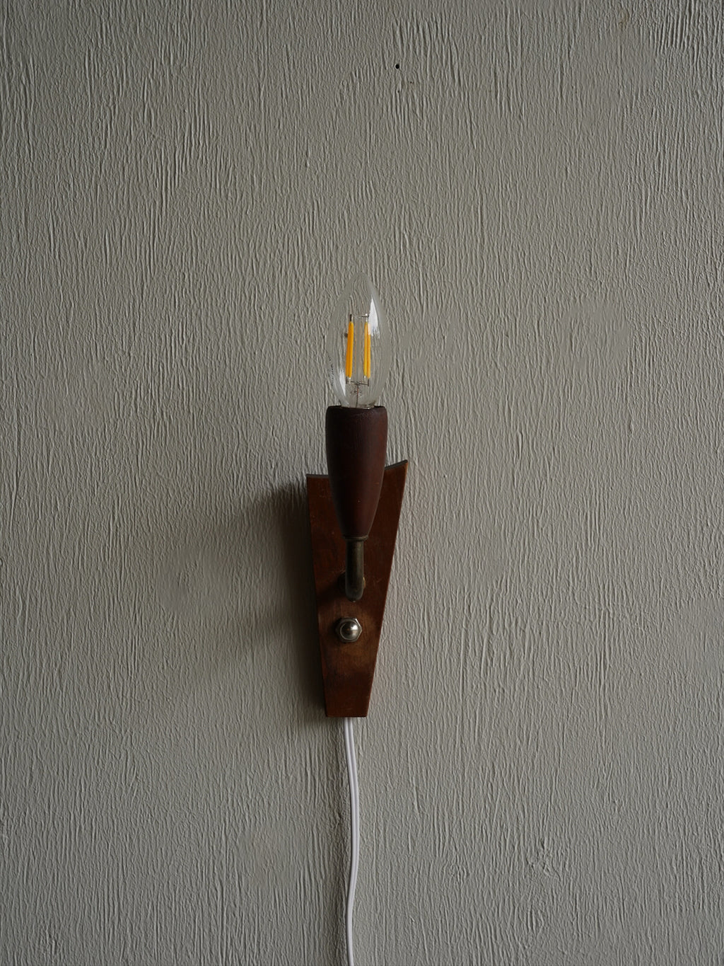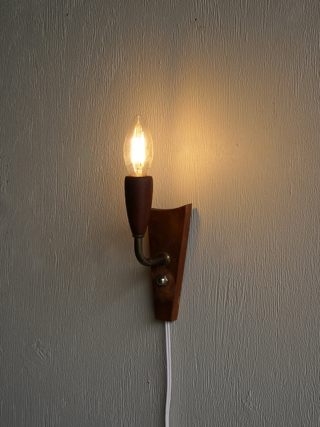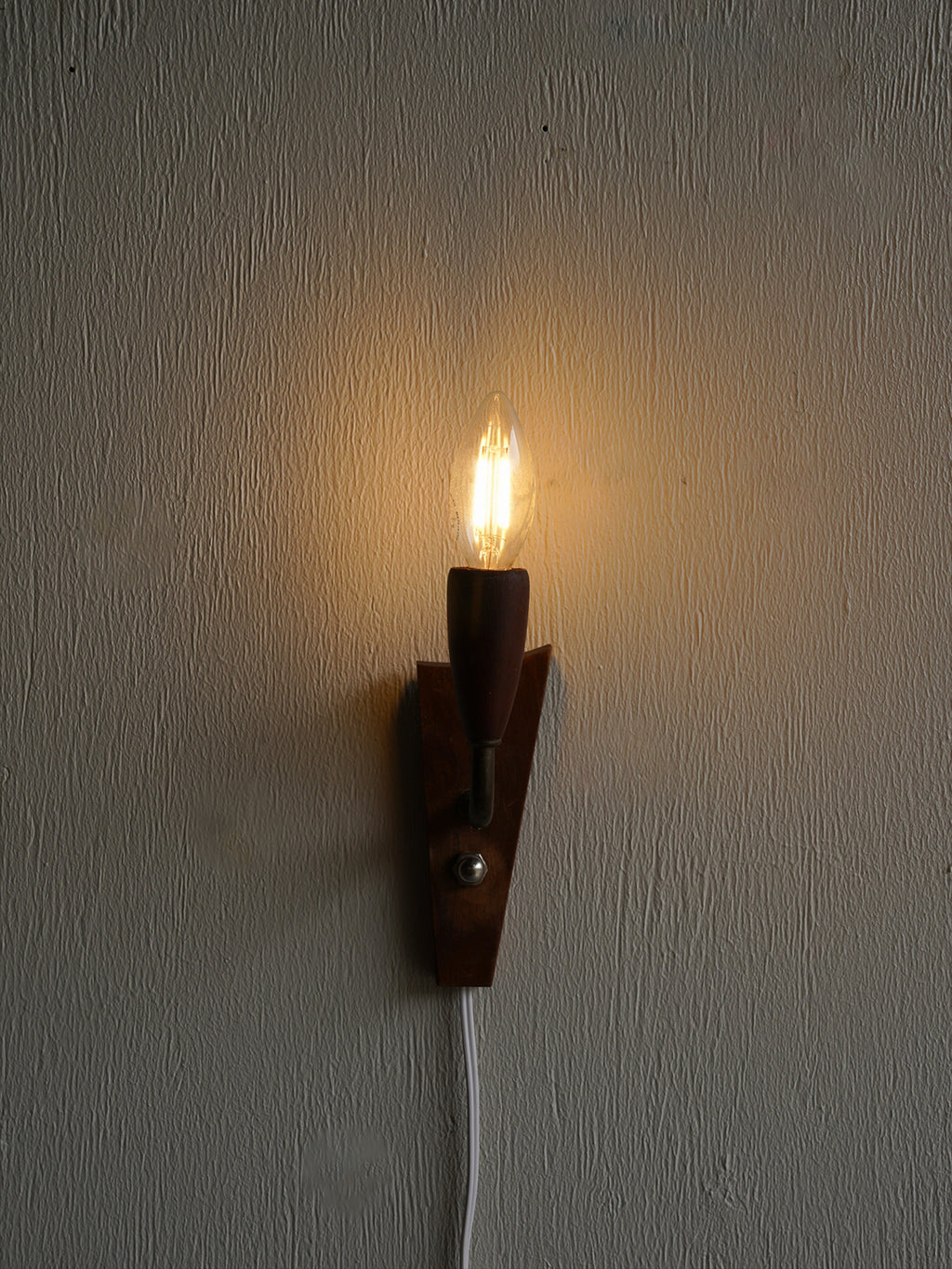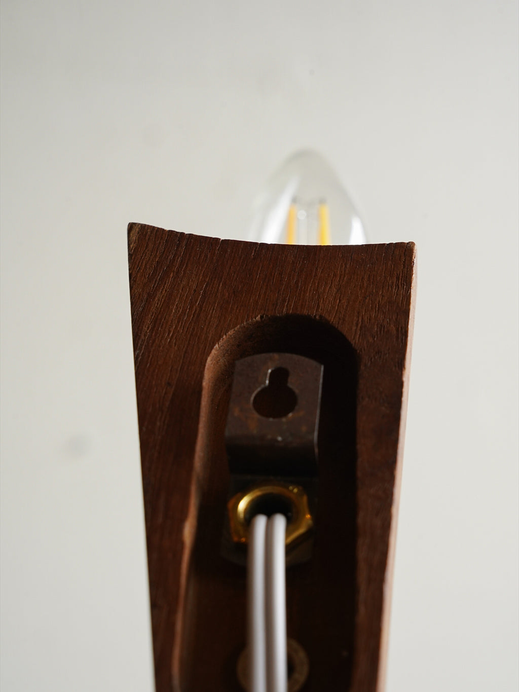 ベース部分は、温かみのある木目が美しいチーク材で、壁面に溶け込むようなミニマルな三角形状にカットされています。そこから伸びるアームは、真鍮製で、しなやかな曲線を描きながら上部のソケットへと繋がっています。