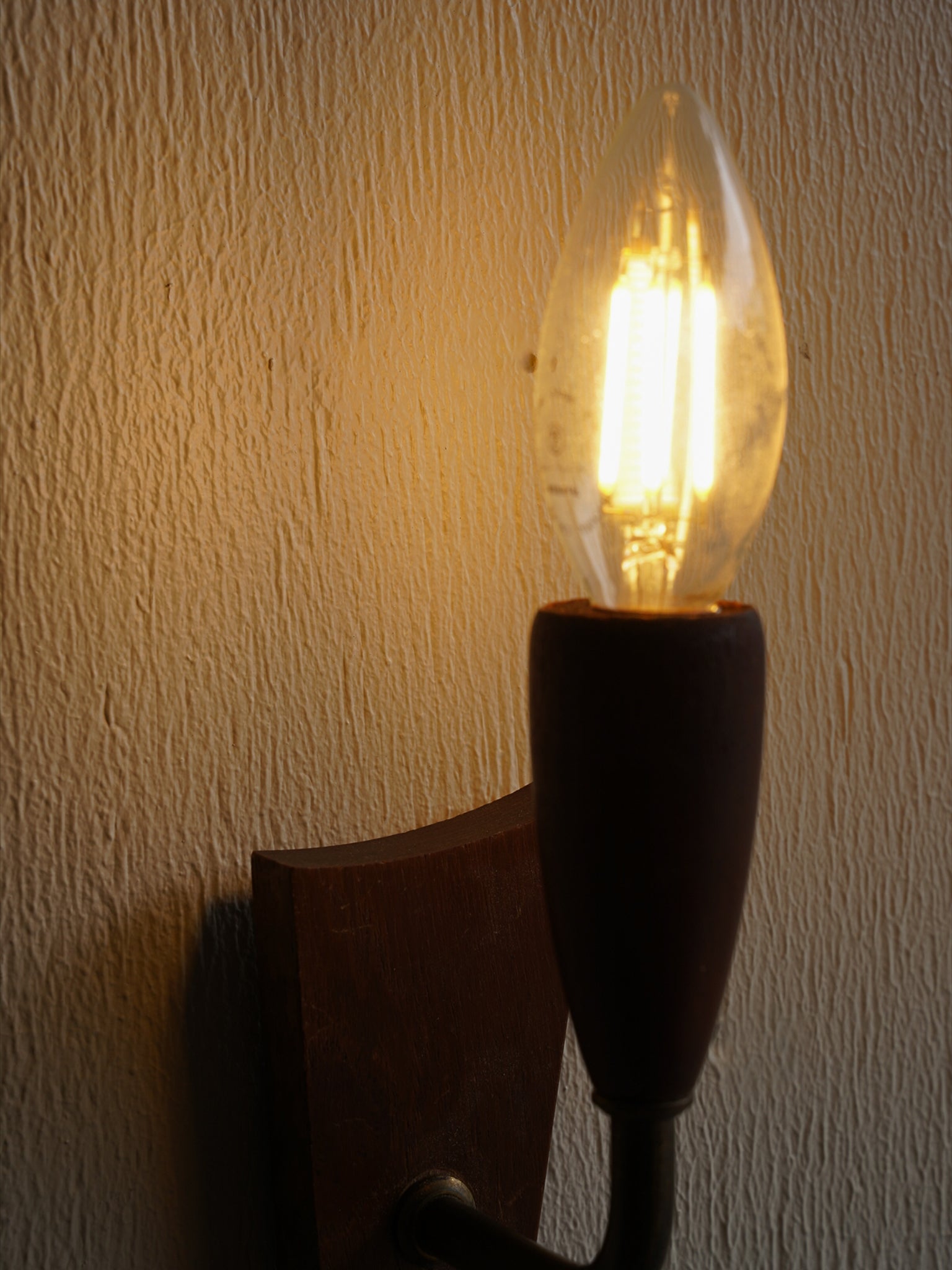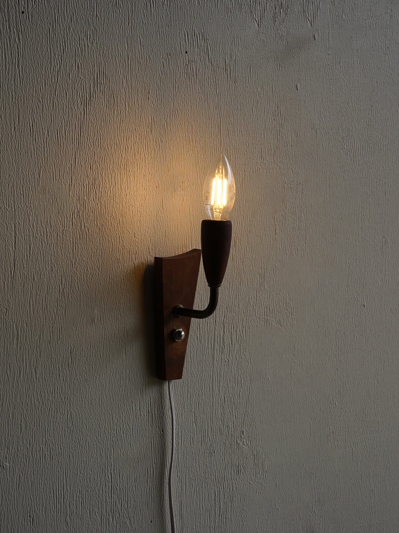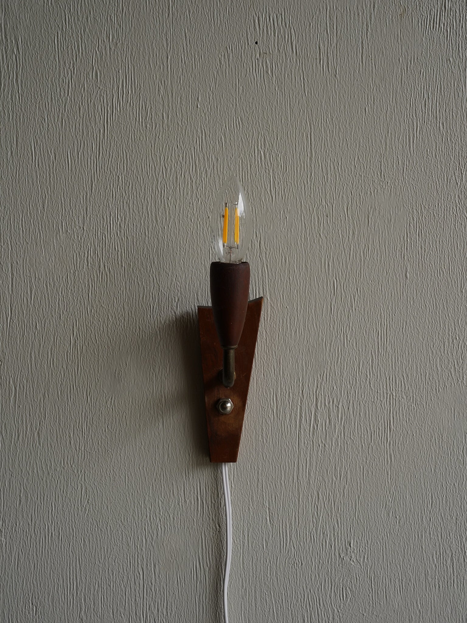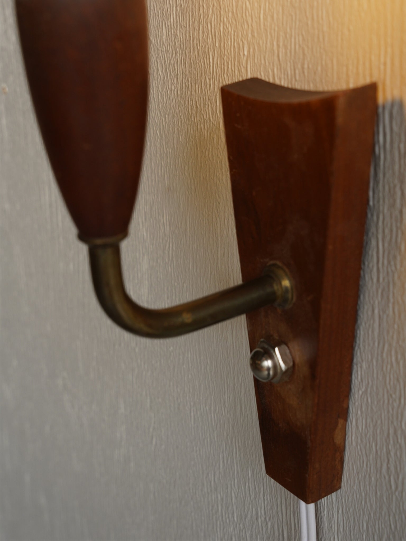 ベース部分は、温かみのある木目が美しいチーク材で、壁面に溶け込むようなミニマルな三角形状にカットされています。そこから伸びるアームは、真鍮製で、しなやかな曲線を描きながら上部のソケットへと繋がっています。
