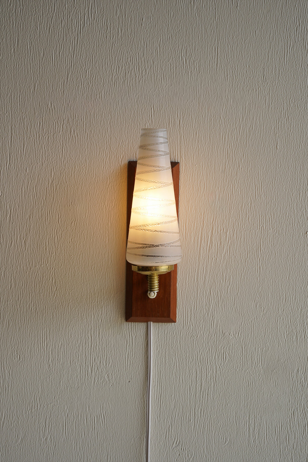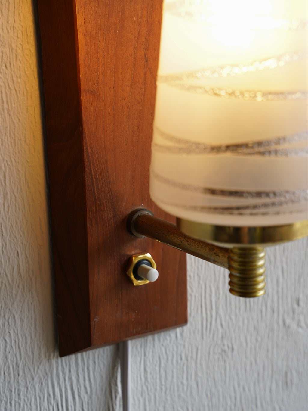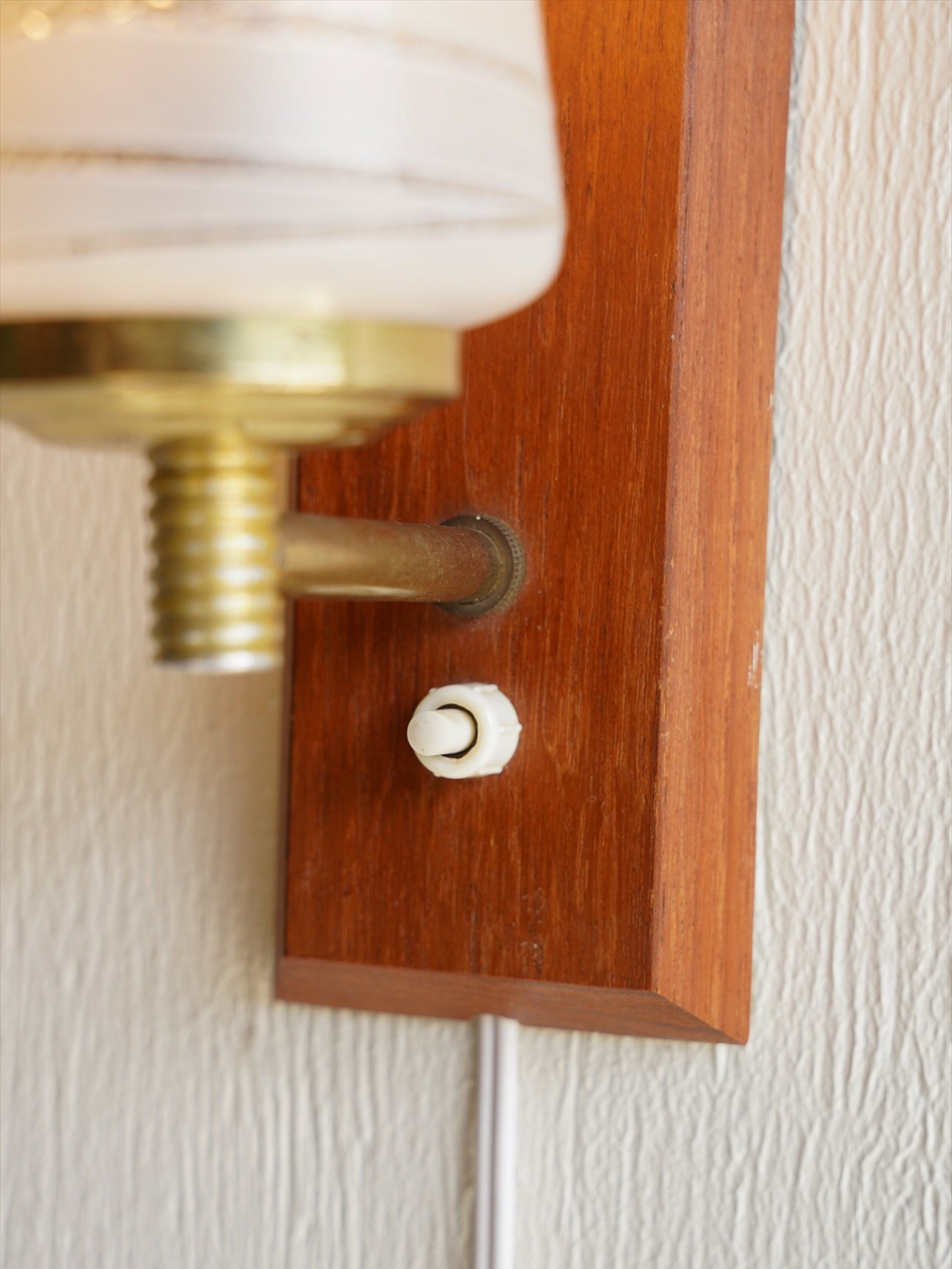ベースには、ミッドセンチュリーモダンを代表する素材であるチーク材が贅沢に使用されており、時を経て深みを増した木目と色合いが、壁面に温かいアクセントを加えます。アームの真鍮金具は、チーク材の赤褐色と上品なコントラストを生み出し、洗練された印象を与えます。