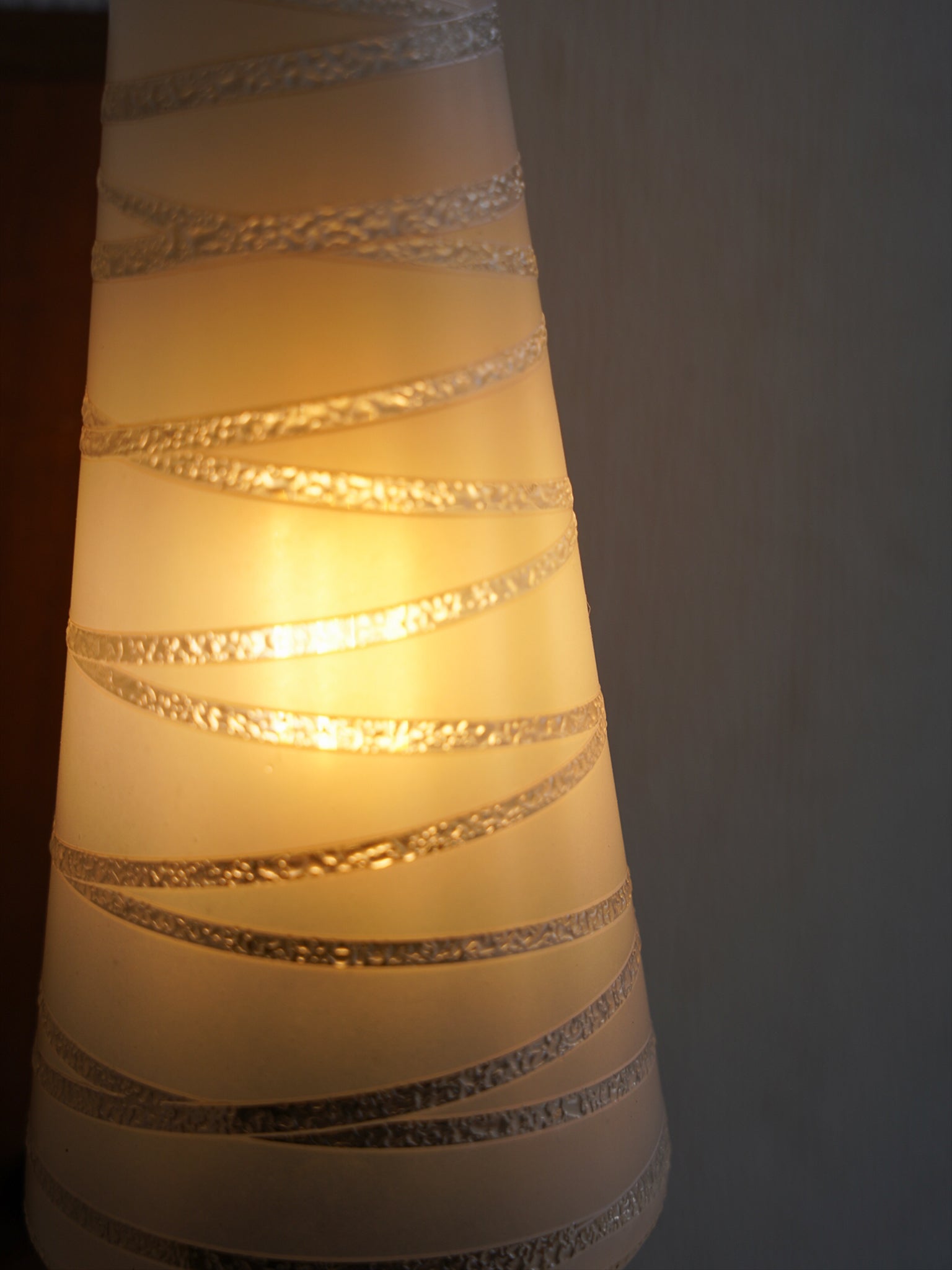 シェードは、柔らかな乳白色のガラスをベースに、まるで筆で描いたような白い螺旋状の模様が巻き付けられたアートガラス製です。点灯すると、光が模様を通して複雑に拡散され、壁面に幻想的で温かいムードを投影します。