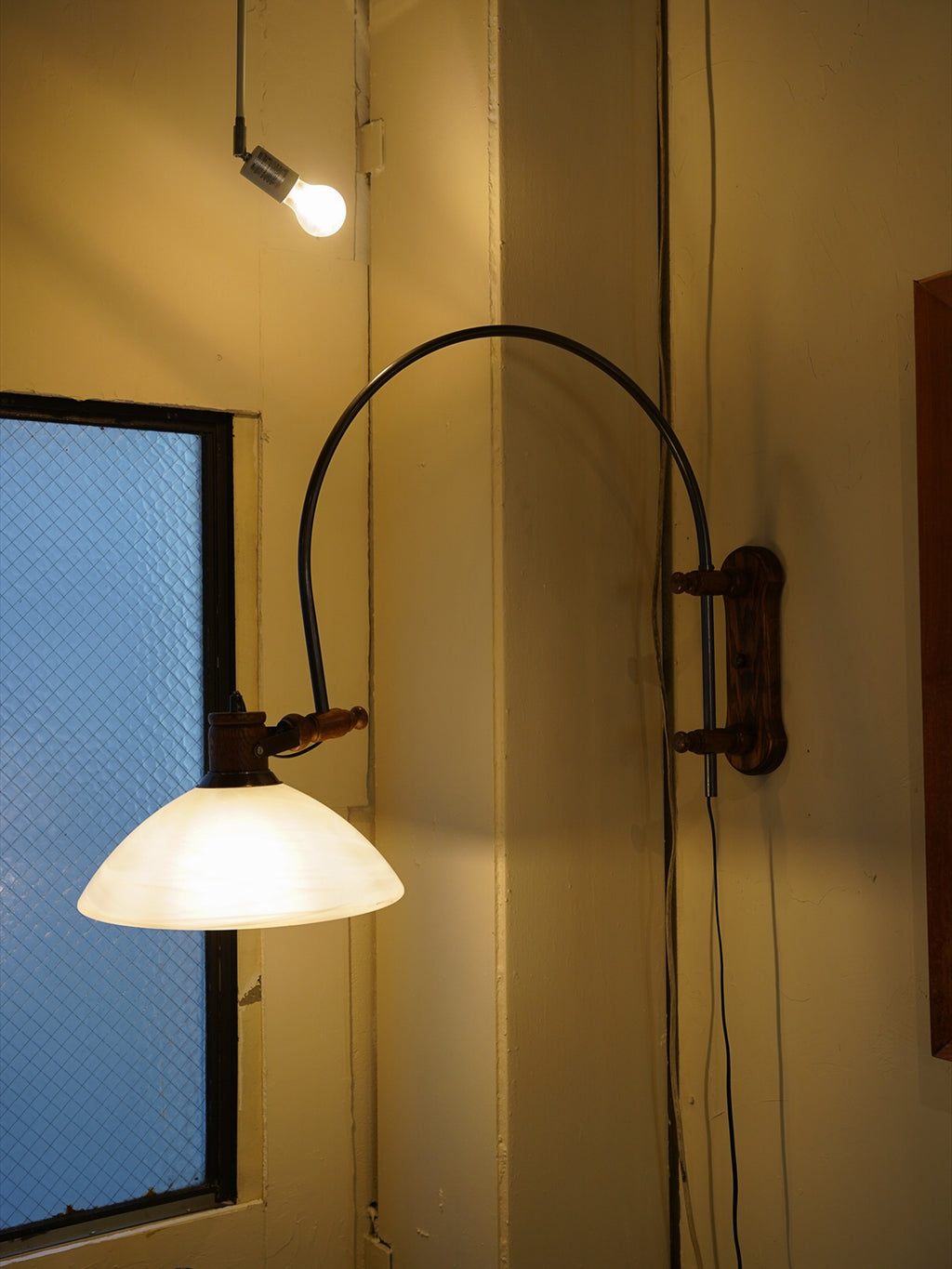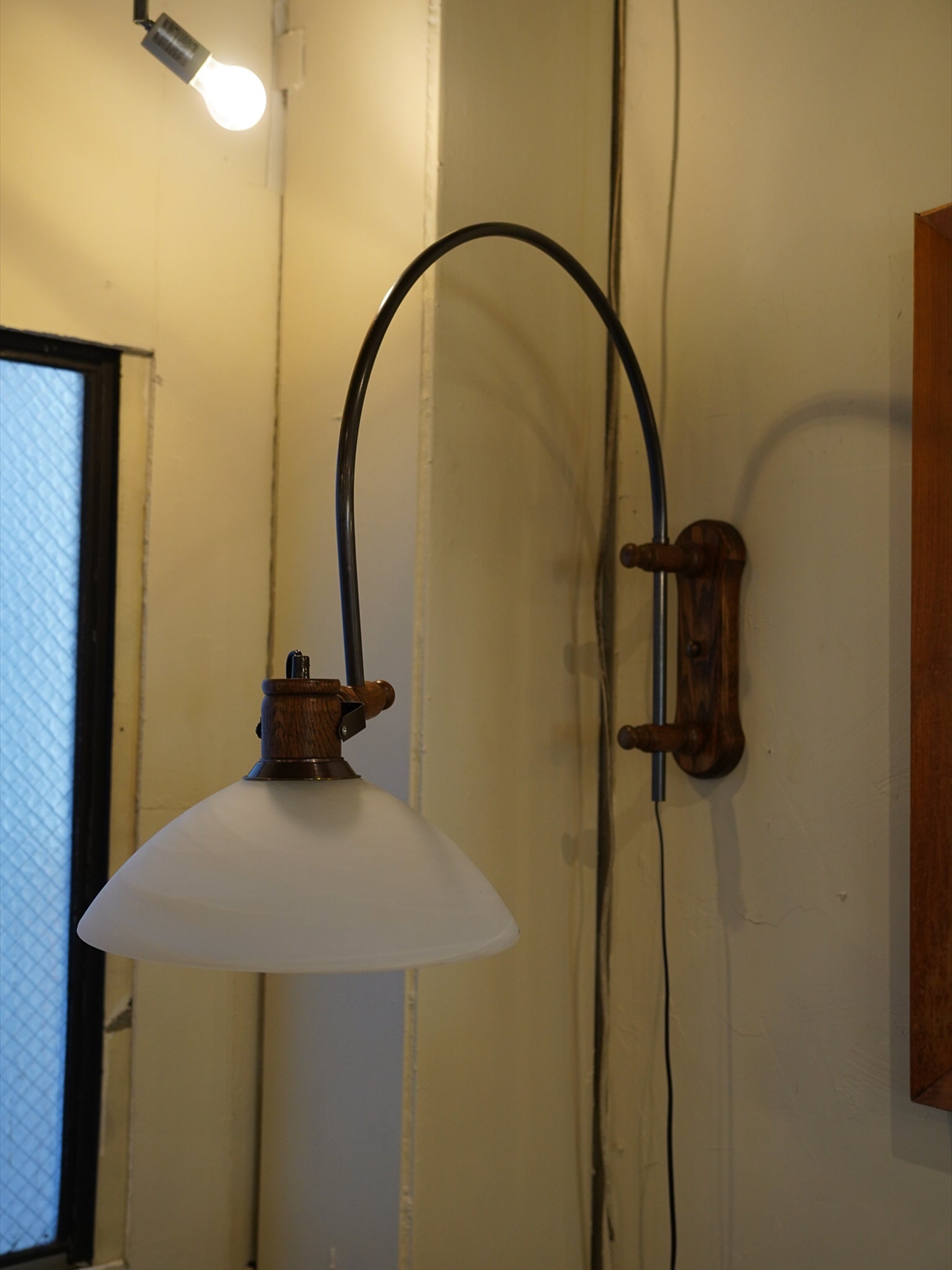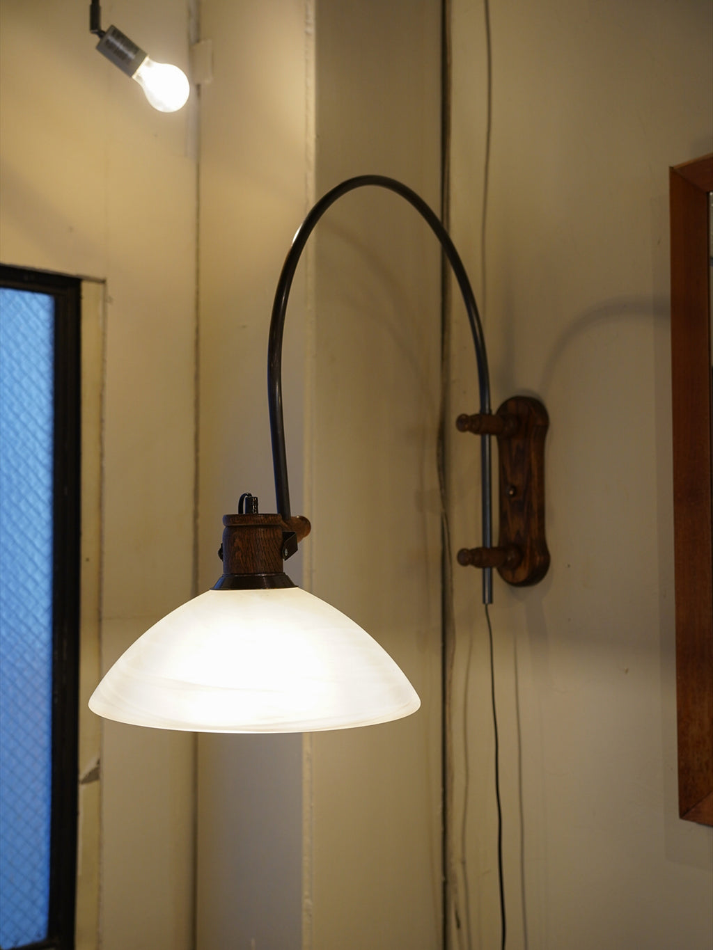 緩やかなカーブを描くダークカラーのアイアンアームと、温かみのある木製の壁掛けベースが、クラシックなデザインを際立たせています。乳白色のガラスシェードからは、周囲を優しく包み込むような、ふんわりとした光が広がります。