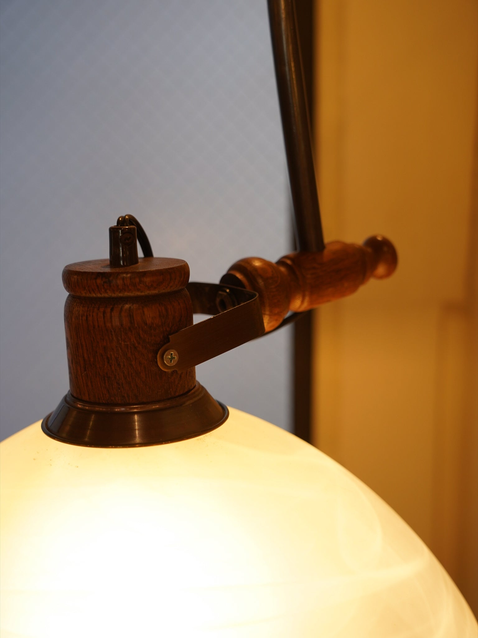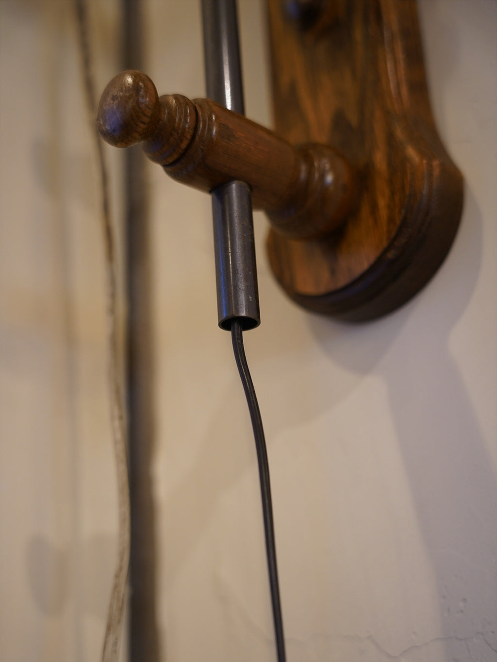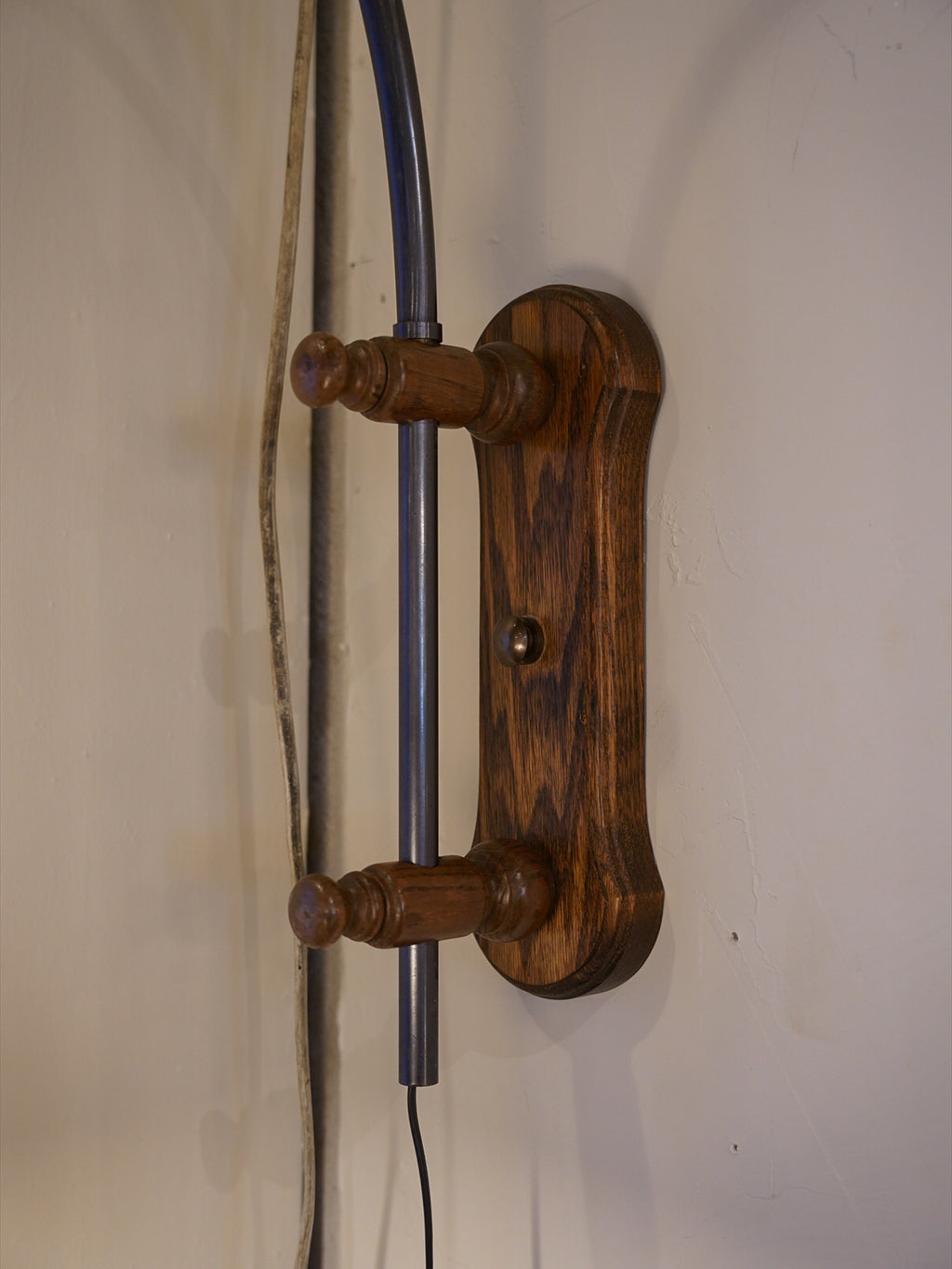 緩やかなカーブを描くダークカラーのアイアンアームと、温かみのある木製の壁掛けベースが、クラシックなデザインを際立たせています。乳白色のガラスシェードからは、周囲を優しく包み込むような、ふんわりとした光が広がります。