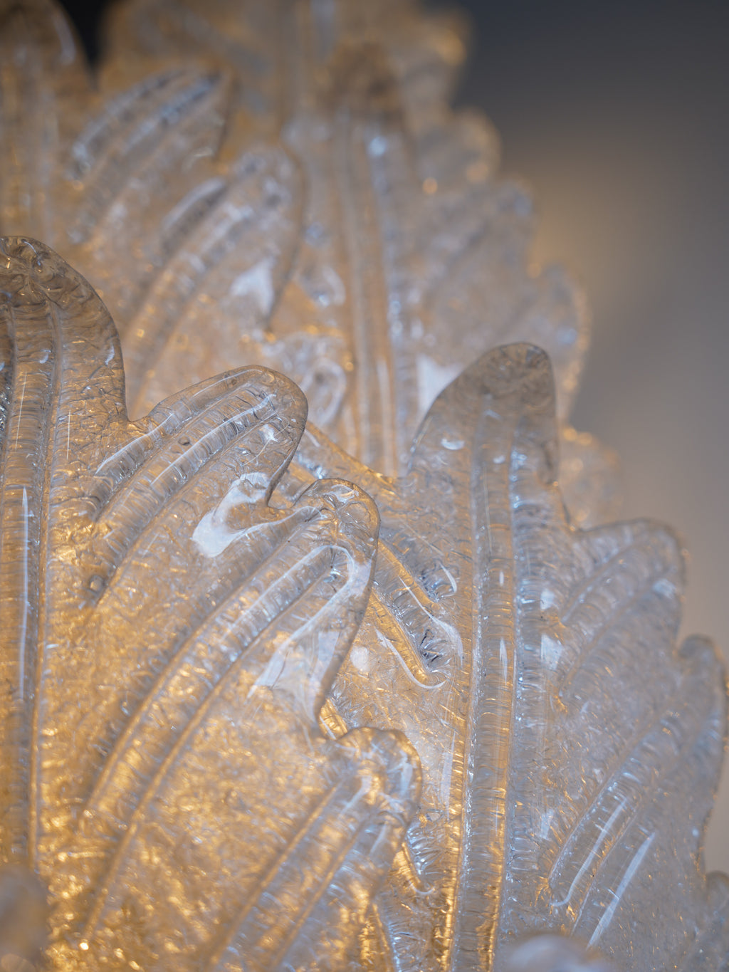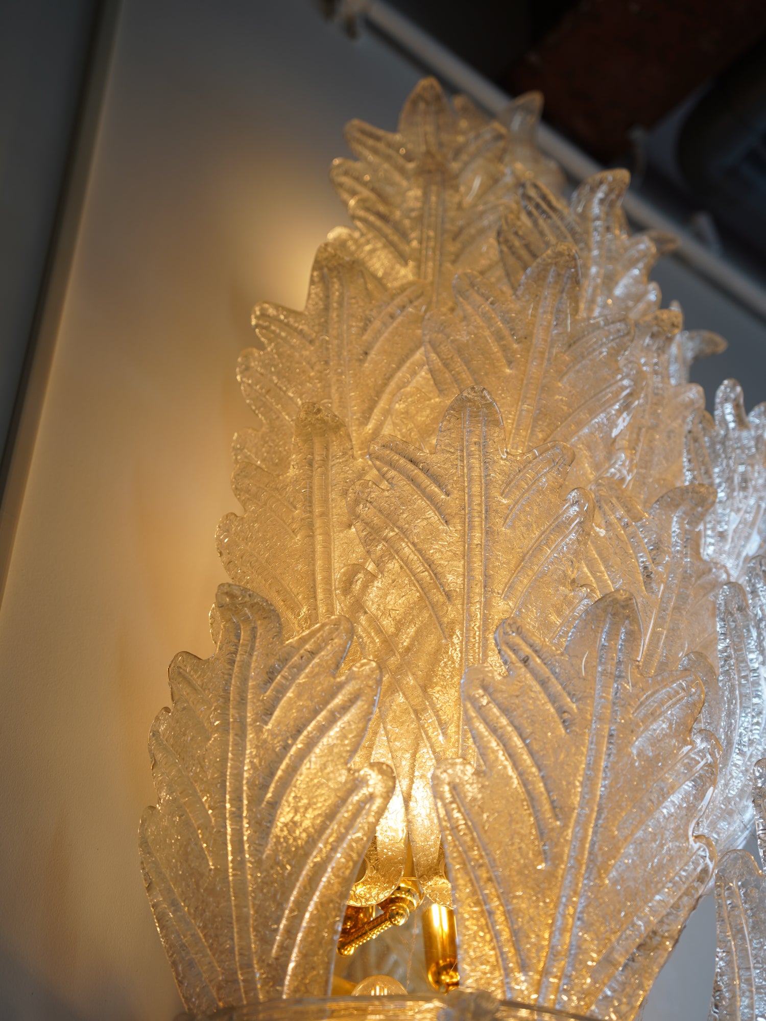 リーフモチーフが何層にも重ねられた、非常に豪華で立体的なデザインのガラスシェードはわずかにアンバーがかった色合いが見られ、光の反射を豊かにしています。