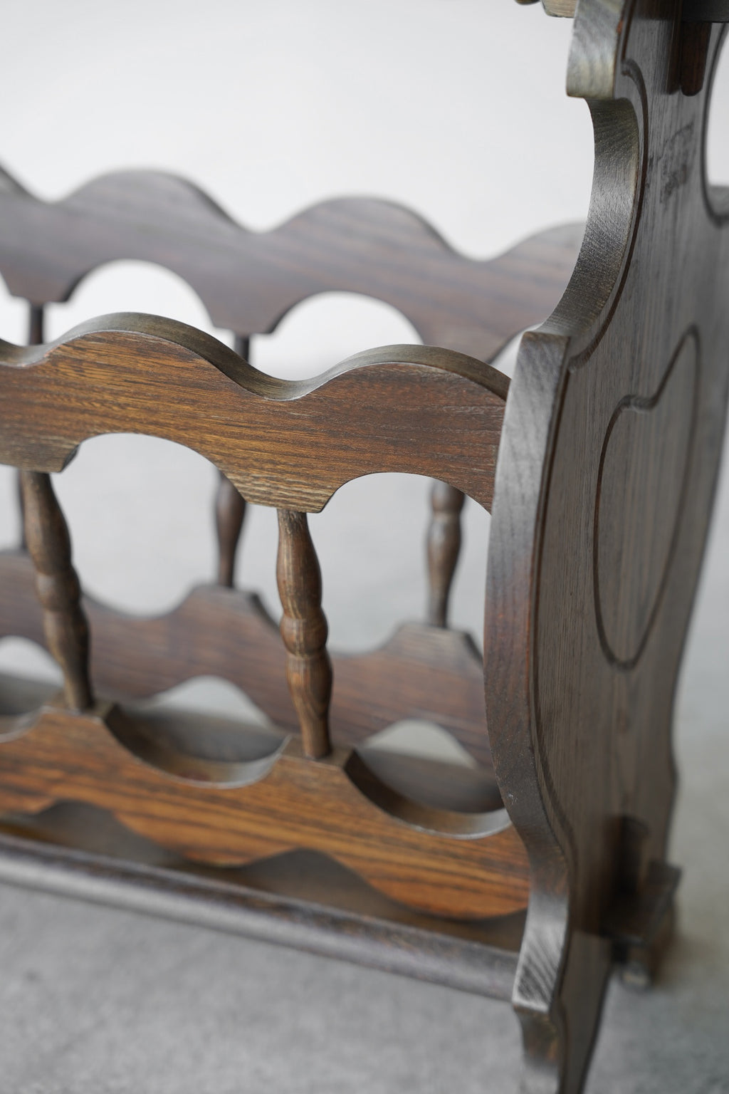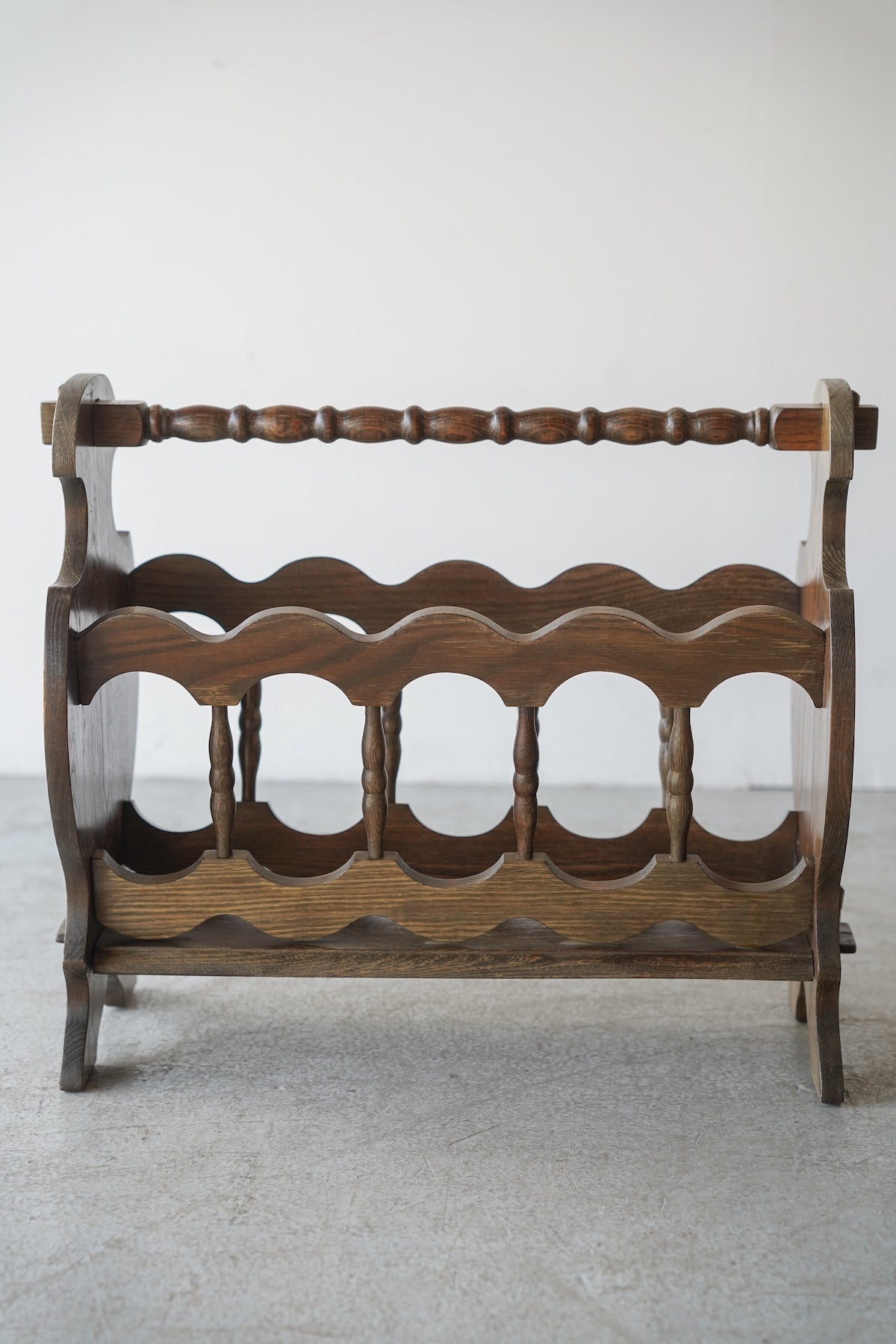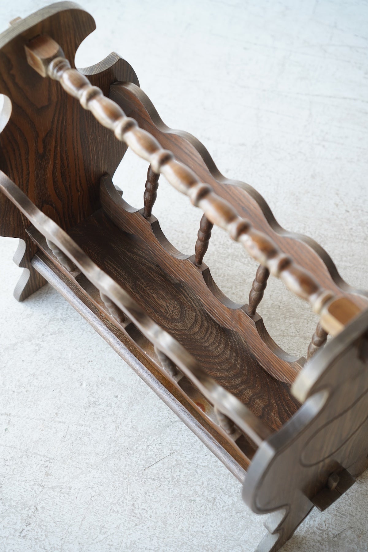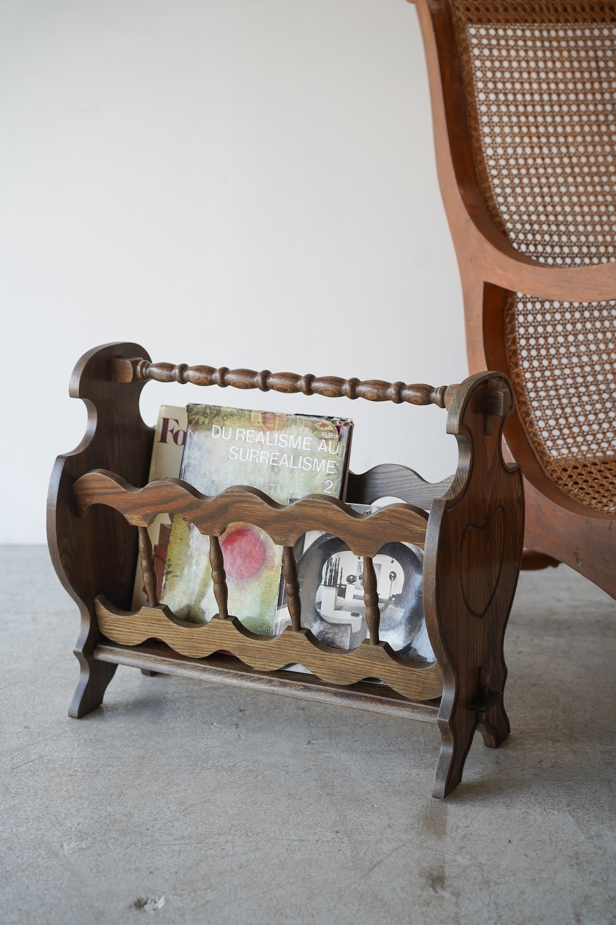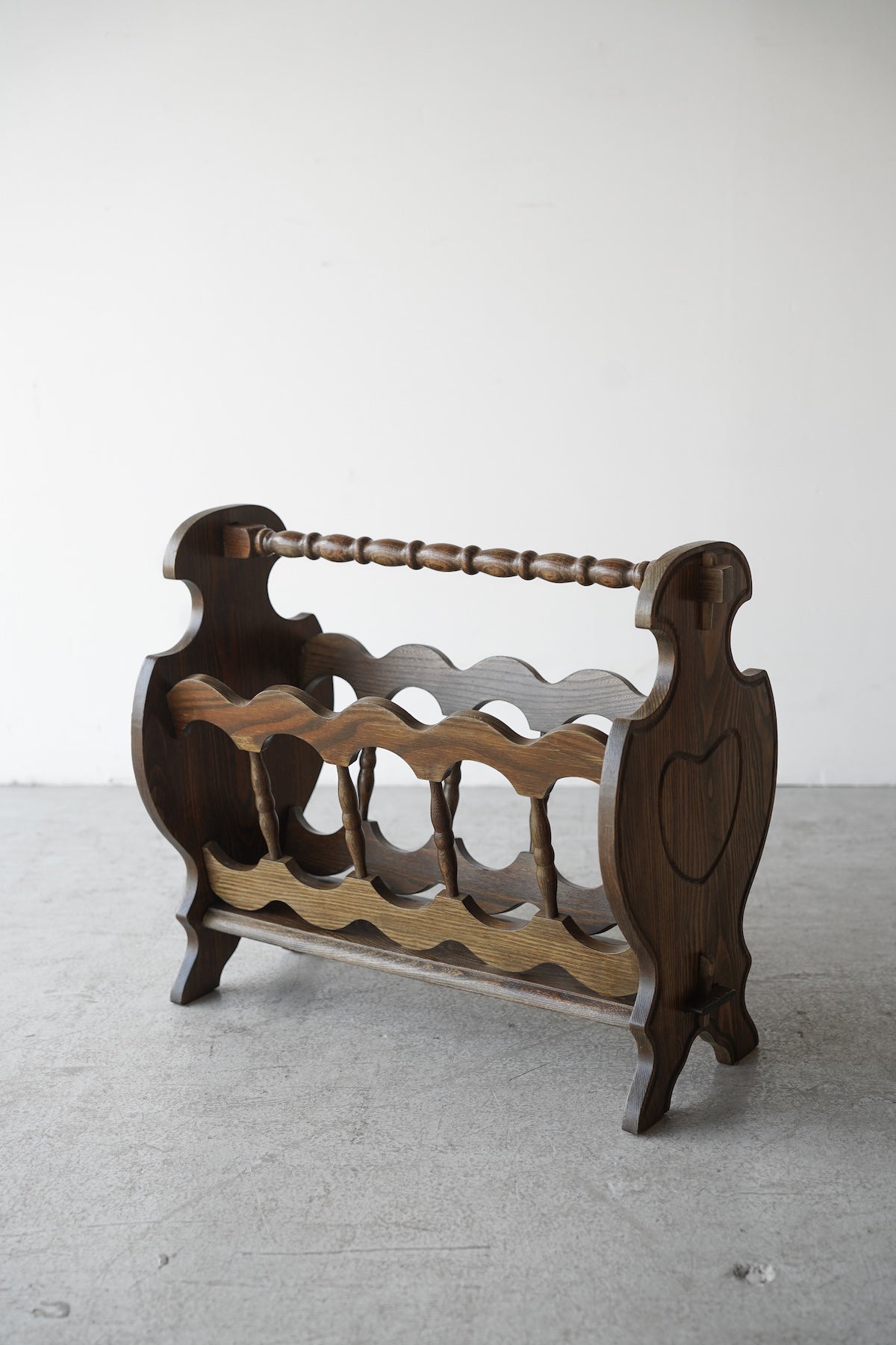 具体的な製造年代やメーカーは定かではありませんが、スイスやオーストリアなどアルプスの地方で多く見られた伝統的な民芸様式が美しい、ヴィンテージのマガジンラックです。温かみのある木肌と、遊び心あふれるデザインが魅力の一品です。