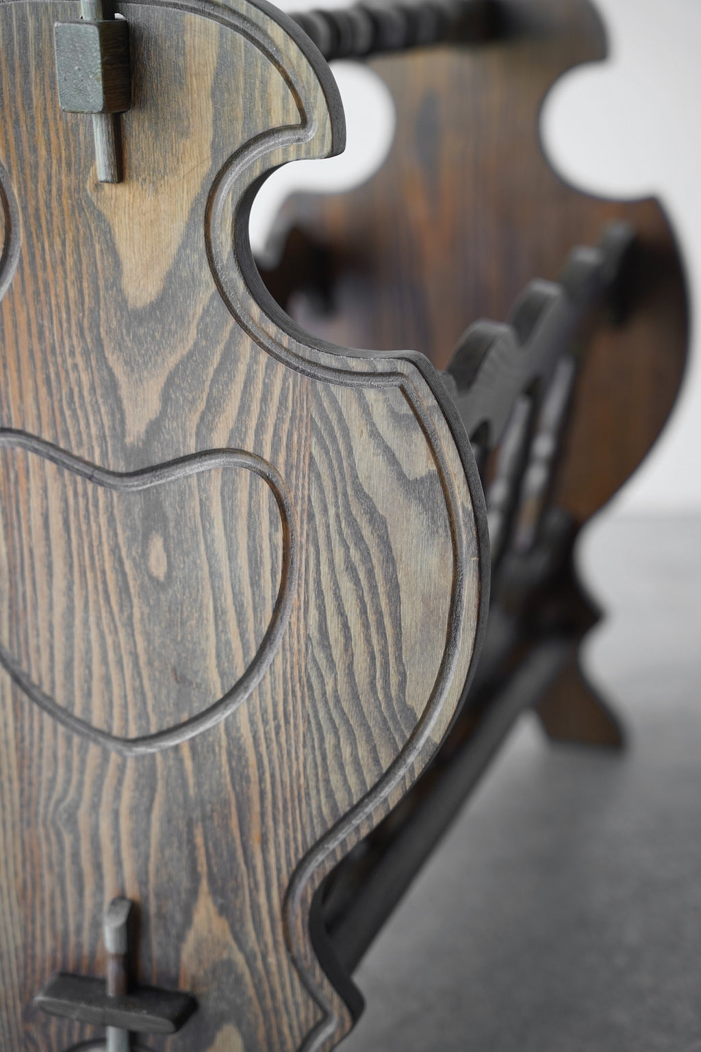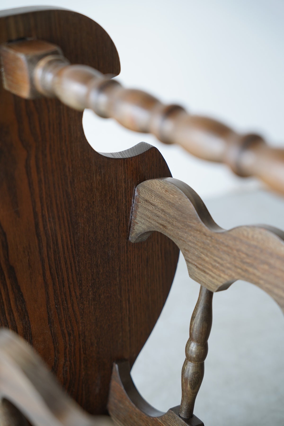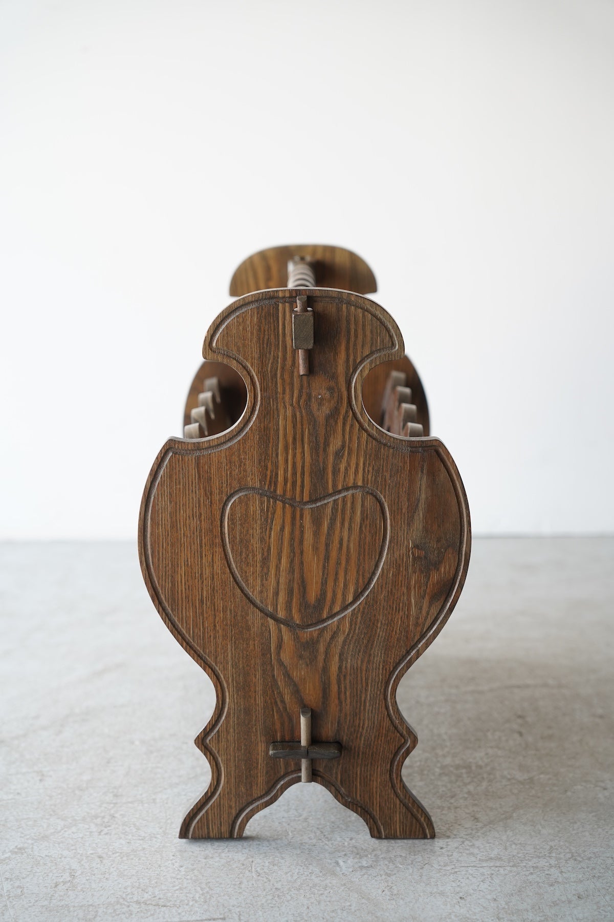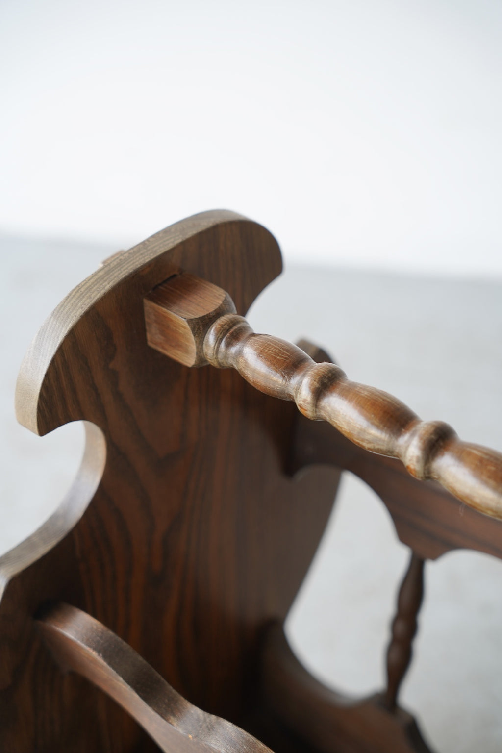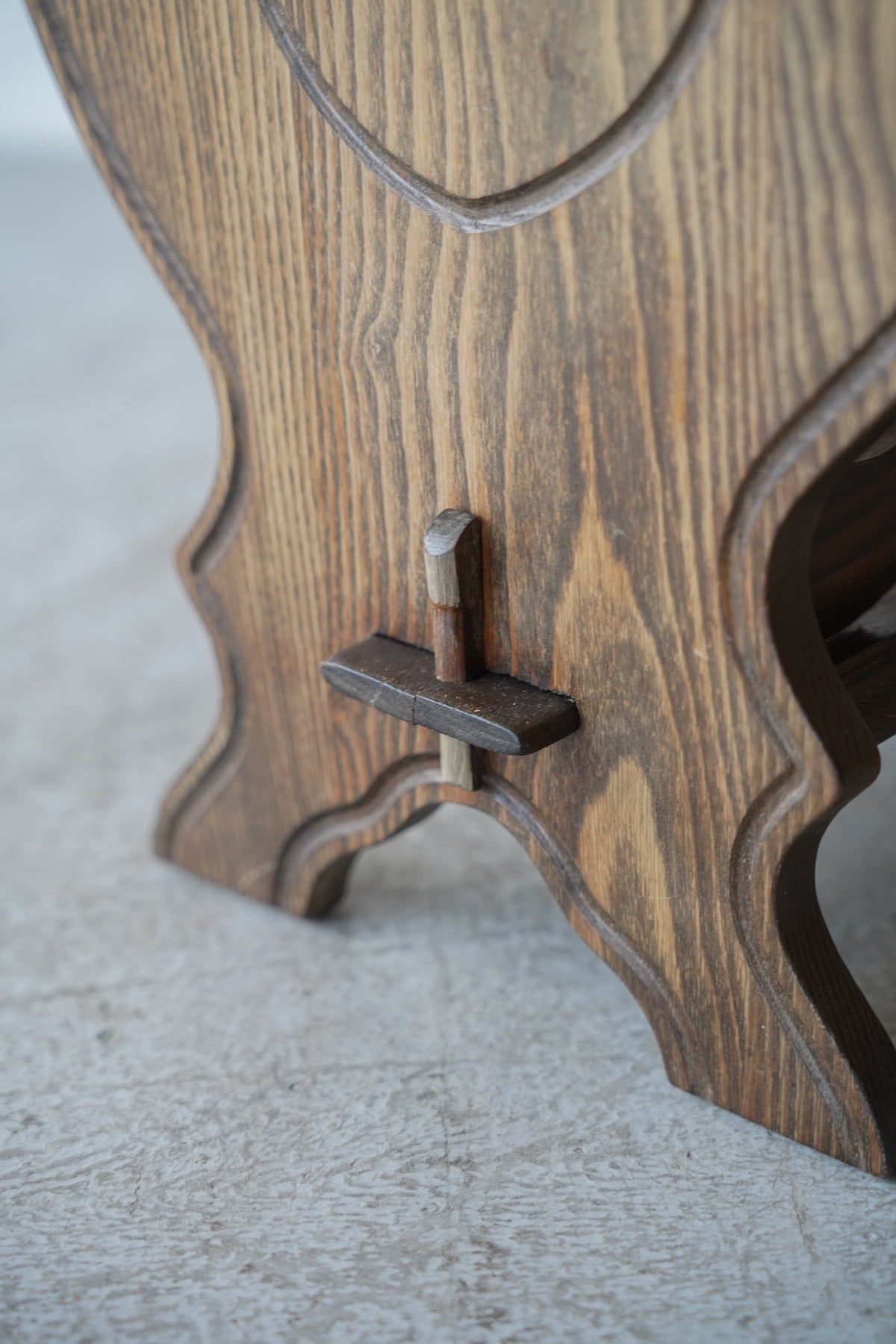 具体的な製造年代やメーカーは定かではありませんが、スイスやオーストリアなどアルプスの地方で多く見られた伝統的な民芸様式が美しい、ヴィンテージのマガジンラックです。温かみのある木肌と、遊び心あふれるデザインが魅力の一品です。