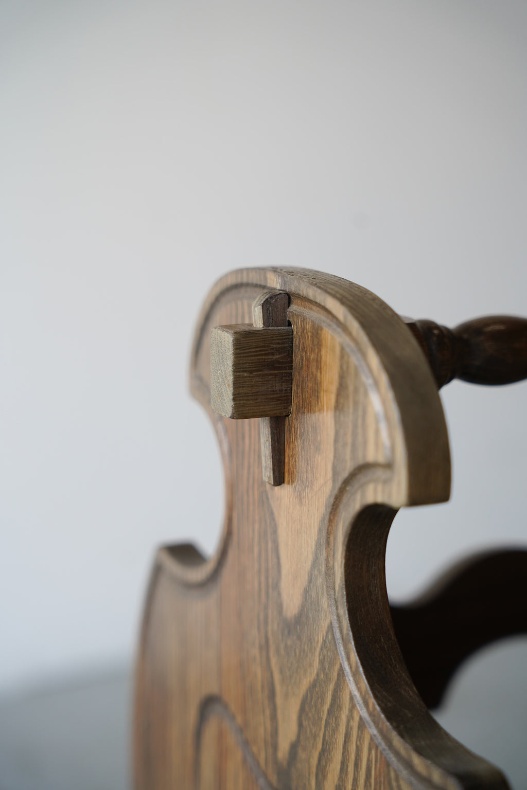 ダークブラウンに仕上げられた木材は、力強い木目と、長年の使用によって得られた深い古艶(パティーナ)が、ヴィンテージならではの豊かな表情を醸し出しています。