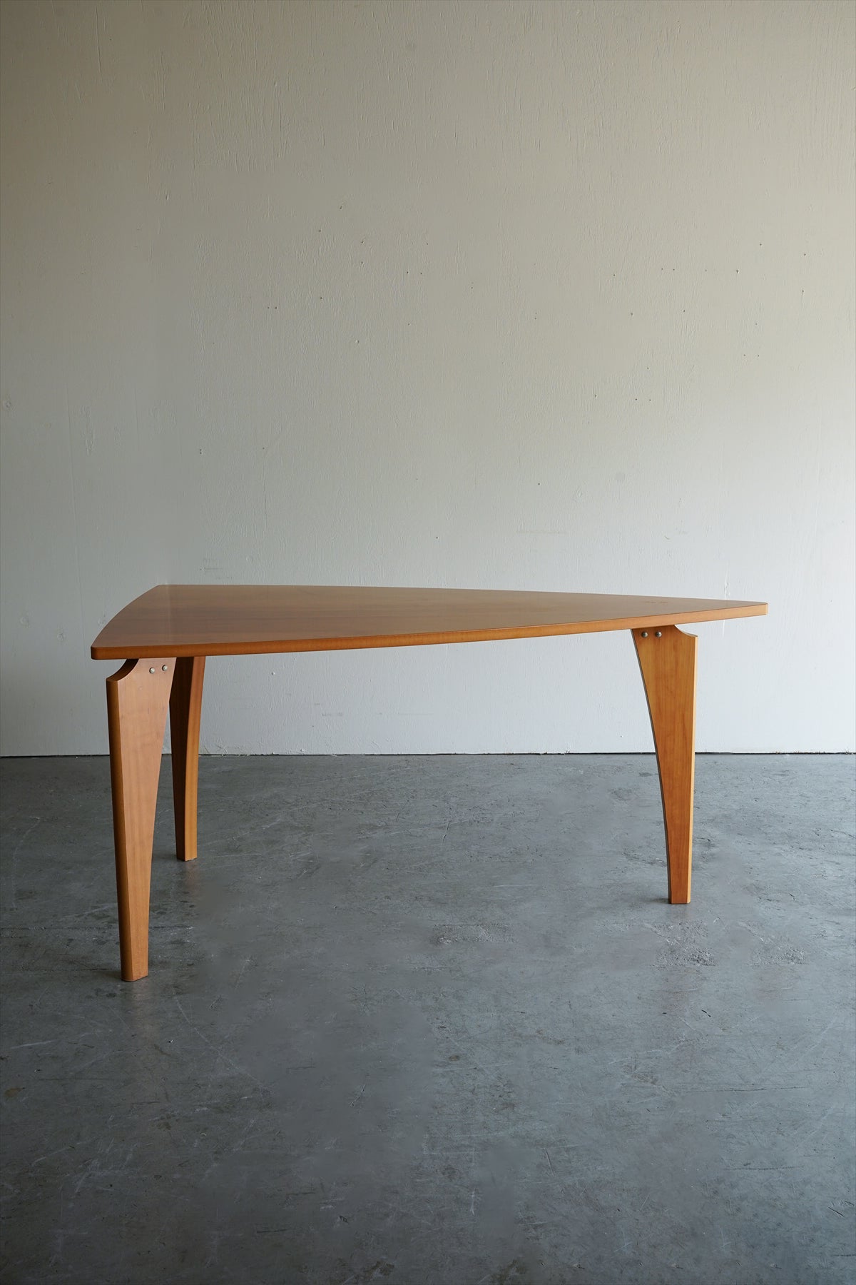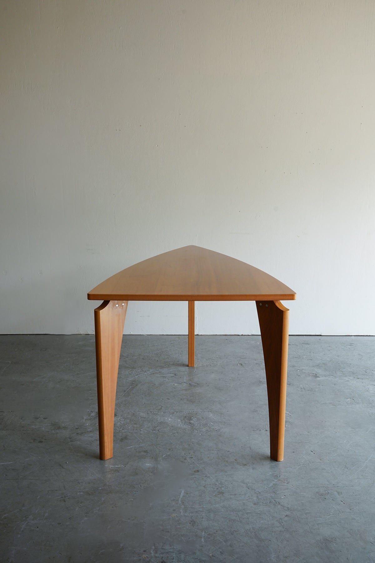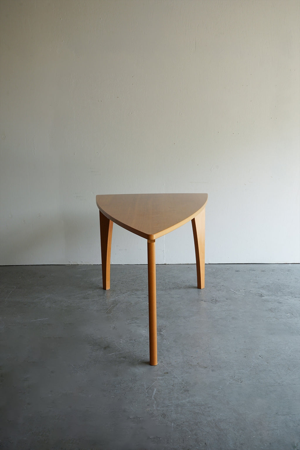 天板は、角が丸く削られた柔らかな三角形。3本の脚は見る角度によって表情を変える遊び心のあるデザインです。木材の滑らかな質感と温かい色合いが、モダンでありながらもどこか優しい雰囲気を醸し出しています。